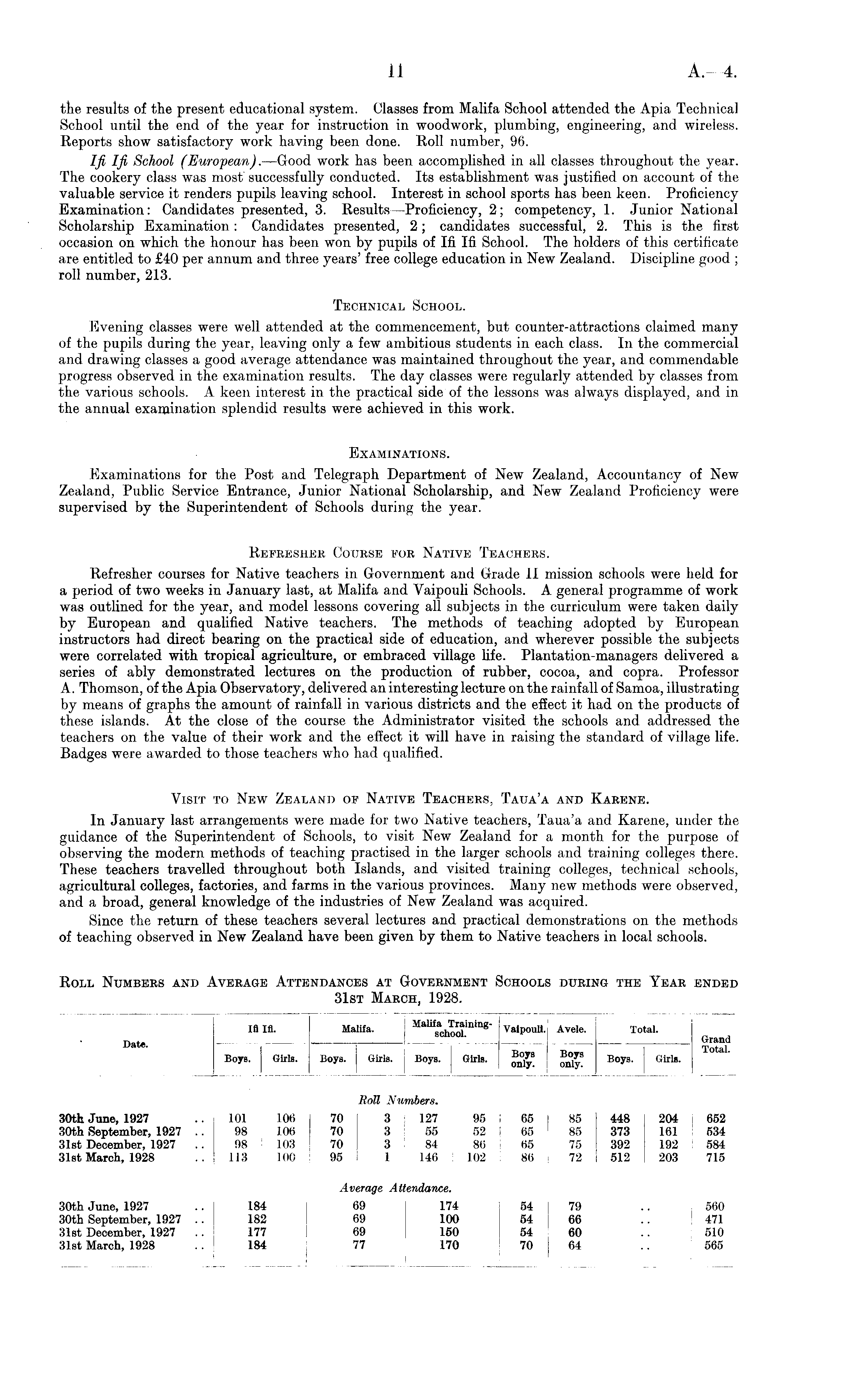 the results of the present educational system. Classes from Malifa School attended the Apia Technical School until the end of the year for instruction in woodwork, plumbing, engineering, and wireless. Reports show satisfactory work having been done. Roll number, 96. Ifi Ifi School (European).—Good work has been accomplished in all classes throughout the year. The cookery class was most' successfully conducted. Its establishment was justified on account of the valuable service it renders pupils leaving school. Interest in school sports has been keen. Proficiency Examination: Candidates presented, 3. Results—Proficiency, 2; competency, 1. Junior National Scholarship Examination: Candidates presented, 2; candidates successful, 2. This is the first occasion on which the honour has been won by pupils of Ifi Ifi School. The holders of this certificate are entitled to £40 per annum and three years' free college education in New Zealand. Discipline good ; roll number, 213. Technical School. Evening classes were well attended at the commencement, but counter-attractions claimed many of the pupils during the year, leaving only a few ambitious students in each class. In the commercial and drawing classes a good average attendance was maintained throughout the year, and commendable progress observed in the examination results. The day classes were regularly attended by classes from the various schools. A keen interest in the practical side of the lessons was always displayed, and in the annual examination splendid results were achieved in this work. Examinations. Examinations for the Post and Telegraph Department of New Zealand, Accountancy of New Zealand, Public Service Entrance, Junior National Scholarship, and New Zealand Proficiency were supervised by the Superintendent of Schools during the year. Refresher Course for Native Teachers. Refresher courses for Native teachers in Government and Grade II mission schools were held for a period of two weeks in January last, at Malifa and Yaipouli Schools. A general programme of work was outlined for the year, and model lessons covering all subjects in the curriculum were taken daily by European and qualified Native teachers. The methods of teaching adopted by European instructors had direct bearing on the practical side of education, and wherever possible the subjects were correlated with tropical agriculture, or embraced village life. Plantation-managers delivered a series of ably demonstrated lectures on the production of rubber, cocoa, and copra. Professor A. Thomson, of the Apia Observatory, delivered an interesting lecture on the rainfall of Samoa, illustrating by means of graphs the amount of rainfall in various districts and the effect it had on the products of these islands. At the close of the course the Administrator visited the schools and addressed the teachers on the value of their work and the effect it will have in raising the standard of village life. Badges were awarded to those teachers who had qualified. Visit to New Zealand of Native Teachers, Taua'a and Karene. In January last arrangements were made for two Native teachers, Taua'a and Karene, under the guidance of the Superintendent of Schools, to visit New Zealand for a month for the purpose of observing the modern methods of teaching practised in the larger schools and training colleges there. These teachers travelled throughout both Islands, and visited training colleges, technical schools, agricultural colleges, factories, and farms in the various provinces. Many new methods were observed, and a broad, general knowledge of the industries of New Zealand was acquired. Since the return of these teachers several lectures and practical demonstrations on the methods of teaching observed in New Zealand have been given by them to Native teachers in local schools.