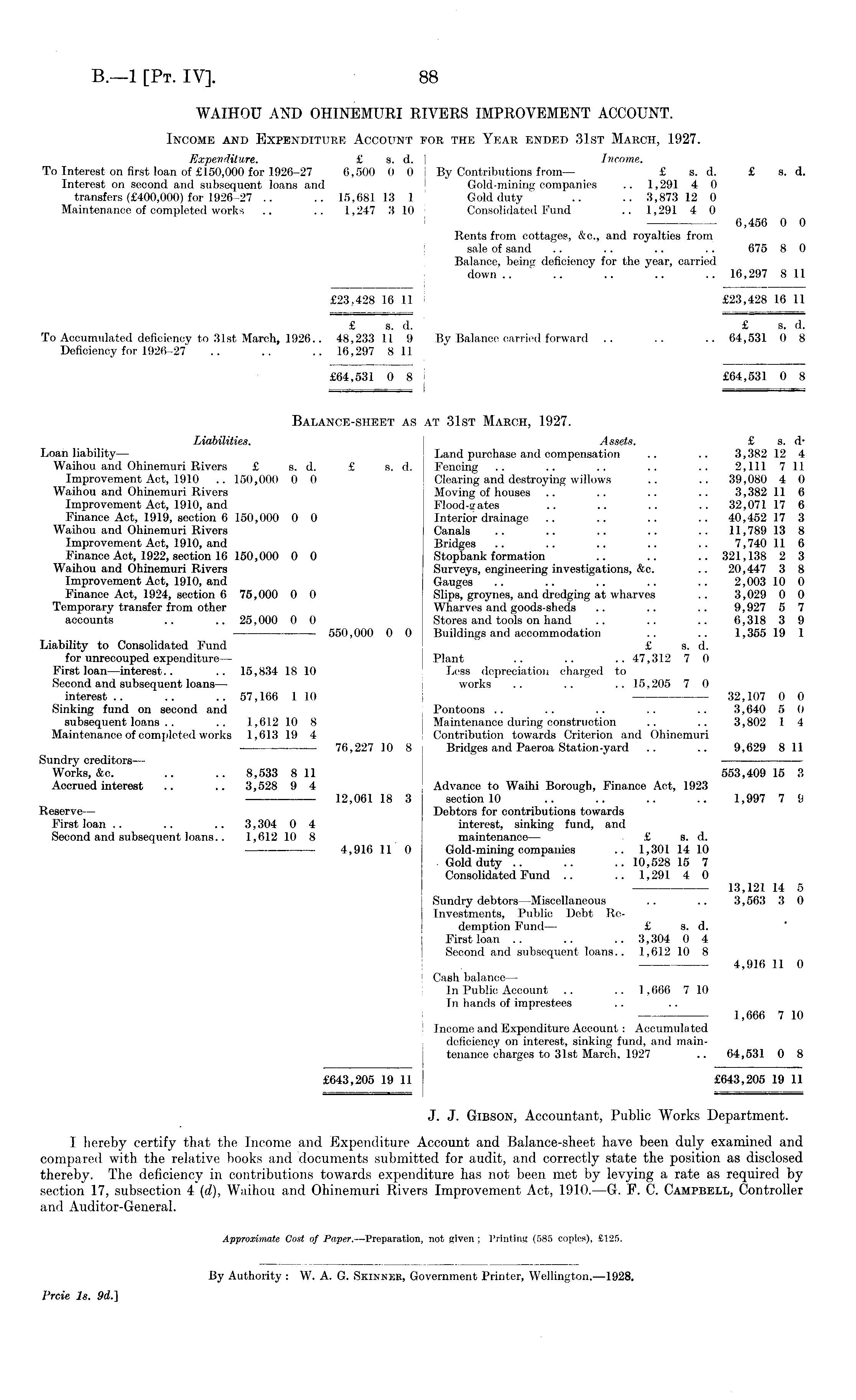 WAIHOU AND OHINEMURI RIVERS IMPROVEMENT ACCOUNT. Income and Expenditure Account foe the Year ended 31st March, 1927. Expenditure. £ s. d. Income. To Interest on first loan of £150,000 for 1926-27 6,500 0 0 By Contributions from— £ s. d. £ s. d. Interest on second and subsequent loans and Gold-mining companies .. 1,291 4 0 transfers (£400,000) for 1926-27 .. .. 15,681 13 1 Gold duty .. .. 3,873 12 0 Maintenance of completed works .. .. 1,247 310 Consolidated Fund .. 1,291 4 0 ■ 6,456 0 0 Rents from cottages, &e., and royalties from sale of sand .. .. .. .. 675 8 0 Balance, being deficiency for the year, carried down.. .. .. .. .. 16,297 8 11 £23,428 16 11 £23,428 16 11 £ s. d. £ s. d. To Accumulated deficiency to 31st March, 1926.. 48,233 11 9 By Balance carried forward .. .. .. 64,531 0 8 Deficiency for 1926-27 .. .. .. 16,297 8 11 £64,531 0 8 £64,531 0 8 Balance-sheet as at 31st March, 1927. Liabilities. Assets. £ s. dLoan liability—• Land purchase and compensation .. .. 3,382 12 4 Waihou and Ohinemuri Rivers £ s. d. £ s. d. Fencing .. .. .. .. .. 2,111 711 Improvement Act, 1910 .. 150,000 0 0 Clearing and destroying willows .. .. 39,080 4 0 Waihou and Ohinemuri Rivers Moving of houses .. .. .. .. 3,382 11 6 Improvement Act, 1910, and Flood-sates .. .. .. .. 32,071 17 6 Finance Act, 1919, section 6 150,000 0 0 Interior drainage .. .. .. .. 40,452 17 3 Waihou and Ohinemuri Rivers Canals .. .. .. .. .. 11,789 13 8 Improvement Act, 1910, and Bridges .. .. .. .. .. 7,740 11 6 Finance Act, 1922, section 16 150,000 0 0 Stopbank formation .. .. .. 321,138 2 3 Waihou and Ohinemuri Rivers Surveys, engineering investigations, &c. .. 20,447 3 8 Improvement Act, 1910, and Gauges .. .. .. .. .. 2,003 10 0 Finance Act, 1924, section 6 75,000 0 0 Slips, groynes, and dredging at wharves .. 3,029 0 0 Temporary transfer from other Wharves and goods-sheds .. .. .. 9,927 5 7 accounts .. .. 25,000 0 0 Stores and tools on hand .. .. .. 6,318 3 9 550,000 0 0 Buildings and accommodation .. .. 1,355 19 1 Liability to Consolidated Fund £ s. d. for unrecouped expenditure— Plant .. .. ..47,312 7 0 First loan—interest.. .. 15,834 18 10 Less depreciation charged to Second and subsequent loans — works .. .. .. 15,205 7 0 interest.. .. .. 57,166 1 10 32,107 0 0 Sinking fund on second and Pontoons .. .. .. .. .. 3,640 5 0 subsequent loans .. .. 1,612 10 8 Maintenance during construction .. .. 3,802 1 4 Maintenance of completed works 1,613 19 4 Contribution towards Criterion and Ohinemuri 76,227 10 8 Bridges and Paeroa Station-yard .. .. 9,629 8 11 Sundry creditors — Works, &c. .. .. 8,533 8 11 553,409 15 3 Accrued interest .. .. 3,528 9 4 Advance to Waihi Borough, Finance Act, 1923 12,061 18 3 section 10 .. .. .. .. 1,997 7 9 Reserve—• Debtors for contributions towards First loan .. .. .. 3,304 0 4 interest, sinking fund, and Second and subsequent loans.. 1,612 10 8 maintenance — £ s. d. 4,916 11 0 Gold-mining companies .. 1,301 14 10 Gold duty .. .. .. 10,528 15 7 Consolidated Fund .. .. 1,291 4 0 13,121 14 5 Sundry debtors—Miscellaneous .. .. 3,563 3 0 Investments, Public Debt Redemption Fund— £ s. d. First loan .. .. 3,304 0 4 Second and subsequent loans.. 1,612 10 8 4,916 11 0 Cash balance — In Public Account .. .. 1 ,666 7 10 In hands of imprestees — 1,666 7 10 Income and Expenditure Account: Accumulated deficiency on interest, sinking fund, and maintenance charges to 31st March, 1927 .. 64,531 0 8 £643,205 19 11 £643,205 19 11 J. J. Gibson, Accountant, Public Works Department. I hereby certify that the Income and Expenditure Account and Balance-sheet have been duly examined and compared with the relative books and documents submitted for audit, and correctly state the position as disclosed thereby. The deficiency in contributions towards expenditure has not been met by levying a rate as required by section 17, subsection 4 (d), Waihou and Ohinemuri Rivers Improvement Act, 1910. —G. F. C. Campbell, Controller and Auditor-General.