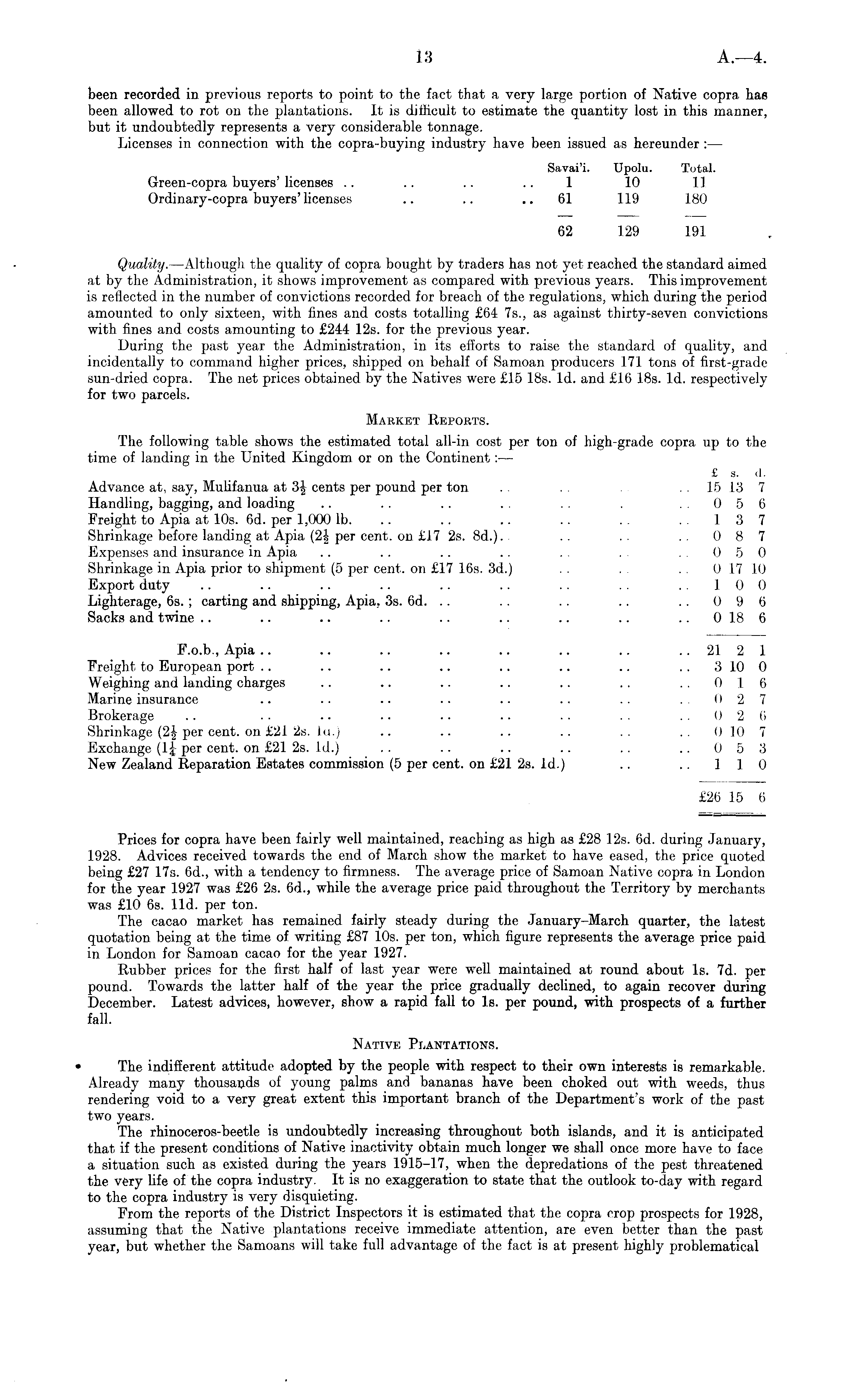been recorded in previous reports to point to the fact that a very large portion of Native copra has been allowed to rot on the plantations. It is difficult to estimate the quantity lost in this manner, but it undoubtedly represents a very considerable tonnage. Licenses in connection with the copra-buying industry have been issued as hereunder Savai'i. Upolu. Total. Green-copra buyers' licenses .. .. .. .. 1 10 11 Ordinary-copra buyers'licenses .. .. .. 61 119 180 62 129 191 Quality. —Although the quality of copra bought by traders has not yet reached the standard aimed at by the Administration, it shows improvement as compared with previous years. This improvement is reflected in the number of convictions recorded for breach of the regulations, which during the period amounted to only sixteen, with fines and costs totalling £64 75., as against thirty-seven convictions with fines and costs amounting to £244 12s. for the previous year. During the past year the Administration, in its efforts to raise the standard of quality, and incidentally to command higher prices, shipped on behalf of Samoan producers 171 tons of first-grade sun-dried copra. The net prices obtained by the Natives were £15 18s. Id. and £16 18s. Id. respectively for two parcels. Market Reports. The following table shows the estimated total all-in cost per ton of high-grade copra up to the time of landing in the United Kingdom or on the Continent: — £ s. d. Advance at, say, Mulifanua at 3J cents per pound per ton . . 15 13 7 Handling, bagging, and loading .. .. .. .. .. . . 056 Freight to Apia at 10s. 6d. per 1,000 lb. .. .. .. .. . . .13 7 Shrinkage before landing at Apia (2§ per cent, on £17 2s. Bd.). .. .. . . 0 8 7 Expenses and insurance in Apia .. .. .. .. .. . , ..050 Shrinkage in Apia prior to shipment (5 per cent, on £17 16s. 3d.) .. . . . 017 10 Export duty .. .. .. .. .. .. .100 Lighterage, 65.; carting and shipping, Apia, 3s. 6d. .. .. .. .. .. 0 9 6 Sacks and twine .. .. .. .. .. .. .. .. 0 18 6 F.0.b., Apia .. .. .. .. .. .. .. .. 21 2 1 Freight to European port .. .. .. .. .. .. .. 3 10 0 Weighing and landing charges .. .. .. .. .. .. ..016 Marine insurance .. .. .. .. .. .. .. ..027 Brokerage .. .. .. .. .. .. .. .. ..026 Shrinkage (2J per cent, on £21 2s. la.) .. .. .. .. .. 0 10 7 Exchange (1£ per cent, on £21 2s. Id.) .. .. .. .. .. ..053 New Zealand Reparation Estates commission (5 per cent, on £21 2s. Id.) .. .. 110 £26 15 6 Prices for copra have been fairly well maintained, reaching as high as £28 12s. 6d. during January, 1928. Advices received towards the end of March show the market to have eased, the price quoted being £27 17s. 6d., with a tendency to firmness. The average price of Samoan Native copra in London for the year 1927 was £26 2s. 6d., while the average price paid throughout the Territory by merchants was £10 6s. lid. per ton. The cacao market has remained fairly steady during the January-March quarter, the latest quotation being at the time of writing £87 10s. per ton, which figure represents the average price paid in London for Samoan cacao for the year 1927. Rubber prices for the first half of last year were well maintained at round about Is. 7d. per pound. Towards the latter half of the year the price gradually declined, to again recover during December. Latest advices, however, show a rapid fall to Is. per pound, with prospects of a further fall. Native Plantations. The indifferent attitude adopted by the people with respect to their own interests is remarkable. Already many thousaijds of young palms and bananas have been choked out with weeds, thus rendering void to a very great extent this important branch of the Department's work of the past two years. The rhinoceros-beetle is undoubtedly increasing throughout both islands, and it is anticipated that if the present conditions of Native inactivity obtain much longer we shall once more have to face a situation such as existed during the years 1915-17, when the depredations of the pest threatened the very life of the copra industry. It is no exaggeration to state that the outlook to-day with regard to the copra industry is very disquieting. From the reports of the District Inspectors it is estimated that the copra crop prospects for 1928, assuming that the Native plantations receive immediate attention, are even better than the past year, but whether the Samoans will take full advantage of the fact is at present highly problematical