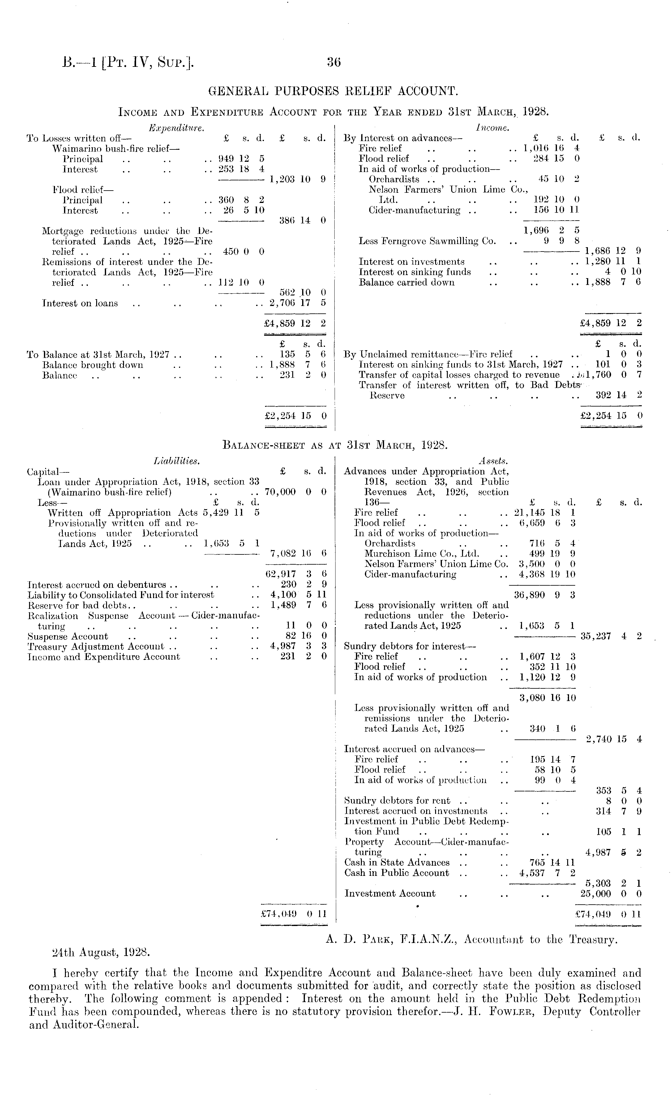 GENERAL PURPOSES RELIEF ACCOUNT. Income and Expenditure Account foe the Year ended 31st March, 1928. Expenditure. Income. To Losses written off — £ s. d. £ s. d. By Interest on advances — £ s. d. £ s. d. Waimarino bush-fire relief — Fire relief .. .. .. 1,016 16 4 Principal .. .. .. 949 12 5 Flood relief .. .. .. 284 15 0 Interest .. .. . . 253 18 4 In aid of works of production — 1,203 10 9 Orchardists .. .. .. 45 10 2 Flood relief— Nelson Farmers' Union Lime Co., Principal .. .. . . 360 8 2 Ltd. .. .. .. 192 10 0 Interest .. .. .. 26 510 Cider-manufacturing .. .. 156 10 11. 386 14 0 Mortgage reductions under the De- 1,696 2 5 teriorated Lands Act, 1925—Fire Less Ferngrove Sawmilling Co. 9 9 8 relief.. .. .. .. 450 0 0 1,686 12 9 Remissions of interest under the De- Interest on investments .. .. .. 1,280 11 I teriorated Lands Act, 1925 —Fire Interest on sinking funds .. .. .. 4 010 relief .. .. .. .. 112 10 0 Balance carried down .. .. .. 1,888 7 6 562 .10 0 Interest on loans .. .. .. .. 2,706 17 5 £4,859 12 2 £4,859 12 2 £ s. d. £ s. d. To Balance at 31st March, 1927 .. .. . . 135 5 6 By Unclaimed remittance—Fire relief .. .. 10 0 Balance brought down .. .. .. 1,888 7 6 Interest on sinking funds to 31st March, 1927 .. 101 0 3 Balance .. .. .. .. .. 231 2 0 Transfer of capital losses charged to revenue j Ju1,760 0 7 Transfer of interest written off, to Bad DebtsReserve .. .. .. .. 392 14 2 £2,254 15 0 £2,254 15 0 Balance-sheet as at 31st March, 1928. Liabilities. Assets. Capital— £ s. d. Advances under Appropriation Act, Loan under Appropriation Act, 1918, section 33 1918, section 33, and Public (Waimarino bush-fire relief) .. .. 70,000 0 0 Revenues Act, 1926, section Less— £ s. d. 136 — £ s. d. £ s. d. Written off Appropriation Acts 5,429 11 5 Fire relief .. .. .. 21,145 18 1 Provisionally written off and re- Flood relief .. .. .. 6,659 6 3 ductions under Deteriorated In aid of works of production— Lands Act, 1925 .. .. 1,653 5 1 Orchardists .. .. 716 5 4 7,082 16 6 Murchison Lime Co., Ltd. .. 499 19 9 Nelson Farmers' Union Lime Co. 3,500 0 0 62,917 3 6 Cider-manufacturing .. 4,368 19 10 Interest accrued on debentures .. .. .. 230 2 9 Liability to Consolidated Fund for interest .. 4,100 5 11 36,890 9 3 Reserve for bad debts.. .. .. 1,489 7 6 Less provisionally written off and Realization Suspense Account — Cider-manufac- reductions under the Deterioturing .. .. .. .. .. 1100 rated Lands Act, 1925 .. 1,653 5 I Suspense Account .. .. .. .. 82 16 0 35,237 4 2 Treasury Adjustment Account .. .. .. 4,987 3 3 Sundry debtors for interest— Income and Expenditure Account .. .. 231 2 0 Fire relief .. .. .. 1,607 12 3 Flood relief .. .. .. 352 11 10 In aid of works of production .. 1,120 12 9 j 3,080 16 10 Less provisionally written off and remissions under the Deteriorated Lands Act, 1925 .. 340 1 6 ■ 2,740 15 4 j Interest accrued on advances—Fire relief .. .. .. 195 14 7 Flood relief .. .. . . 58 10 5 In aid of works of production .. 99 0 4 353 5 4 Sundry debtors for rent .. .. .. 8 0 0 Interest accrued on investments .. .. 314 7 9 Investment in Public Debt Redemption Fund .. .. .. .. 105 1 1 Property Account—Cider-manufac-turing .. .. .. .. 4,987 5 2 Cash in State Advances .. .. 765 14 11 Cash in Public Account .. .. 4,537 7 2 5,303 2 I Investment Account .. .. .. 25,000 0 0 £74,049 0 11 ' £74,049 0 11 r A. D. Park, E.1.A.N.Z., Accountant to the Treasury. 24th August, 1928. I hereby certify that the Income and Expenditre Account and Balance-sheet have been duly examined and compared with the relative books and documents submitted for audit, and correctly state the position as disclosed thereby. The following comment is appended : Interest on the amount held in the Public Debt Redemption Fund has been compounded, whereas there is no statutory provision therefor.—J. H. Fowler, Deputy Controller and Auditor-General.