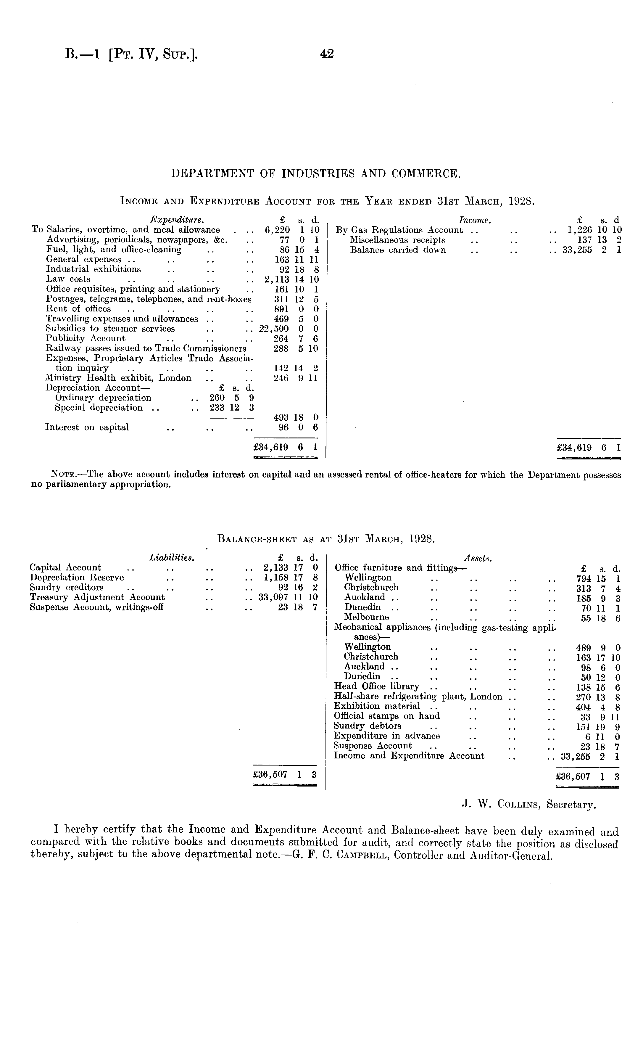 DEPARTMENT OF INDUSTRIES AND COMMERCE. Income and Expenditure Account for the Year ended 31st March, 1928. Expenditure. £ s. <1. Income. £ s. d To Salaries, overtime, and meal allowance . .. 6,220 110 By Gas Regulations Account .. .. .. 1,226 10 10 Advertising, periodicals, newspapers, &c. .. 77 0 1 Miscellaneous receipts .. .. .. 137 13 2 Fuel, light, and office-cleaning .. .. 86 15 4 Balance carried down .. .. .. 33,255 2 1 General expenses .. .. .. .. 163 11 11 Industrial exhibitions .. .. .. 92 18 8 Law costs .. .. .. .. 2,113 14 10 Office requisites, printing and stationery .. 161 10 1 Postages, telegrams, telephones, and rent-boxes 311 12 5 Rent of offices .. .. .. .. 891 0 0 Travelling expenses and allowances .. .. 469 5 0 Subsidies to steamer services .. .. 22,500 0 0 Publicity Account .. .. .. 264 7 6 Railway passes issued to Trade Commissioners 288 5 10 Expenses, Proprietary Articles Trade Association inquiry . . .. .. . . 142 14 2 Ministry Health exhibit, London .. .. 246 911 Depreciation Account—• £ s. d. Ordinary depreciation .. 260 5 9 Special depreciation .. .. 233 12 3 493 18 0 Interest on capital .. .. .. 96 0 6 £34,619 6 1 £34,619 6 1 Note. —The above account includes interest on capital and an assessed rental of office-heaters for which the Department possesses no parliamentary appropriation. Balance-sheet as at 31st March, 1928. Liabilities. £ s. d. Assets. Capital Account .. .. .. .. 2,133 17 0 Office furniture and fittings— £ s. d. Depreciation Reserve .. .. 1,158 17 8 Wellington .. .. .. .. 794 15 1 Sundry creditors .. .. .. .. 92 16 2 Christchuroh .. .. .. .. 313 7 4 Treasury Adjustment Account .. .. 33,097 11 10 Auckland .. .. .. .. ~ 185 9 3 Suspense Account, writings-off .. .. 23 18 7 Dunedin .. .. .. .. .. 70 11 1 Melbourne .. .. .. .. 55 18 6 Mechanical appliances (including gas-testing appliances) — Wellington .. .. .. .. 489 9 0 Christchuroh .. .. .. .. 163 17 10 Auckland .. .. .. .. .. 98 6 0 Dunedin .. .. .. .. .. 50 12 0 Head Office library .. .. .. .. 138 15 6 Half-share refrigerating plant, London .. .. 270 13 8 Exhibition material .. .. .. .. 404 4 8 Official stamps on hand .. .. .. 33 9 11 Sundry debtors .. .. .. .. 151 19 9 Expenditure in advance .. .. .. 6 11 0 Suspense Account .. .. .. .. 23 18 7 Income and Expenditure Account .. .. 33,255 2 1 £36,507 1 3 £36,507 1 3 J. W. Collins, Secretary. I hereby certify that the Income and Expenditure Account and Balance-sheet have been duly examined and compared with the relative books and documents submitted for audit, and correctly state the position as disclosed thereby, subject to the above departmental note. —G. F. C. Campbell, Controller and Auditor-General.