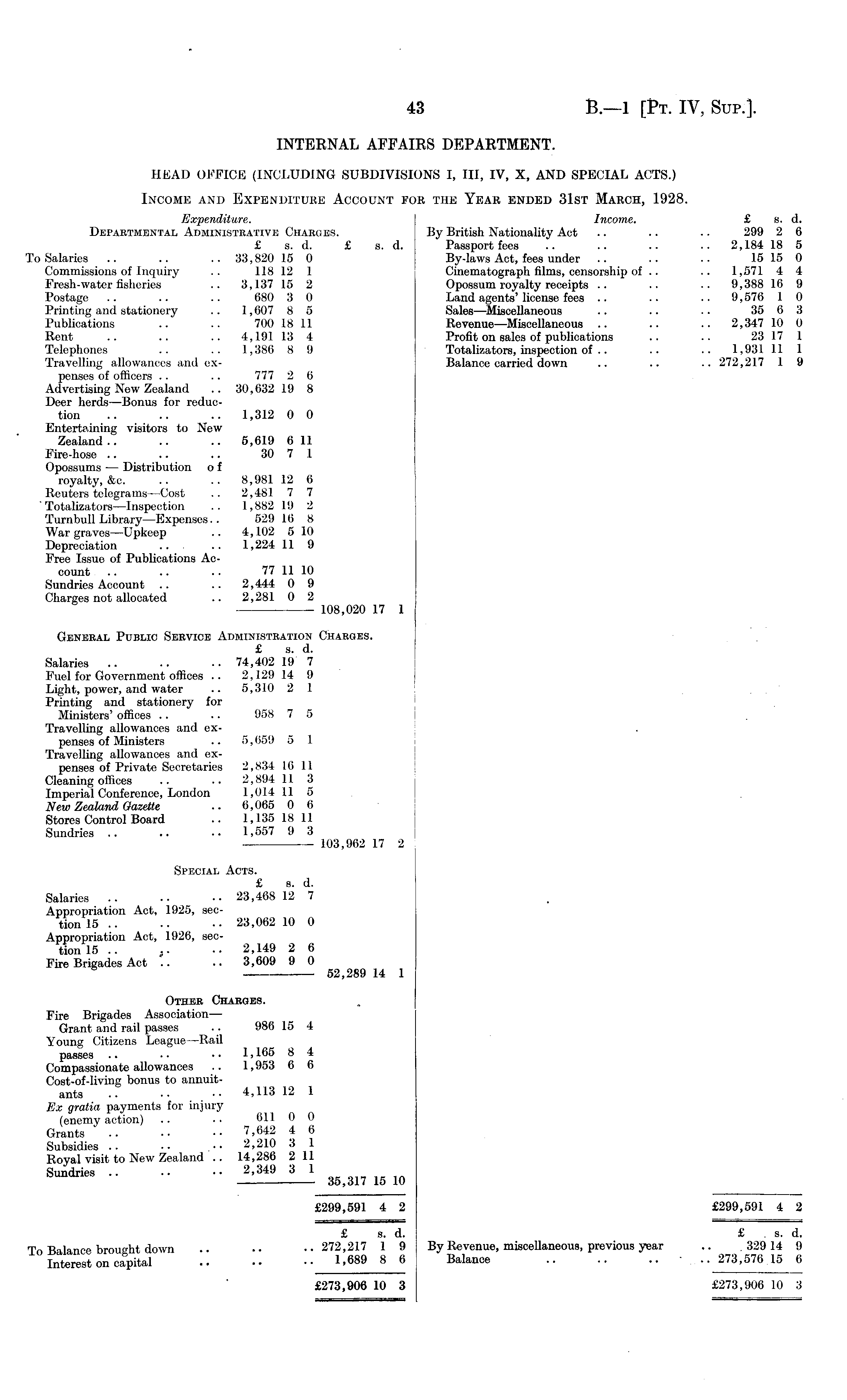 INTERNAL AFFAIRS DEPARTMENT. HEAD OFFICE (INCLUDING SUBDIVISIONS I, 111, IV, X, AND SPECIAL ACTS.) Income and Expenditure Account for the Year ended 31st March, 1928. Expenditure. Income. £ s. d. Departmental Administrative Charges. By British Nationality Act .. .. .. 299 2 6 £ s. d. £ s. d. Passport fees .. .. .. .. 2,184 18 5 To Salaries .. .. .. 33,820 15 0 By-laws Act, fees under .. .. .. 15 15 0 Commissions of Inquiry .. 118 12 1 Cinematograph films, censorship of .. .. 1,571 4 4 Fresh-water fisheries .. 3,137 15 2 Opossum royalty receipts .. .. .. 9,388 16 9 Postage .. .. .. 680 3 0 Land agents' license fees .. .. .. 9,576 1 0 Printing and stationery .. 1,607 8 5 Sales —Miscellaneous .. .. .. 35 6 3 Publications .. .. 700 18 11 Revenue —Miscellaneous .. .. .. 2,347 10 0 Rent .. .. .. 4,191 13 4 Profit on sales of publications .. 23 17 1 Telephones .. .. 1,386 8 9 Totalizators, inspection of .. .. .. 1,931 11 1 Travelling allowances and ex- Balance carried down .. .. .. 272,217 1 9 penses of officers .. .. 777 2 6 Advertising New Zealand .. 30,632 19 8 Deer herds —Bonus for reduction .. .. .. 1,312 0 0 Entertaining visitors to New Zealand.. .. .. 5,619 6 11 Fire-hose .. .. .. 30 7 1 Opossums ■— Distribution of royalty, &c. .. .. 8,981 12 6 Reuters telegrams—Cost .. 2,481 7 7 Totalizators —Inspection .. 1,882 19 2 Turnbull Library—Expenses.. 529 16 8 War graves—Upkeep .. 4,102 510 Depreciation 1,224 11 9 Free Issue of Publications Account .. .. .. 77 11 10 Sundries Account .. .. 2,444 0 9 Charges not allocated .. 2,281 0 2 108,020 17 1 General Public Service Administration Charges. £ s. d. Salaries .. .. •• 74,402 19 7 Fuel for Government offices .. 2,129 14 9 Light, power, and water .. 5,310 2 1 Printing and stationery for Ministers' offices .. .. 958 7 5 Travelling allowances and expenses of Ministers .. 5, 659 5 1 Travelling allowances and expenses of Private Secretaries 2,834 16 11 Cleaning offices .. .. 2,894 11 3 Imperial Conference, London 1,014 11 5 New Zealand Gazette .. 6,065 0 6 Stores Control Board .. 1,135 18 11 Sundries .. •• •• 1,557 9 3 103,962 17 2 Special Acts. £ s. d. Salaries .. •• •• 23,468 12 7 Appropriation Act, 1925, section 15 23,062 10 0 Appropriation Act, 1926, section 15.. •• 2,149 26 Fire Brigades Act .. .. 3,609 9 0 52,289 14 1 Other Charges. Fire Brigades Association — Grant and rail passes .. 986 15 4 Young Citizens League —Rail passes .. • • • • 1 > 165 8 4 Compassionate allowances .. 1,953 6 6 Cost-of-living bonus to annuitants .. •• •• 4,113 12 1 Ex gratia payments for injury (enemv action) .. .. 611 0 0 Grants .. •• •• 7,642 4 6 Subsidies .. •• .2,210 3 1 Royal visit to New Zealand .. 14,286 211 Sundries .. •• 2,349 3 1 35,317 15 10 £299,591 4 2 £299,591 4 2 £ s. d. £ s. d. To Balance brought down .. .. ..272,217 1 9 By Revenue, miscellaneous, previous year .. 32914 9 Interest on capital 1,689 8 6 Balance •• 273,576 15 6 £273,906 10 3 £273,906 10 3
