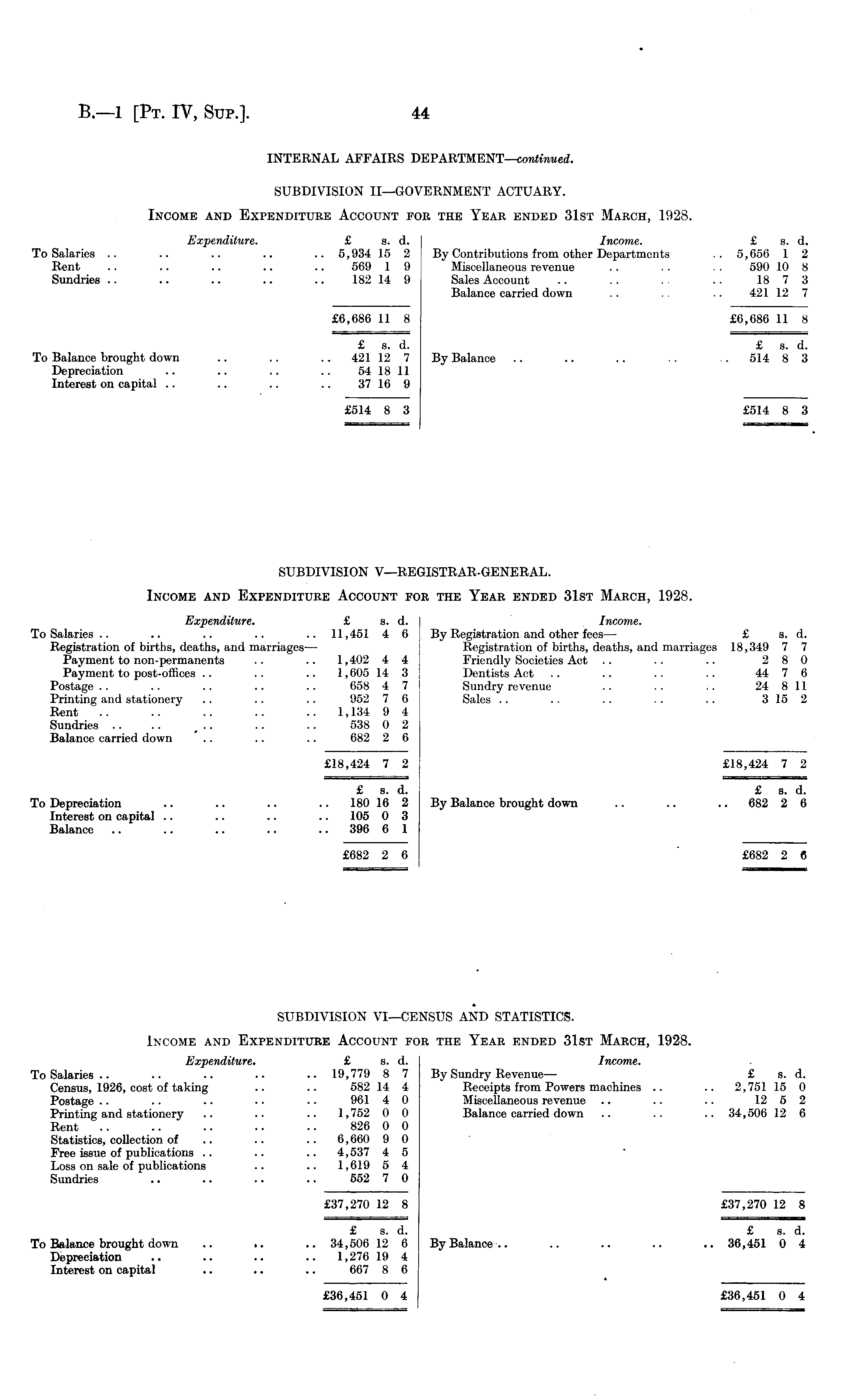 INTERNAL AFFAIRS DEPARTMENT—continued. SUBDIVISION lI—GOVERNMENT ACTUARY. Income and Expenditure Account for the Year ended 31st March, 1928. Expenditure. £ s. d. Income. £ s. d. To Salaries .. .. .. .. .. 5,934 15 2 By Contributions from other Departments .. 5,656 1 2 Rent .. .. .. .. .. 569 1 9 Miscellaneous revenue .. . . - . 590 10 8 Sundries .. .. .. .. .. 182 14 9 Sales Account .. .. . . .. 18 7 3 Balance carried down .. .. 421 12 7 £6,686 11 8 £6,686 11 8 £ s. d. £ s. d. To Balance brought down .. .. .. 421 12 7 By Balance .. .. .. .. . 514 8 3 Depreciation .. .. .. .. 54 18 11 Interest on capital .. .. .. .. 37 16 9 £514 8 3 £514 8 3 SUBDIVISION V—REGISTRAR-GENERAL. Income and Expenditure Account for the Year ended 31st March, 1928. Expenditure. £ s. d. Income. To Salaries .. .. .. .. .. 11,451 4 6 By Registration and other fees — £ s. d. Registration of births, deaths, and marriages— Registration of births, deaths, and marriages 18,349 7 7 Payment to non-permanents .. .. 1,402 4 4 Friendly Societies Act .. .. .. 2 8 0 Payment to post-offices .. .. .. 1,605 14 3 Dentists Act .. .. .. .. 44 7 6 Postage .. .. .. .. .. 658 4 7 Sundry revenue .. .. .. 24 8 11 Printing and stationery .. .. .. 952 7 6 Sales .. .. .. .. .. 315 2 Rent .. .. .. .. .. 1,134 9 4 Sundries .. .. t. . .. .. 538 0 2 Balance carried down .. .. .. 682 2 6 £18,424 7 2 £18,424 7 2 £ s. d. £ s. d. To Depreciation .. .. .. .. 180 16 2 By Balance brought down .. .. .. 682 2 6 Interest on capital .. .. .. .. 105 0 3 Balance .. .. .. .. .. 396 6 1 £682 2 6 £682 2 6 SUBDIVISION VI—CENSUS AND STATISTICS. Income and Expenditure Account for the Year ended 31st March, 1928. Expenditure. £ s. d. Income. To Salaries .. .. .. •• •• 19,779 8 7 By Sundry Revenue — £ s. d. Census, 1926, cost of taking .. .. 582 14 4 Receipts from Powers machines .. .. 2,751 15 0 Postage .. .. .. .. .. 961 4 0 Miscellaneous revenue .. .. .. 12 5 2 Printing and stationery .. .. .. 1,752 0 0 Balance carried down .. .. .. 34,506 12 6 Rent .. .. .. .. .. 826 0 0 Statistics, collection of .. .. .. 6,660 9 0 Free issue of publications .. .. .. 4,537 4 5 Loss on sale of publications .. .. 1,619 5 4 Sundries . • .. .. .. 552 7 0 £37,270 12 8 £37,270 12 8 £ s. d. £ s. d. To Balance brought down .. .. .. 34,506 12 6 By Balance .. .. .. .. .. 36,451 0 4 Depreciation .. .. .. .. 1,276 19 4 Interest on capital .. .. .. 667 8 6 £36,451 0 4 £36,451 0 4