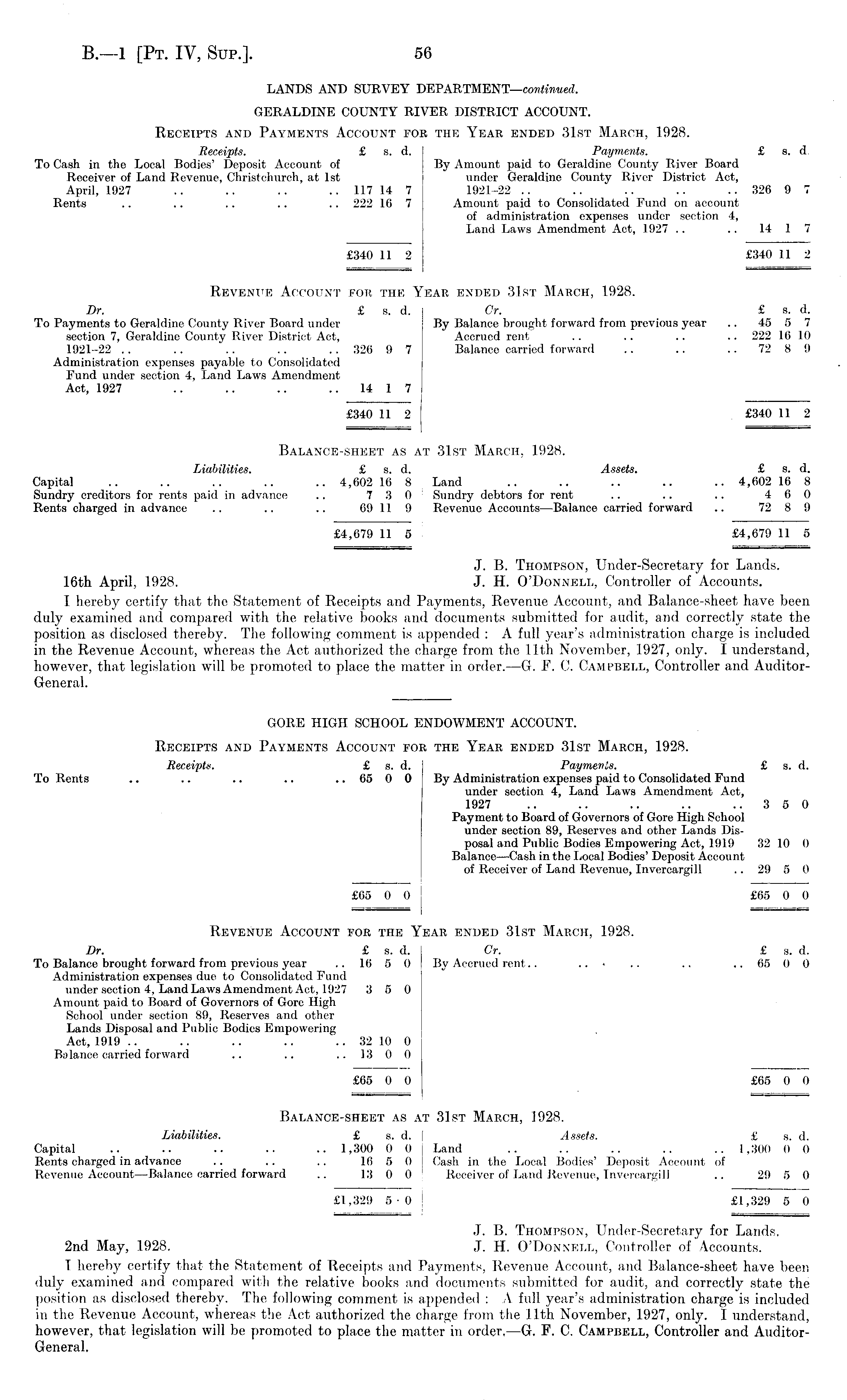 LANDS AND SURVEY DEPARTMENT—continued. GERALDINE COUNTY RIVER DISTRICT ACCOUNT. Receipts and Payments Account fob the Year ended 31st March, 1928. Receipts. £ s. d. Payments. £ s. d. To Cash in the Local Bodies' Deposit Account of By Amount paid to Geraldine County River Board Receiver of Land Revenue, Christchurch, at Ist under Geraldine County River District Act, April, 1927 .. .. . . .. 117 14 7 1921-22 .. .. .. .. .. 326 9 7 Rents .. .. .. .. .. 222 16 7 Amount paid to Consolidated Fund on account of administration expenses under section 4, Land Laws Amendment Act, 1927 .. .. 14 1 7 £340 11 2 £340 11 2 Revenue Account for the Year ended 31st March, 1928. Dr. £ s. d. Or. £ s. d. To Payments to Geraldine County River Board under By Balance brought forward from previous year .. 45 5 7 section 7, Geraldine County River District Act, Accrued rent .. .. .. .. 222 16 10 1921-22 .. .. .. .. .. 326 9 7 Balance carried forward .. .. .. 72 8 9 Administration expenses payable to Consolidated Fund under section 4, Land Laws Amendment Act, 1927 .. .. .. .. 14 1 7 £340 11 2 £340 11 2 1 ====— Balance-sheet as at 31st March, 1928. Liabilities. £ s. d. Assets. £ s. d. Capital .. .. .. .. .. 4,602 16 8 Land .. .. .. .. .. 4,602 16 8 Sundry creditors for rents paid in advance .. 7 3 0 Sundry debtors for rent .. .. .. 4 6 0 Rents charged in advance .. .. .. 69 11 9 Revenue Accounts —Balance carried forward .. 72 8 9 £4,679 11 5 £4,679 11 5 J. B. Thompson, Under-Secretary for Lands. 16th April, 1928. J. H. O'Donnell, Controller of Accounts. I hereby certify that the Statement of Receipts and Payments, Revenue Account, and Balance-sheet have been duly examined and compared with the relative books and documents submitted for audit, and correctly state the position as disclosed thereby. The following comment is appended : A full year's administration charge is included in the Revenue Account, whereas the Act authorized the charge from the 11th November, 1927, only. I understand, however, that legislation will be promoted to place the matter in order.—G. P. C. Campbell, Controller and AuditorGeneral. GORE HIGH SCHOOL ENDOWMENT ACCOUNT. Receipts and Payments Account for the Year ended 31st March, 1928. Receipts. £ s. d. Paymenis. £ s. d. To Rents .. .. .. .. .. 65 0 0 By Administration expenses paid to Consolidated Fund under section 4, Land Laws Amendment Act, 1927 .. .. .. .. ..350 Payment to Board of Governors of Gore High School under section 89, Reserves and other Lands Disposal and Public Bodies Empowering Act, 1919 32 10 0 Balance —Cash in the Local Bodies' Deposit Account of Receiver of Land Revenue, Invercargill .. 29 5 0 £65 0 0 £65 0 0 Revenue Account for the Year ended 31st March, 1928. Dr. £ s. d. Gr. £ s. d. To Balance brought forward from previous year .. 16 5 0 By Accrued rent.. ... .. .. .. 65 0 0 Administration expenses due to Consolidated Fund under section 4, Land Laws Amendment Act, 1927 3 5 0 Amount paid to Board of Governors of Gore High School under section 89, Reserves and other Lands Disposal and Public Bodies Empowering Act, 1919 .. .. .. .. .. 32 10 0 Balance carried forward .. .. ..1300 £65 0 0 £65 0 0 Balance-sheet as at 31st March, 1928. Liabilities. £ s. d. Assets. £ s. d. Capital .. .. .. .. .. 1,300 0 0 Land .. .. .. .. 1,300 0 0 Rents charged in advance .. .. .. 16 5 0 Cash in the Local Bodies' Deposit Account of Revenue Account —Balance carried forward .. 13 0 0 Receiver of Land Revenue, Invercargill .. 29 5 0 £1,329 5-0 £1,329 5 0 J. B. Thompson, Under-Secretary for Lands. 2nd May, 1928. J. H. O'Donnell, Controller of Accounts. I hereby certify that the Statement of Receipts and Payments, Revenue Account, and Balance-sheet have been duly examined and compared with the relative books and documents submitted for audit, and correctly state the position as disclosed thereby. The following comment is appended : A full year's administration charge is included in the Revenue Account, whereas the Act authorized the charge from the 11th November, 1927, only. I understand, however, that legislation will be promoted to place the matter in order, —G. F. C. Campbell, Controller and AuditorGeneral.