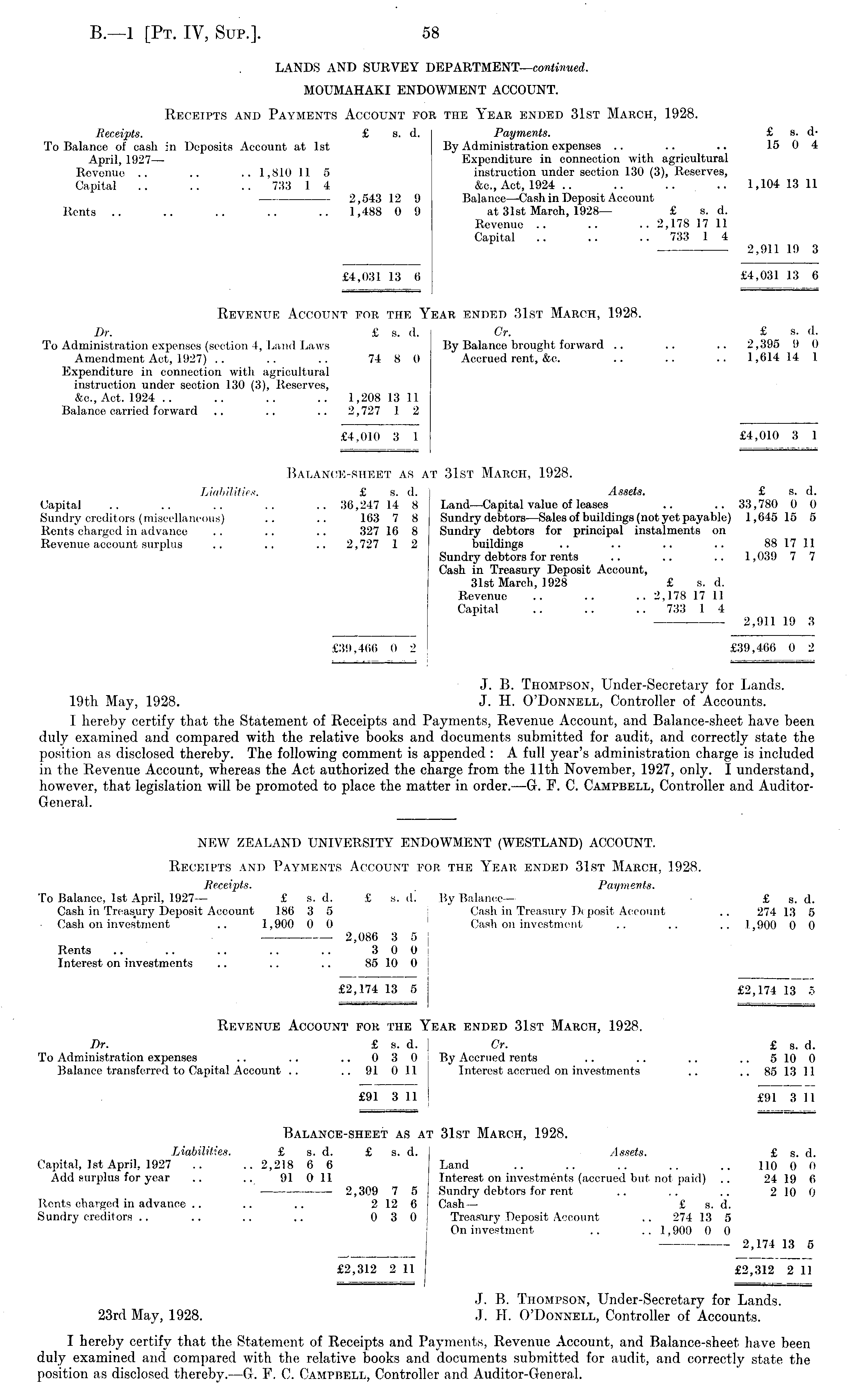 LANDS AND SURVEY DEPARTMENT—continued. MOUMAHAKI ENDOWMENT ACCOUNT. Receipts and Payments Account foe the Year ended 31st March, 1928. Receipts. £ s. d. Payments. £ s. dTo Balance of cash in Deposits Account at Ist By Administration expenses .. .. .. 15 0 4 April, 1927— Expenditure in connection with agricultural Revenue .. .. .. 1,810 11 5 instruction under section 130 (3), Reserves, Capital .. .. 733 1 4 &c., Act, 1924 .. .. .. .. 1,104 13 11 — ——-—- 2,543 12 9 Balance —Cash in Deposit Account Rents .. .. .. .. .. 1,488 0 9 at 31st March, 1928—■ £ s. d. Revenue .. .. .. 2,178 17 11 Capital .. .. .. 733 1 4 2,911 19 3 £4,031 13 6 £4,031 13 6 Revenue Account for the Year ended 31st March, 1928. Dr. £ s. d. Cr. £ s. d. To Administration expenses (section 4, Land Laws By Balance brought forward .. .. .. 2,395 9 0 Amendment Act, 1927) .. .. .. 74 8 0 Accrued rent, &c. .. .. .. 1,614 14 1 Expenditure in connection with agricultural instruction under section 130 (3), Reserves, &c., Act. 1924 .. .. .. .. 1,208 13 11 Balance carried forward .. .. .. 2,727 1 2 £4,010 3 1 £4,010 3 1 Balance-sheet as at 31st March, 1928. Liabilities. £ s. d. Assets. £ s. d. Capital .. .. .. .. .. 36,247 14 8 Land—Capital value of leases .. .. 33,780 0 0 Sundry creditors (miscellaneous) .. .. 163 7 8 Sundry debtors—Sales of buildings (not yet payable) 1,645 15 5 Rents charged in advance .. .. .. 327 16 8 Sundry debtors for principal instalments on Revenue account surplus .. .. .. 2,727 1 2 buildings .. .. .. .. 88 17 11 Sundry debtors for rents .. .. .. 1,039 7 7 Cash in Treasury Deposit Account, 31st March, 1928 £ s. d. | Revenue .. .. ..2,178 17 11 Capital .. .. .. 733 1 4 2,911 19 3 £39,466 0 2 £39,466 0 2 ■ ! J. B. Thompson, Under-Secretary for Lands. 19th May, 1928. J. H. O'Donnell, Controller of Accounts. I hereby certify that the Statement of Receipts and Payments, Revenue Account, and Balance-sheet have been duly examined and compared with the relative books and documents submitted for audit, and correctly state the position as disclosed thereby. The following comment is appended : A full year's administration charge is included in the Revenue Account, whereas the Act authorized the charge from the 11th November, 1927, only. I understand, however, that legislation will be promoted to place the matter in order.—G. F. C. Campbell, Controller and AuditorGeneral. NEW ZEALAND UNIVERSITY ENDOWMENT (WESTLAND) ACCOUNT. Receipts and Payments Account for the Year ended 31st March, 1928. Receipts. , Payments. To Balance, Ist April, 1927— £ s. d. £ s. d. ! By Balance— • £ s. d. Cash in Treasury Deposit Account 186 3 5 Cash in Treasury Deposit Account .. 274 13 5 Cash on investment .. 1,900 0 0 Cash on investment .. .. 1,900 0 0 2,086 3 5 Rents .. , .. .. .. 300 Interest on investments .. .. .. 85 10 0 £2,174 13 5 ; £2,174 13 ~5 i — | Revenue Account for the Year ended 31st March, 1928. Dr. £ s. d. ' Cr. £ s. d. To Administration expenses .. .. .. 0 3 0 By Accrued rents .. .. .. .. 510 0 Balance transferred to Capital Account .. .. 91 0 11 I Interest accrued on investments .. .. 85 13 11 £91 3 11 £91 3 11 Balance-sheet as at 31st March, 1928. Liabilities. £ s. d. £ s. d. I Assets. £ s. d. Capital, Ist April, 1927 .. .. 2,218 6 6 I Land .. .. .. .. .. 110 0 0 Add surplus for year .. 91 Oil | Interest on investments (accrued but not paid) .. 24 19 6 2,309 7 5 Sundry debtors for rent .. .. ~ 210 0 Rents charged in advance .. .. .. 212 6 Cash — £ s. d. Sundry creditors .. .. .. .. 030 Treasury Deposit Account .. 274 13 5 | On investment .. .. 1, 900 0 0 2,174 13 5 £2,312 2 11 , £2,312 2 11 I , i J. B. Thompson, Under-Secretary for Lands. 23rd May, 1928. J. H. O'Donnell, Controller of Accounts. I hereby certify that the Statement of Receipts and Payments, Revenue Account, and Balance-sheet have been duly examined and compared with the relative books and documents submitted for audit, and correctly state the position as disclosed thereby.—G. F. C. Campbell, Controller and Auditor-General.