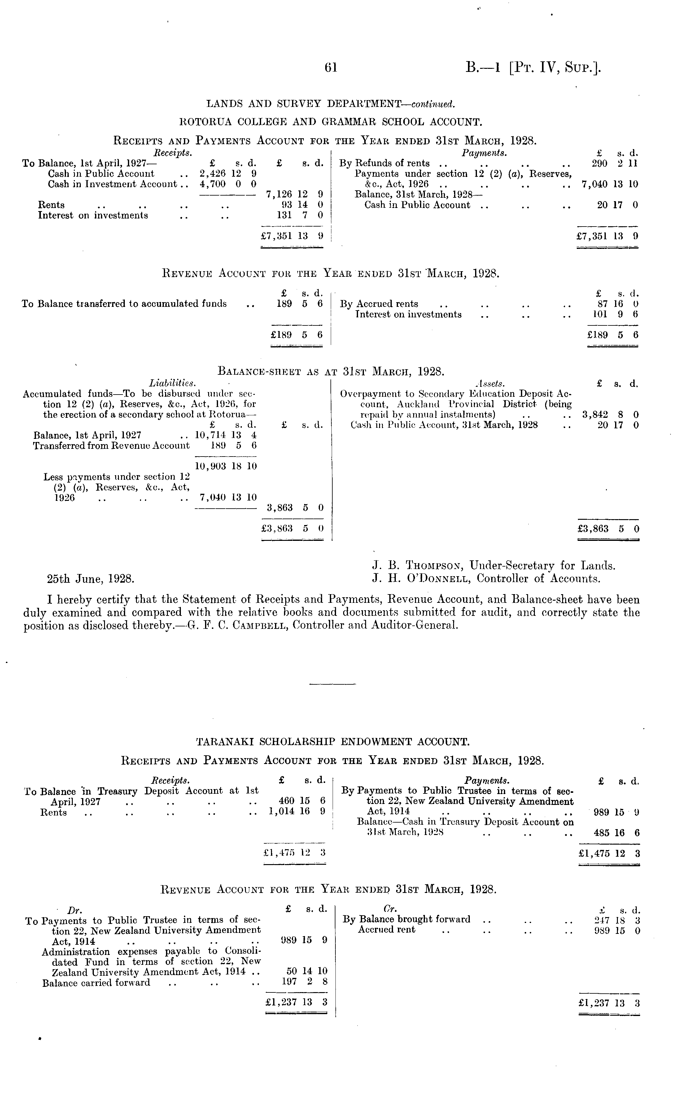 LANDS AND SURVEY DEPARTMENT—continued. ROTORUA COLLEGE AND GRAMMAR SCHOOL ACCOUNT. Receipts and Payments Account foe the Year ended 31st March, 1928. Receipts. Payments. £ s. d. To Balance, Ist April, 1927— £ s. d. £ s. d. By Refunds of rents .. .. .. .. 290 211 Cash in Public Account .. 2,426 12 9 Payments under section 12 (2) (a), Beserves, Cash in Investment Account.. 4,700 0 0 &0., Act, 1926 .. .. .. .. 7,040 13 10 7,126 12 9 Balance, 31st March, 1928— Rents .. .. .. .. 93 14 0 Cash in Public Account .. .. .. 20 17 0 Interest on investments .. .. 131 7 0 £7,351 13 9 £7,351 13 9 Revenue Account for the Year ended 31st'March, 1928. £ s. d. | £ s. d. To Balance transferred to accumulated funds .. 189 5 6 By Accrued rents .. .. .. .. 87 16 0 Interest on investments .. .. .. 101 9 6 £189 5 6 ; £189 5 6 Balance-sheet as at 31st March, 1928. Liabilities. ■ ylssete. £ s. d. Accumulated funds—To be disbursed under sec- Overpayment to Secondary Education Deposit Action 12 (2) (a), Reserves, &c., Act, 1926, for count, Auckland Provincial District (being the erection of a secondary school at Rotorua— repaid by annual instalments) .. .. 3,842 8 0 £ s. d. £ s. d. Cash in Public Account, 31st March, 1928 .. 20 17 0 Balance, Ist April, 1927 .. 10,714 13 4 Transferred from Revenue Account 189 5 6 10,903 18 10 Less payments under section 12 (2) (a), Reserves, &c., Act, 1926 .. .. .. 7,040 13 10 3,863 5 0 £3,863 5 0 £3,863 5 0 J. B. Thompson, Under-Secretary for Lands. 25th June, 1928. J. H. O'Donnell, Controller of Accounts. I hereby certify that the Statement of Receipts and Payments, Revenue Account, and Balance-sheet have been duly examined and compared with the relative books and documents submitted for audit, and correctly state the position as disclosed thereby.—G. F. C. Campbell, Controller and Auditor-General. TARANAKI SCHOLARSHIP ENDOWMENT ACCOUNT. Receipts and Payments Account for the Year ended 31st March, 1928. Receipts. £ s. d. Payments. £ s. d. To Balance 'in Treasury Deposit Account at Ist By Payments to Public Trustee in terms of secApril, 1927 .. .. .. .. 460 15 6 tion 22, New Zealand University Amendment Rents .. .. .. .. .. 1,014 16 9 Act, 1914 .. .. .. .. 989 15 9 Balance —Cash in Treasury Deposit Account on 31st March, 1928 .. .. .. 485 16 6 £1,475 12 3 £1,475 12 3 Revenue Account for the Year ended 31st March, 1928. Dr. £ s. d. Cr. £ s. d. To Payments to Public Trustee in terms of sec- By Balance brought forward .. .. .. 247 18 3 tion 22, New Zealand University Amendment Accrued rent .. .. .. .. 989 15 0 Act, 1914 ... 989 15 9 Administration expenses payable to Consolidated Eund in terms of section 22, New Zealand University Amendment Act, 1914 .. 50 14 10 Balance carried forward .. .. .. 197 2 8 £1,237 13 3 £1,237 13 3