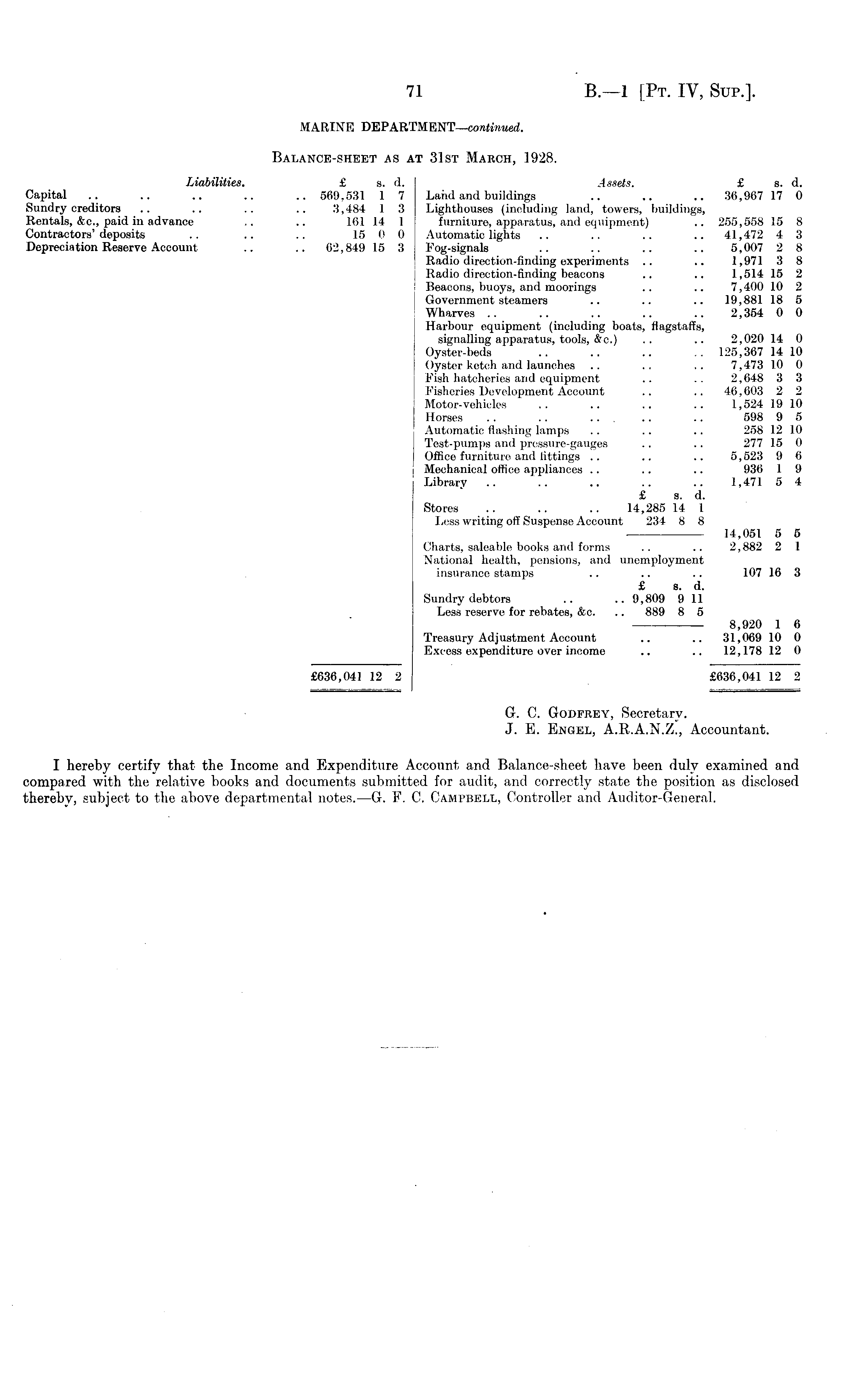 MARINE DEPARTMENT—-continued. Balance-sheet as at 31st March, 1928. Liabilities. £ s. d. .4ssete. £ s. d. Capital .. .. .. .. .. 569,531 1 7 Land and buildings .. .. .. 36,967 17 0 Sundry creditors .. .. .. .. 3,484 1 3 Lighthouses (including land, towers, buildings, Rentals, &c., paid in advance .. 161 14 1 furniture, apparatus, and equipment) .. 255,558 15 8 Contractors'deposits .. .. .. 15 0 0 Automatic lights .. .. .. .. 41,472 4 3 Depreciation Reserve Account .. .. 62,849 15 3 Fog-signals .. .. .. .. 5,007 2 8 Radio direction-finding experiments .. .. 1,971 3 8 Radio direction-finding beacons .. .. 1,514 15 2 | Beacons, buoys, and moorings .. .. 7,400 10 2 Government steamers .. .. .. 19,881 18 5 Wharves .. .. .. .. .. 2,354 0 0 Harbour equipment (including boats, flagstaffs, signalling apparatus, tools, &c.) .. .. 2,020 14 0. Oyster-beds .. .. .. .. 125,367 14 10 | Oyster ketch and launches .. .. .. 7,473 10 0 Fish hatcheries and equipment .. .. 2,648 3 3 Fisheries Development Account .. .. 46,603 2 2 j Motor-vehicles .. .. .. .. 1,524 19 10 i Horses .. .. .. .. .. 598 9 5 Automatic flashing lamps .. .. .. 258 12 10 Test-pumps and pressure-gauges .. .. 277 15 0 | Office furniture and fittings .. .. .. 5, 523 9 6 i Mechanical office appliances .. .. .. 936 1 9 Library .. .. .. .. .. 1,471 5 4 £ s. d. Stores .. .. .. 14,285 14 1 Less writing off Suspense Account 234 8 8 14,051 5 5 Charts, saleable books and forms .. .. 2,882 2 1 National health, pensions, and unemployment insurance stamps .. .. .. 107 16 3 £ s. d. Sundry debtors .. .. 9,809 9 11 Less reserve for rebates, &c. .. 889 8 5 — 8,920 1 6 Treasury Adjustment Account .. .. 31,069 10 0 Excess expenditure over income .. .. 12,178 12 0 £636,041 12 2 £636,041 12 2 G. C. Godfrey, Secretary. J. E. Engel, A.R.A.N.Z., Accountant. I hereby certify that the Income and Expenditure Account and Balance-sheet have been duly examined and compared with the relative books and documents submitted for audit, and correctly state the position as disclosed thereby, subject to the above departmental notes. —G. F. C. Campbell, Controller and Auditor-General.