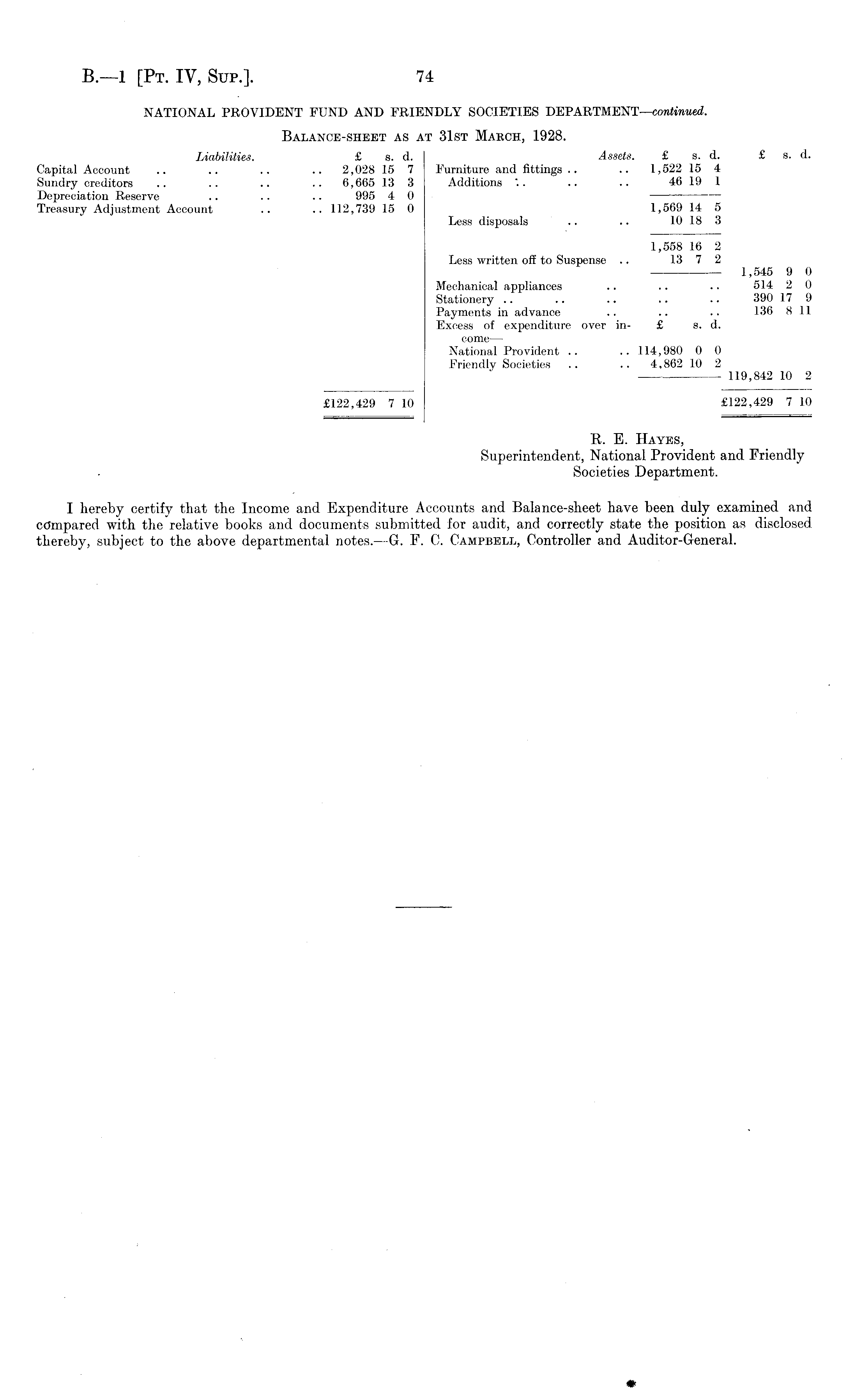 NATIONAL PROVIDENT FUND AND FRIENDLY SOCIETIES DEPARTMENT—continued. Balance-sheet as at 31st Maech, 1928. Liabilities. £ s. d. Assets. £ s. d. £ s. d. Capital Account .. .. .. .. 2,028 15 7 Furniture and fittings .. .. 1,522 15 4 Sundry creditors .. .. .. .. 6,665 13 3 Additions . .. .. 46 19 1 Depreciation Reserve .. .. .. 995 4 0 Treasury Adjustment Account .. .. 112,739 15 0 1,569 14 5 Less disposals .. .. 10 18 3 1,558 16 2 Less written off to Suspense .. 13 7 2 ■ —— 1,545 9 0 Mechanical appliances .. .. .. 514 2 0 Stationery .. .. .. .. .. 390 17 9 Payments in advance .. .. .. 136 8 11 Excess of expenditure over in- £ s. d. come— National Provident .. .. 114,980 0 0 Friendly Societies .. .. 4,862 10 2 119,842 10 2 £122,429 7 10 £122,429 7 10 R. E. Hayes, Superintendent, National Provident and Friendly Societies Department. I hereby certify that the Income and Expenditure Accounts and Balance-sheet have been duly examined and compared with the relative books and documents submitted for audit, and correctly state the position as disclosed thereby, subject to the above departmental notes. —G. F. C. Campbell, Controller and Auditor-General.