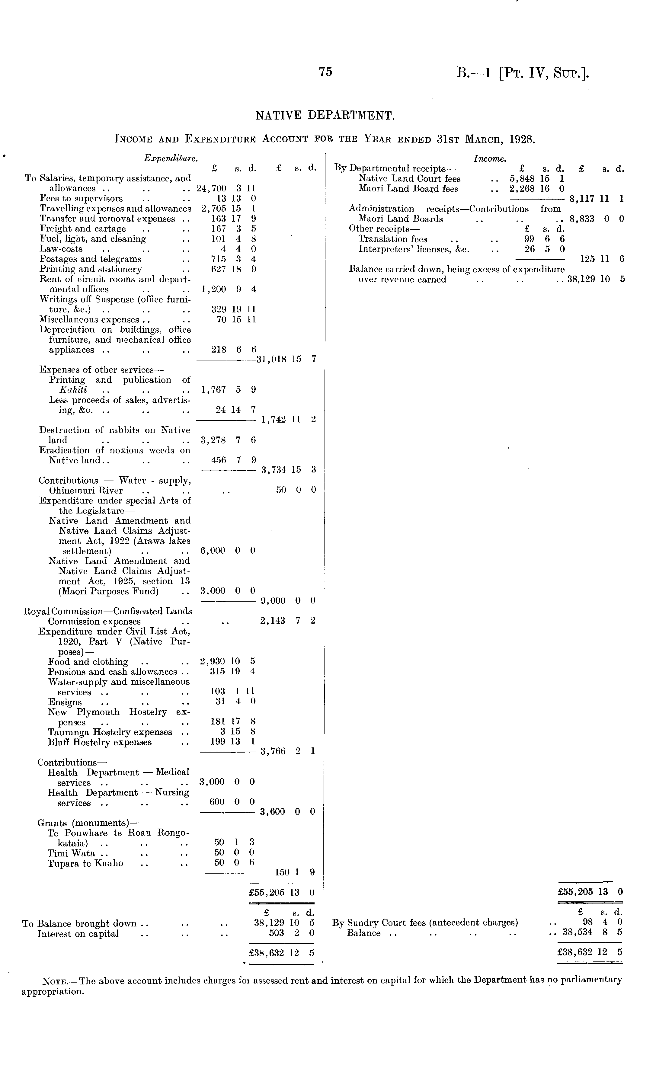 NATIVE DEPARTMENT. Income and Expenditure Account for the Year ended 31st March, 1928. Expenditure. Income. £ s. d. £ s. d. By Departmental receipts— £ s. d. £ s. d. To Salaries, temporary assistance, and Native Land Court fees .. 5,848 15 1 allowances .. .. .. 24,700 3 11 Maori Land Board fees .. 2,268 16 0 Fees to supervisors .. .. 13 13 0 — 8,117 11 1 Travelling expenses and allowances 2,705 15 1 Administration receipts—Contributions from Transfer and removal expenses .. 163 17 9 Maori Land Boards .. .. .. 8,833 0 0 Freight and cartage .. .. 167 3 5 Other receipts— £ s. d. Fuel, light, and cleaning .. 101 4 8 Translation fees .. .. 99 6 6 Law-costs .. .. .. 4 4 0 Interpreters' licenses, &c. .. 26 5 0 Postages and telegrams .. 715 3 4 125 11 6 Printing and stationery .. 627 18 9 Balance carried down, being excess of expenditure Rent of circuit rooms and depart- over revenue earned .. .. .. 38,129 10 5 mental offices .. .. 1,200 9 4 Writings off Suspense (office furniture, &c.) .. .. .. 329 19 11 Miscellaneous expenses .. .. 70 15 11 Depreciation on buildings, office furniture, and mechanical office appliances .. .. .. 218 6 6 31,018 15 7 Expenses of other services— Printing and publication of Kahiti .. .. .. 1,767 5 9 Less proceeds of sales, advertising, &c. .. .. .. 24 14 7 ■ 1,742 11 2 Destruction of rabbits on Native land .. .. .. 3,278 7 6 Eradication of noxious weeds on Native land.. .. .. 456 7 9 3,734 15 3 Contributions — Water - supply, Ohinemuri River .. .. .. 50 0 0 Expenditure under special Acts of the Legislature— Native Land Amendment and Native Land Claims Adjustment Act, 1922 (Arawa lakes settlement) .. .. 6,000 0 0 Native Land Amendment and Native Land Claims Adjustment Act, 1925, section 13 (Maori Purposes Fund) .. 3,000 0 0 9,000 0 0 Royal Commission —Confiscated Lands Commission expenses .. .. 2,143 7 2 Expenditure under Civil List Act, 1920, Part V (Native Purposes) — Food and clothing .. .. 2,930 10 5 Pensions and cash allowances .. 315 19 4 Water-supply and miscellaneous services .. .. .. 103111 Ensigns .. .. .. 31 4 0 New Plymouth Hostelry expenses .. .. .. 181 17 8 Tauranga Hostelry expenses .. 3 15 8 Bluff Hostelry expenses .. 199 13 1 3,766 2 1 Contributions — Health Department — Medical services .. . • •. 3,000 0 0 Health Department — Nursing services .. .. . • 600 0 0 3,600 0 0 Grants (monuments) — Te Pouwhare te Roau Rongokataia) .. .. .. 50 1 3 Timi Wata .. .. .. 50 0 0 Tupara te Kaaho .. .. 50 0 6 150 1 9 £55,205 13 0 £55,205 13 0 £ s. d. £ s. d. To Balance brought down .. .. .. 38,129 10 5 By Sundry Court fees (antecedent charges) .. 98 4 0 Interest on capital .. ■ ■ ■ ■ 503 2 0 Balance .. .. .. .. .. 38,534 8 5 £38,632 12 5 £38,632 12 5 Note. —The above account includes charges for assessed rent and interest on capital for which the Department has no parliamentary appropriation.