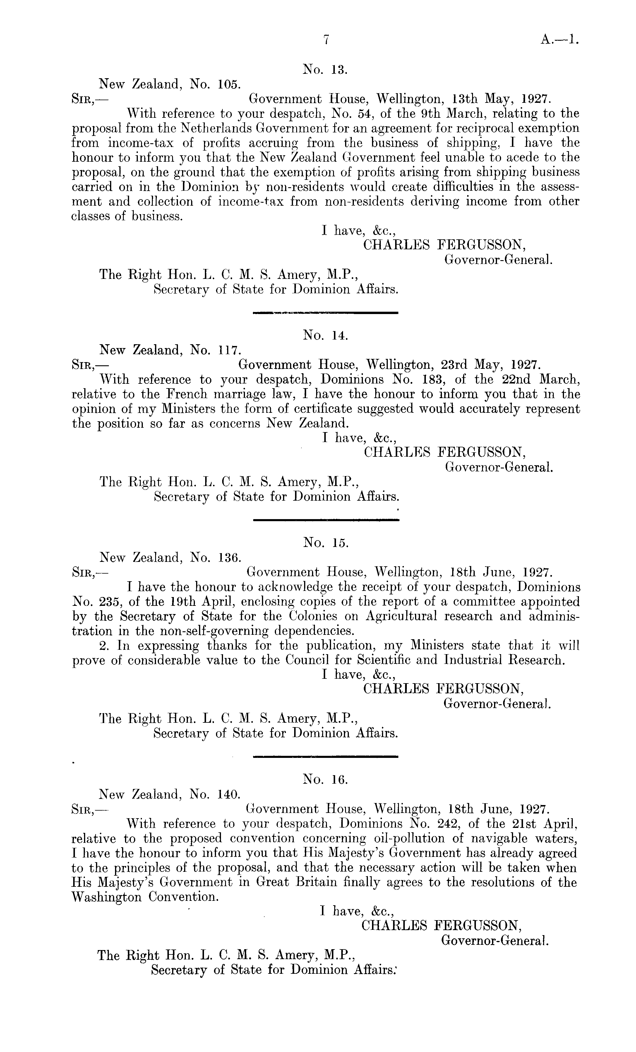 No. 16. New Zealand, No. 140. Sir, — Government House, Wellington, 18th June, 1927. With reference to your despatch, Dominions No. 242, of the 21st April, relative to the proposed convention concerning oil-pollution of navigable waters, I have the honour to inform you that His Majesty's Government has already agreed to the principles of the proposal, and that the necessary action will be taken when His Majesty's Government in Great Britain finally agrees to the resolutions of the Washington Convention. I have, &c., CHARLES FERGUSSON, Governor-General. The Right Hon. L. C. M. S. Amery, M.P., Secretary of State for Dominion Affairs.'