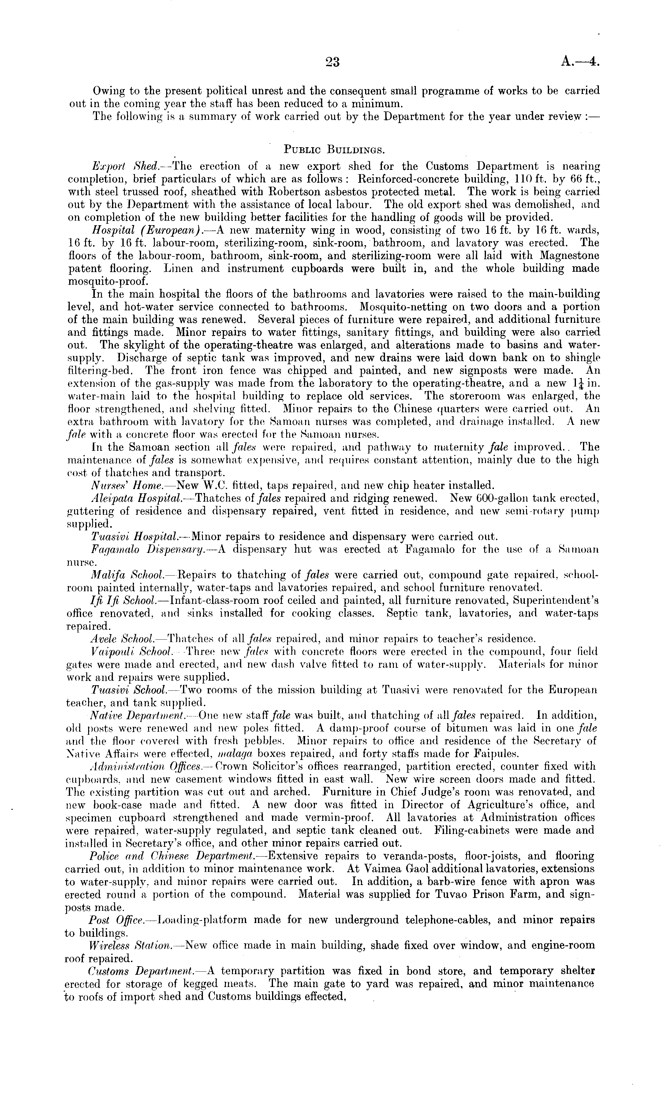 Owing to the present political unrest and the consequent small programme of works to be carried out in the coming year the staff has been reduced to a minimum. The following is a summary of work carried out by the Department for the year under review :— Public Buildings. Export Shed. —The erection of a new export shed for the Customs Department is nearing completion, brief particulars of which are as follows : Reinforced-concrete building, 110 ft. by 66 ft., with steel trussed roof, sheathed with Robertson asbestos protected metal. The work is being carried out by the Department with the assistance of local labour. The old export shed was demolished, and on completion of the new building better facilities for the handling of goods will be provided. Hospital (European).—A new maternity wing in wood, consisting of two 16 ft. by 16 ft. wards, 16 ft. by 16 ft. labour-room, sterilizing-room, sink-room, bathroom, and lavatory was erected. The floors of the labour-room, bathroom, sink-room, and sterilizing-room were all laid with Magnestone patent flooring. Linen and instrument cupboards were built in, and the whole building made mosquito-proof. In the main hospital the floors of the bathrooms and lavatories were raised to the main-building level, and hot-water service connected to bathrooms. Mosquito-netting on two doors and a portion of the main building was renewed. Several pieces of furniture were repaired, and additional furniture and fittings made. Minor repairs to water fittings, sanitary fittings, and building were also carried out. The skylight of the operating-theatre was enlarged, and alterations made to basins and watersupply. Discharge of septic tank was improved, and new drains were laid down bank on to shingle filtering-bed. The front iron fence was chipped and painted, and new signposts were made. An extension of the gas-supply was made from the laboratory to the operating-theatre, and a new 1-J in. water-main laid to the hospital building to replace old services. The storeroom was enlarged, the floor strengthened, and shelving fitted. Minor repairs to the Chinese quarters were carried out. An extra bathroom with lavatory for the Samoan nurses was completed, and drainage installed. A new fale with a concrete floor was erected for the Samoan nurses. In the Samoan section all fales were repaired, and pathway to maternity fale improved.. The maintenance of fales is somewhat expensive, and requires constant attention, mainly due to the high cost of thatches and transport. Nurses' Home. —New W.C. fitted, taps repaired, and new chip heater installed. Aleipata Hospital.—Thatches of fales repaired and ridging renewed. New 600-gallon tank erected, guttering of residence and dispensary repaired, vent, fitted in residence, and new semi-rotary pump supplied. Tuasivi Hospital. —Minor repairs to residence and dispensary were carried out. Fagamalo Dispensary. —A dispensary hut was erected at Fagamalo for the use of a Samoan nurse. Malifa School. —Repairs to thatching of fales were carried out, compound gate repaired, schoolroom painted internally, water-taps and lavatories repaired, and school furniture renovated. Ifi Iji School. —Infant-class-room roof ceiled and painted, all furniture renovated, Superintendent's office renovated, and sinks installed for cooking classes. Septic tank, lavatories, and water-taps repaired. Avele School. —Thatches of all fales repaired, and minor repairs to teacher's residence. Vaipouli School. —Three new fales with concrete floors were erected in the compound, four field gates were made and erected, and new dash valve fitted to ram of water-supply. Materials for minor work and repairs were supplied. Tuasivi School.— Two rooms of the mission building at Tuasivi were renovated for the European teacher, and tank supplied. Native Department. —One new staff fale was built, and thatching of all fales repaired. In addition, old posts were renewed and new poles fitted. A damp-proof course of bitumen was laid in one fale and the floor covered with fresh pebbles. Minor repairs to office and residence of the Secretary of Native Affairs were effected, malaga boxes repaired, and forty staffs made for Faipules. Administration Offices. —Crown Solicitor's offices rearranged, partition erected, counter fixed with cupboards, and new casement windows fitted in east wall. New wire screen doors made and fitted. The existing partition was cut out and arched. Furniture in Chief Judge's room was renovated, and new book-case made and fitted. A new door was fitted in Director of Agriculture's office, and specimen cupboard strengthened and made vermin-proof. All lavatories at Administration offices were repaired, water-supply regulated, and septic tank cleaned out. Filing-cabinets were made and installed in Secretary's office, and other minor repairs carried out. Police and Chinese Department. —Extensive repairs to veranda-posts, floor-joists, and flooring carried out, in addition to minor maintenance work. At Vaimea Gaol additional lavatories, extensions to water-supply, and minor repairs were carried out. In addition, a barb-wire fence with apron was erected round a portion of the compound. Material was supplied for Tuvao Prison Farm, and signposts made. Post Office. —Loading-platform made for new underground telephone-cables, and minor repairs to buildings. Wireless Station. —New office made in main building, shade fixed over window, and engine-room roof repaired. Customs Department. —A temporary partition was fixed in bond store, and temporary shelter erected for storage of kegged meats. The main gate to yard was repaired, and minor maintenance to roofs of import shed and Customs buildings effected,