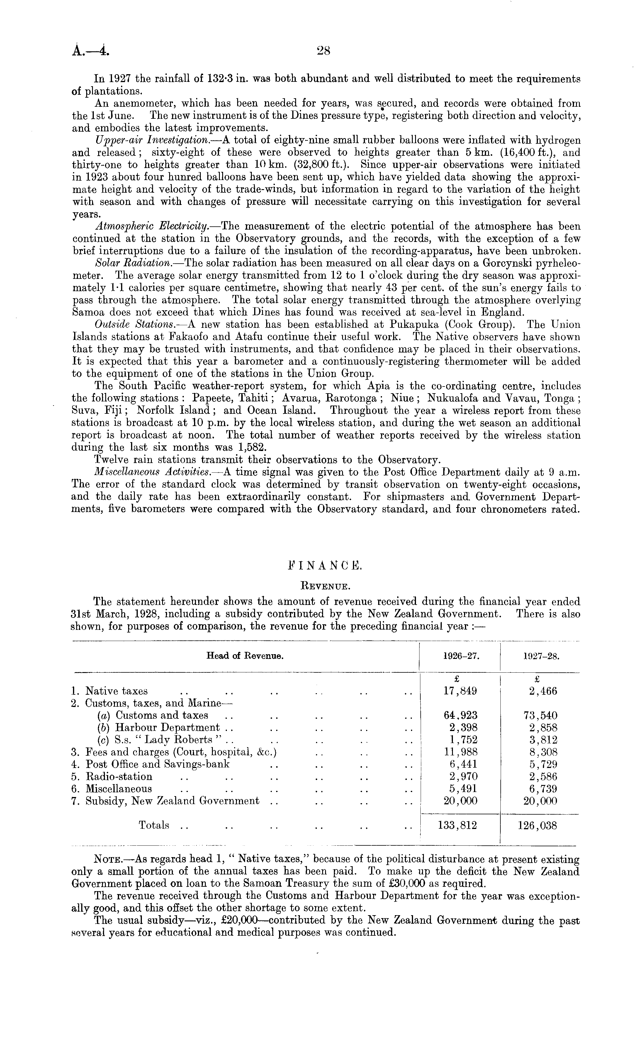 In 1927 the rainfall of 132-3 in. was both abundant and well distributed to meet the requirements of plantations. An anemometer, which has been needed for years, was secured, and records were obtained from the Ist June. The new instrument is of the Dines pressure type, registering both direction and velocity, and embodies the latest improvements. Upper-air Investigation. —A total of eighty-nine small rubber balloons were inflated with hydrogen and released; sixty-eight of these were observed to heights greater than 5 km. (16,400 ft.), and thirty-one to heights greater than 10 km. (32,800 ft.). Since upper-air observations were initiated in 1923 about four hunred balloons have been sent up, which have yielded data showing the approximate height and velocity of the trade-winds, but information in regard to the variation of the height with season and with changes of pressure will necessitate carrying on this investigation for several years. Atmospheric Electricity.-—The measurement of the electric potential of the atmosphere has been continued at the station in the Observatory grounds, and the records, with the exception of a few brief interruptions due to a failure of the insulation of the recording-apparatus, have been unbroken. Solar Radiation. —The solar radiation has been measured on all clear days on a Gorcynski pyrheleometer. The average solar energy transmitted from 12 to 1 o'clock during the dry season was approximately 1-1 calories per square centimetre, showing that nearly 43 per cent, of the sun's energy fails to pass through the atmosphere. The total solar energy transmitted through the atmosphere overlying Samoa does not exceed that which Dines has found was received at sea-level in England. Outside Stations.—A new station has been established at Pukapuka (Cook Group). The Union Islands stations at Fakaofo and Atafu continue their useful work. The Native observers have shown that they may be trusted with instruments, and that confidence may be placed in their observations. It is expected that this year a barometer and a continuously-registering thermometer will be added to the equipment of one of the stations in the Union Group. The South Pacific weather-report system, for which Apia is the co-ordinating centre, includes the following stations : Papeete, Tahiti; Avarua, Rarotonga ; Niue ; Nukualofa and Yavau, Tonga ; Suva, Fiji; Norfolk Island; and Ocean Island. Throughout the year a wireless report from these stations is broadcast at 10 p.m. by the local wireless station, and during the wet season an additional report is broadcast at noon. The total number of weather reports received by the wireless station during the last six months was 1,582. Twelve rain stations transmit their observations to the Observatory. Miscellaneous Activities.—A time signal was given to the Post Office Department daily at 9 a.m. The error of the standard clock was determined by transit observation on twenty-eight occasions, and the daily rate has been extraordinarily constant. For shipmasters and Government Departments, five barometers were compared with the Observatory standard, and four chronometers rated. FINANCE. Revenue. The statement hereunder shows the amount of revenue received during the financial year ended 31st March, 1928, including a subsidy contributed by the New Zealand Government. There is also shown, for purposes of comparison, the revenue for the preceding financial year :—