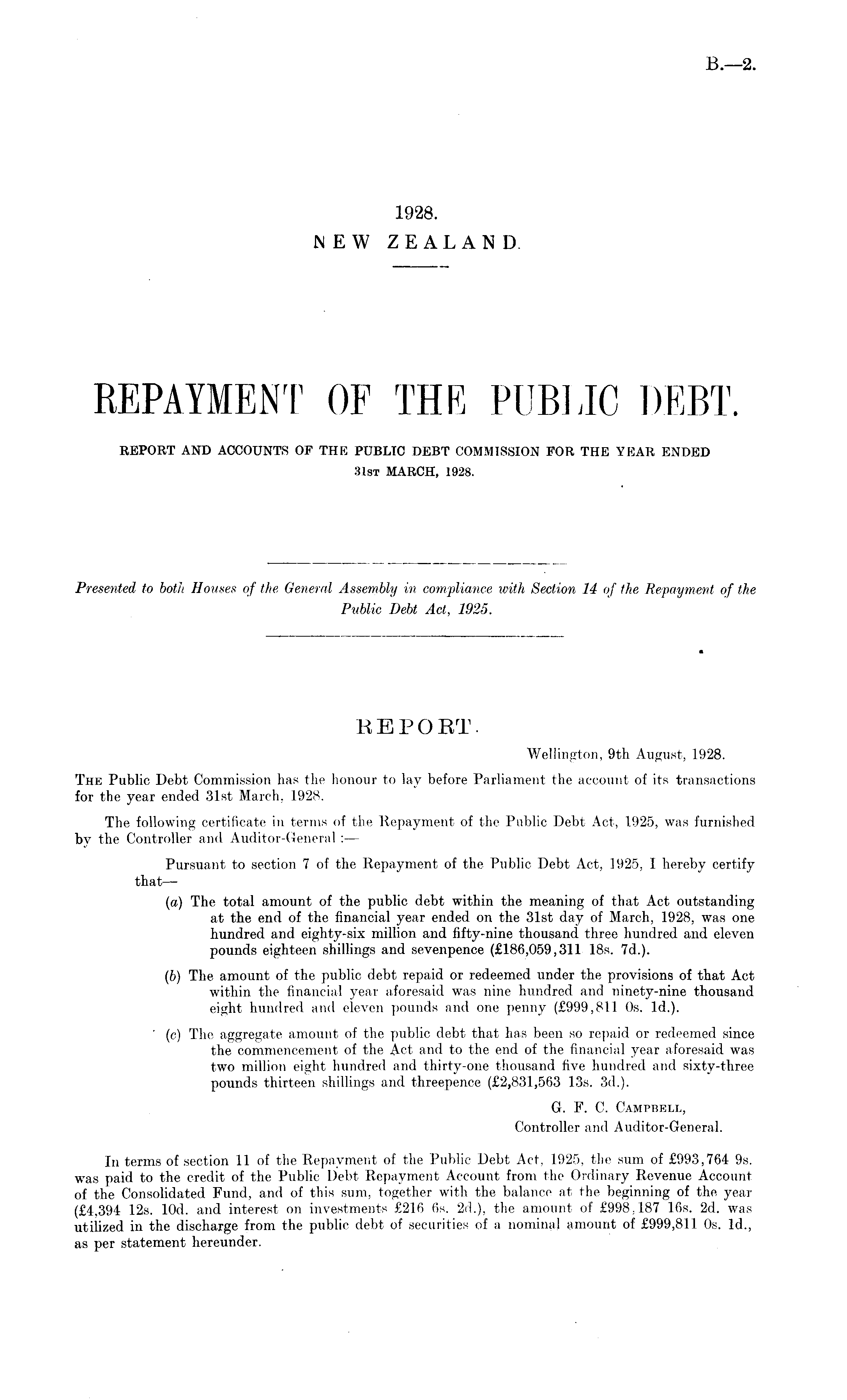 REPORT. Wellington, 9th August, 1928. The Public Debt Commission has the honour to lay before Parliament the account of its transactions for the year ended 31st March, 1928. The following certificate in terms of the Repayment of the Public Debt Act, 1925, was furnished by the Controller and Auditor-General: — Pursuant to section 7 of the Repayment of the Public Debt Act, 1925, I hereby certify that — (a) The total amount of the public debt within the meaning of that Act outstanding at the end of the financial year ended on the 31st day of March, 1928, was one hundred and eighty-six million and fifty-nine thousand three hundred and eleven pounds eighteen shillings and sevenpence (£186,059,311 18s. 7d.). (b) The amount of the public debt repaid or redeemed under the provisions of that Act within the financial year aforesaid was nine hundred and ninety-nine thousand eight hundred and eleven pounds and one penny (£999,811 os. Id.). ' (c) The aggregate amount of the public debt that has been so repaid or redeemed since the commencement of the Act and to the end of the financial year aforesaid was two million eight hundred and thirty-one thousand five hundred and sixty-three pounds thirteen shillings and threepence (£2,831,563 13s. 3d.). G. F. C. Campbell, Controller and Auditor-General. In terms of section 11 of the Repayment of the Public Debt Act, 1925, the sum of £993,764 9s. was paid to the credit of the Public Debt Repayment Account from the Ordinary Revenue Account of the Consolidated Fund, and of this sum, together with the balance at the beginning of the year (£4.394 12s. lOd. and interest on investments £216 6s. 2d.), the amount of £998,187 16s. 2d. was utilized in the discharge from the public debt of securities of a nominal amount of £999,811 os. Id., as per statement hereunder.