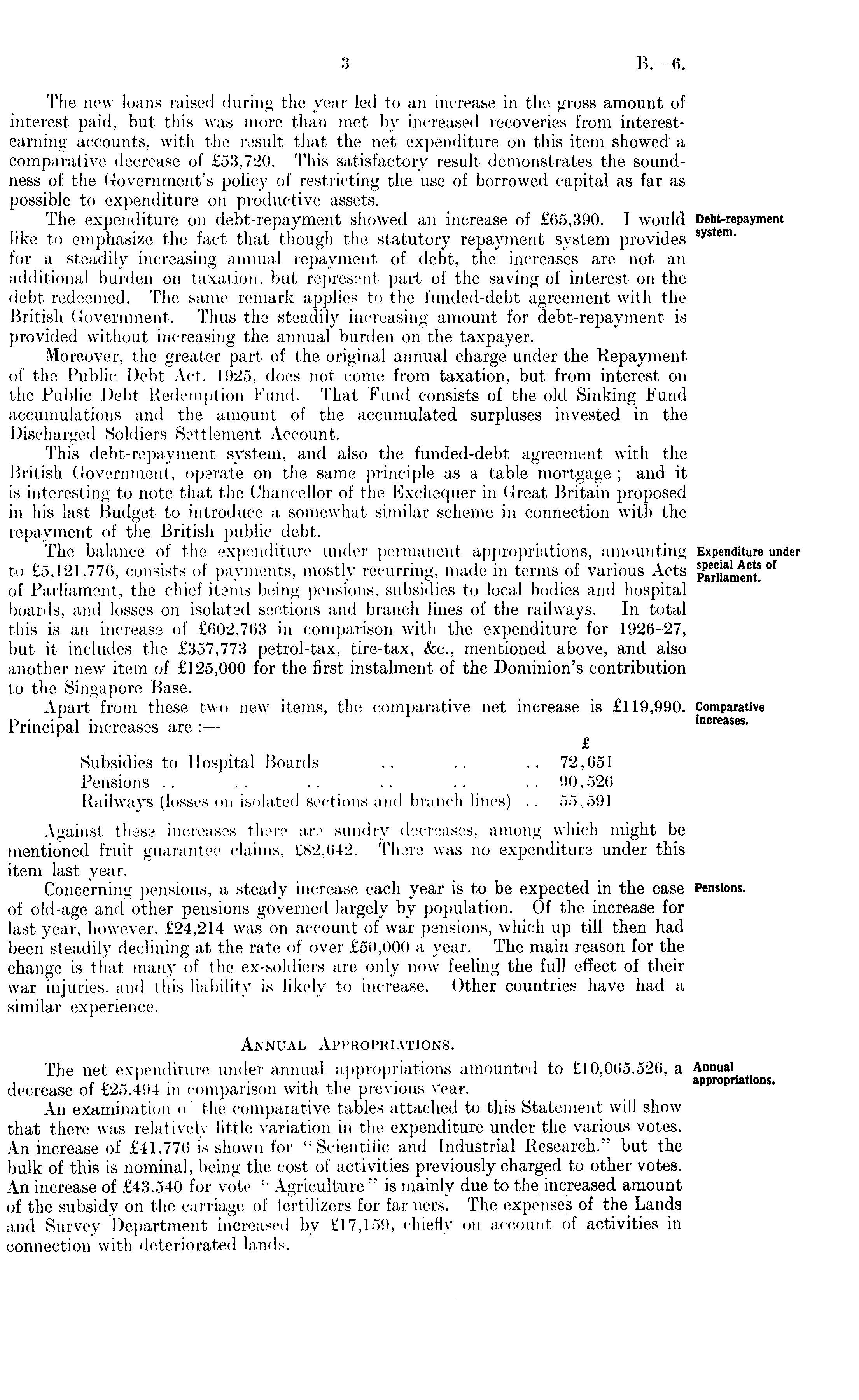 The new loans raised during the year led to an increase in the gross amount of interest paid, but this was more than met by increased recoveries from interestearning accounts, with the result that the net expenditure on this item showed' a comparative decrease of £53,720. This satisfactory result demonstrates the soundness of the Government's policy of restricting the use of borrowed capital as far as possible to expenditure on productive assets. The expenditure on debt-repayment showed an increase of £65,390. I would like to emphasize the fact that though the statutory repayment system provides for a steadily increasing annual repayment of debt, the increases are not an additional burden on taxation, but represent part of the saving of interest on the debt redeemed. The same remark applies to the funded-debt agreement with the British Government. Thus the steadily increasing amount for debt-repayment is provided without increasing the annual burden on the taxpayer. Moreover, the greater part of the original annual charge under the Repayment of the Public Debt Act, 1925, does not come from taxation, but from interest on the Public Debt Redemption Fund. That Fund consists of the old Sinking Fund accumulations and the amount of the accumulated surpluses invested in the Discharged Soldiers Settlement Account. This debt-repayment system, and also the funded-debt agreement with the British Government, operate on the same principle as a table mortgage ; and it is interesting to note that the Chancellor of the Exchequer in Great Britain proposed in his last Budget to introduce a somewhat similar scheme in connection with the repayment of the British public debt. The balance of the expenditure under permanent appropriations, amounting to £5,121,776, consists of payments, mostly recurring, made in terms of various Acts of Parliament, the chief items being pensions, subsidies to local bodies and hospital boards, and losses on isolated sections and branch lines of the railways. In total this is an increase of £602,763 in comparison with the expenditure for 1926-27, but it includes the £357,773 petrol-tax, tire-tax, &c., mentioned above, and also another new item of £125,000 for the first instalment of the Dominion's contribution to the Singapore Base. Apart from these two new items, the comparative net increase is £119,990. Principal increases are : — £ Subsidies to Hospital Boards .. .. .. 72,651 Pensions .. .. .. .. .. 90,526 Railways (losses on isolated sections and branch lines) .. 55,591 Against these increases there are sundry decreases, among which might be mentioned fruit guarantee claims, £82,642. There was no expenditure under this item last year. Concerning pensions, a steady increase each year is to be expected in the case of old-age and other pensions governed largely by population. Of the increase for last year, however, £24,214 was on account of war pensions, which up till then had been steadily declining at the rate of over £50,000 a year. The main reason for the change is that many of the ex-soldiers are only now feeling the full effect of their war injuries, and this liability is likely to increase. Other countries have had a similar experience. Annual Appropriations. The net expenditure under annual appropriations amounted to £10,065,526, a decrease of £25,494 in comparison with the previous year. An examination o the comparative tables attached to this Statement will show that there was relatively little variation in the expenditure under the various votes. An increase of £41,776 is shown for "Scientific and Industrial Research," but the bulk of this is nominal, being the cost of activities previously charged to other votes. An increase of £43,540 for vote Agriculture "is mainly due to the increased amount of the subsidy on the carriage of fertilizers for far ners. The expense? of the Lands and Survey Department increased by £17,159, chiefly on account of activities in connection with deteriorated lands.