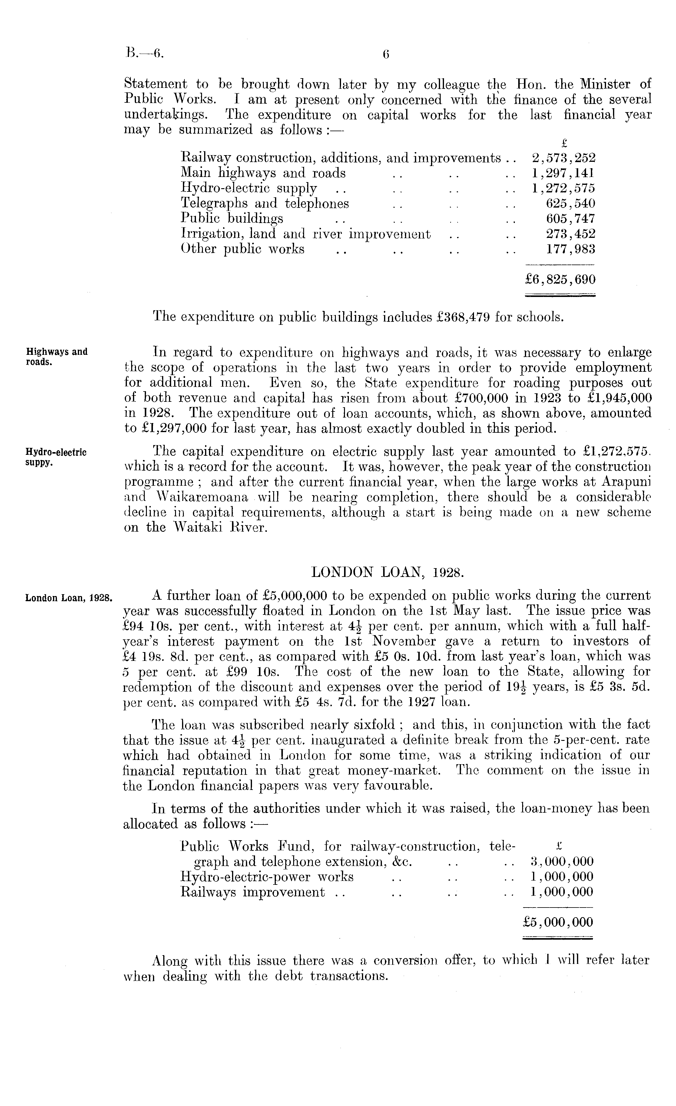 Statement to be brought down later by my colleague the Hon. the Minister of Public Works. I am at present only concerned with the finance of the several undertakings. The expenditure on capital works for the last financial year may be summarized as follows — £ Railway construction, additions, and improvements .. 2,573,252 Main highways and roads .. .. .. 1,297,141 Hydro-electric supply .. .. .. .. 1,272,575 Telegraphs and telephones . . . . 625,540 Public buildings . . . . . . 605,747 Irrigation, land and river improvement .. .. 273,452 Other public works .. .. .. .. 177,983 £6,825,690 The expenditure on public buildings includes £368,479 for schools. In regard to expenditure on highways and roads, it was necessary to enlarge the scope of operations in the last two years in order to provide employment for additional men. Even so, the State expenditure for roading purposes out of both revenue and capital has risen from about £700,000 in 1923 to £1,945,000 in 1928. The expenditure out of loan accounts, which, as sbown above, amounted to £1,297,000 for last year, has almost exactly doubled in this period. The capita] expenditure on electric supply last year amounted to £1,272,575. which is a record for the account. It was, however, the peak year of the construction programme ; and after the current financial year, when the large works at Arapuni and Waikaremoana will be nearing completion, there should be a considerable decline in capital requirements, although a start is being made on a new scheme on the Waitaki River. LONDON LOAN, 1928. A further loan of £5,000,000 to be expended on public works during the current year was successfully floated in London on the Ist May last. The issue price was £94 10s. per cent., with interest at 4-|- per cent, per annum, which with a full halfyear's interest payment on the Ist November gave a return to investors of £4 19s. Bd. per cent., as compared with £5 os. lOd. from last year's loan, which was 5 per cent, at £99 10s. The cost of the new loan to the State, allowing for redemption of the discount and expenses over the period of 19| years, is £5 3s. sd. per cent, as compared with £5 4s. 7d. for the 1927 loan. The loan was subscribed nearly sixfold ; and this, in conjunction with the fact that the issue at 4| per cent, inaugurated a definite break from the 5-per-cent. rate which had obtained in London for some time, was a striking indication of our financial reputation in that great money-market. The comment on the issue in the London financial papers was very favourable. In terms of the authorities under which it was raised, the loan-money has been allocated as follows : — Public Works Fund, for railway-construction, tele- £ graph and telephone extension, &c. . . . . 3 ,000,000 Hydro-electric-power works . . . . 1,000,000 Railways improvement . . . . . . 1,000,000 £5,000,000 Along with this issue there was a conversion offer, to which I will refer later when dealing with the debt transactions.