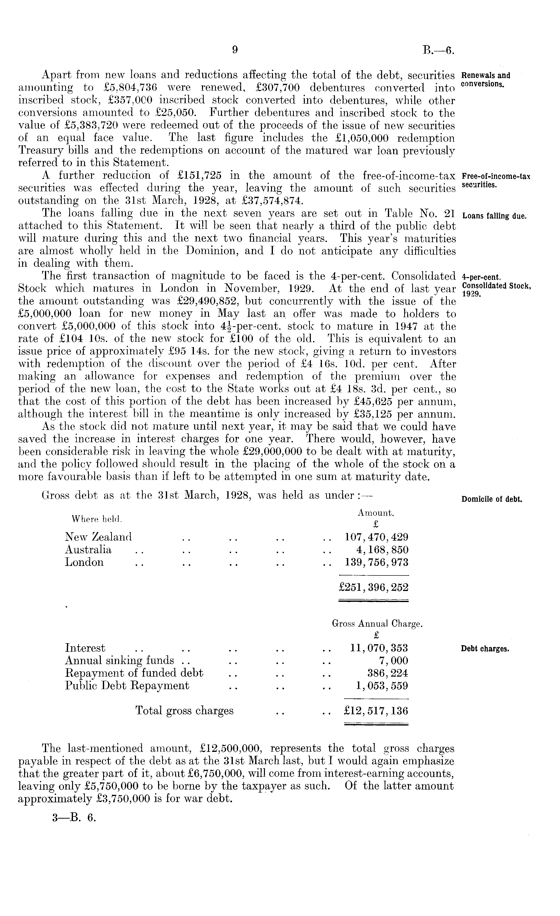 Apart from new loans and reductions affecting the total of the debt, securities amounting to £5,804,736 were renewed, £307,700 debentures converted into inscribed stock, £357,000 inscribed stock converted into debentures, while other conversions amounted to £25,050. Further debentures and inscribed stock to the value of £5,383,720 were redeemed out of the proceeds of the issue of new securities of an equal face value. The last figure includes the £1,050,000 redemption Treasury bills and the redemptions on account of the matured war loan previously referred to in this Statement. A further reduction of £151,725 in the amount of the free-of-income-tax securities was effected during the year, leaving the amount of such securities outstanding on the 31st March, 1928, at £37,574,874. The loans falling due in the next seven years are set out in Table No. 21 attached to this Statement. It will be seen that nearly a third of the public debt will mature during this and the next two financial years. This year's maturities are almost wholly held in the Dominion, and I do not anticipate any difficulties in dealing with them. The first transaction of magnitude to be faced is the 4-per-cent. Consolidated Stock which matures in London in November, 1929. At the end of last year the amount outstanding was £29,490,852, but concurrently with, the issue of the £5,000,000 loan for new money in May last an. offer was made to holders to convert £5,000,000 of this stock into 4-J-per-cent. stock to mature in 1947 at the rate of £104 10s. of the new stock for £100 of the old. This is equivalent to an issue price of approximately £95 14s. for the new stock, giving a return to investors with redemption of the discount over the period of £4 16s. lOd. per cent. After making an allowance for expenses and redemption of the premium over the period of the new loan, the cost to the State works out at £4 18s. 3d. per cent., so that the cost of this portion of the debt has been increased by £45,625 per annum, although the interest bill in the meantime is only increased by £35,125 per annum. As the stock did not mature until next year, it may be said that we could have saved the increase in interest charges for one year. There would, however, have been considerable risk in leaving the whole £29,000,000 to be dealt with at maturity, and the policy followed should result in the placing of the whole of the stock on a more favourable basis than if left to be attempted in one sum at maturity date. Gross debt as at the 31st March, 1928, was held as under :— Where held. Amo £ Ullt New Zealand :. .. .. .. 107,470,429 Australia . . . . .. .. . . 4,168,850 London .. .. .. .. .. 139,756,973 £251,396,252 Gross Annual Charge. £ Interest .. .. .. .. .. 11,070,353 Annual sinking funds .. .. .. .. 7,000 Repayment of funded debt . . .. .. 386,224 Public Debt Repayment .. .. .. 1,053,559 Total gross charges .. .. £12,517,136 The last-mentioned amount, £12,500,000, represents the total gross charges payable in respect of the debt as at the 31st March last, but I would again emphasize that the greater part of it, about £6,750,000, will come from interest-earning accounts, leaving only £5,750,000 to be borne by the taxpayer as such. Of the latter amount approximately £3,750,000 is for war debt.