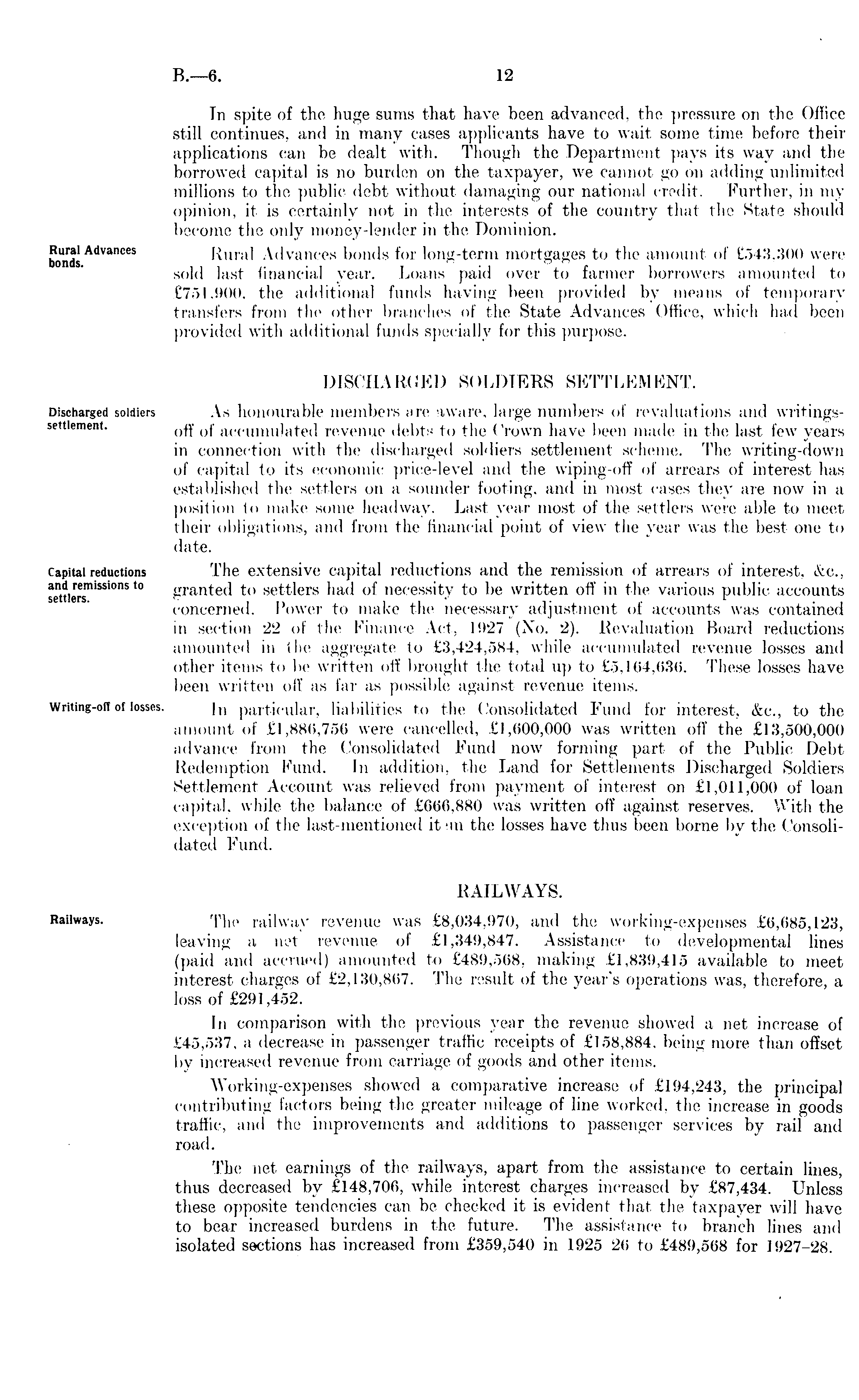 In spite of the huge sums that have been advanced, the pressure on the Office still continues, and in many cases applicants have to wait some time before their applications can be dealt with. Though the Department pays its way and the borrowed capital is no burden on the taxpayer, we cannot go on adding unlimited millions to the public debt without damaging our national credit. Further, in my opinion, it is certainly not in the interests of the country that the State should become the only money-lender in the Dominion. Rural Advances bonds for long-term mortgages to the amount of £543,300 were sold last financial year. Loans paid over to farmer borrowers amounted to £751,900, the additional funds having been provided by means of temporary transfers from the other branches of the State Advances Office, which had been provided with additional funds specialty for this purpose. DISCHARGED SOLDIERS SETTLEMENT. As honourable members a,re aware, large numbers of revaluations and writingsoff of accumulated revenue debts to the Crown have been made in the last few years in connection with the discharged soldiers settlement scheme. The writing-down of capital to its economic price-level and the wiping-off of arrears of interest has established the settlers on a sounder footing, and in most cases they are now in a position to make some headway. Last year most of the settlers were able to meet their obligations, and from the financial point of view the year was the best one to date. The extensive capital reductions and the remission of arrears of interest, &c., granted to settlers had of necessity to be written off in the various public accounts concerned. Power to make the necessary adjustment of accounts was contained in section 22 of the Finance Act, 1927 (No. 2). Revaluation Board reductions amounted in the aggregate to £3,424,584, while accumulated revenue losses and other items to be written off brought the total up to £5,164,636. These losses have been written off as far as possible against revenue items. In particular, liabilities to the Consolidated Fund for interest, &c., to the amount of £1,886,756 were cancelled, £1,600,000 was written off the £13,500,000 advance from the Consolidated Fund now forming part of the Public Debt Redemption Fund. In addition, the Land for Settlements Discharged Soldiers Settlement Account was relieved from payment of interest on £1,011,000 of loan capital, while the balance of £666,880 was written off against reserves. With the exception of the last-mentioned it mi the losses have thus been borne by the Consolidated Fund. RAILWAYS. The railway revenue was £8,034,970, and the working-expenses £6,685,123, leaving a net revenue of £1,349,847. Assistance to developmental lines (paid and accrued) amounted to £489,568, making £1,839,415 available to meet interest charges of £2,130,867. The result of the year's operations was, therefore, a loss of £291,452. In comparison with the previous year the revenue showed a net increase of £45,537, a decrease in passenger traffic receipts of £158,884, being more than offset by increased revenue from carriage of goods and other items. Working-expenses showed a comparative increase of £194,243, the principal contributing factors being the greater mileage of line worked, the increase in goods traffic, and the improvements and additions to passenger services by rail and road. The net earnings of the railways, apart from the assistance to certain lines, thus decreased by £148,706, while interest charges increased by £87,434. Unless these opposite tendencies can be checked it is evident that the taxpayer will have to bear increased burdens in the future. The assistance to branch lines and isolated sections has increased from £359,540 in 1925-26 to £489,568 for 1927-28.