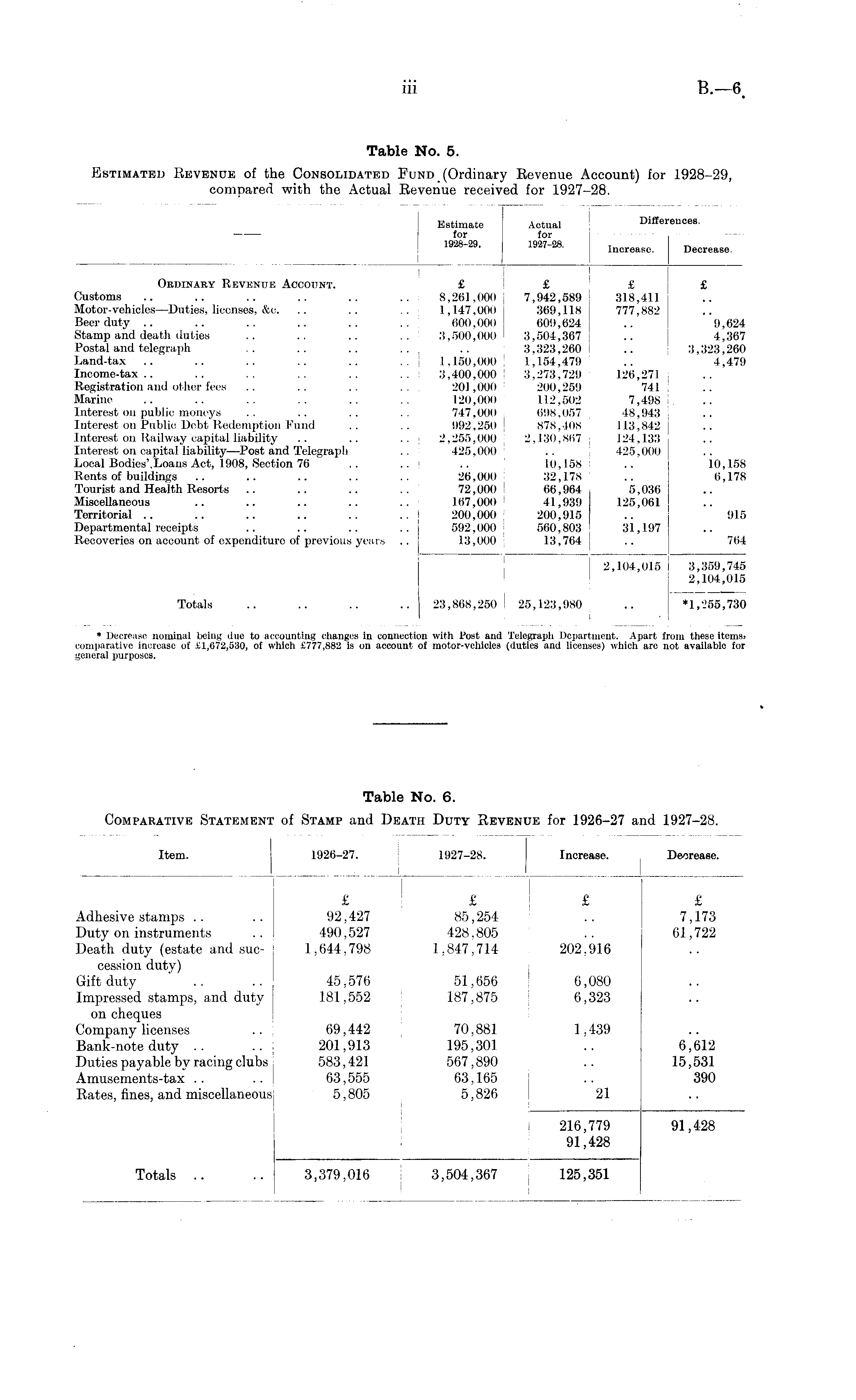 Table No. 5. Estimated Revenue of the Consolidated Fund (Ordinary Revenue Account) for 1928-29, compared with the Actual Revenue received for 1927-28.