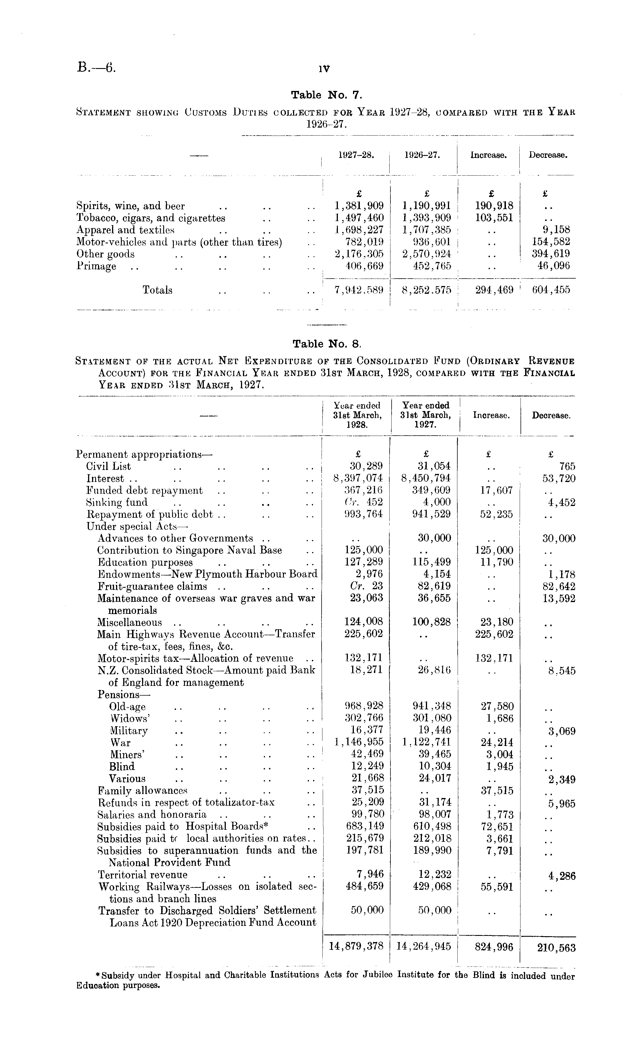 ( Year ended Year ended | 31st March, 31st March, Increase. Decrease. 1928. | 1927. Permanent appropriations—• £ £ £ £ Civil List .. .. .. .. 30,289 31,054 .. 765 Interest.. .. .. .. .. 8,397,074 8,450,794 .. 53,720 Funded debt repayment .. .. .. 367,216 349,609 17,607 Sinking fund .. .. .. .. Gr. 4-52 4,000 .. 4,452 Repayment of public debt .. .. .. 993,764 941,529 52,235 Under special Acts — Advances to other Governments .. .. .. 30,000 .. 30,000 Contribution to Singapore Naval Base .. 125,000 .. 125,000 Education purposes .. .. .. 127,289 115,499 11,790 Endowments —New Plymouth Harbour Board 2,976 4,154- .. 1,178 Fruit-guarantee claims .. .. .. Cr. 23 82,619 .. 82,642 Maintenance of overseas war graves and war 23,063 36,655 .. 13,592 memorials Miscellaneous .. .. .. .. 124,008 100,828 23,180 Main Highways Revenue Account—Transfer 225,602 .. 225,602 of tire-tax, fees, fines, &c. Motor-spirits tax —Allocation of revenue .. 132,171 .. 132,171 N.Z. Consolidated Stock —Amount paid Bank 18,271 26,816 .. 8,545 of England for management Pensions — Old-age .. .. .. .. 968,928 941,348 27,580 Widows' .. .. .. .. 302,766 301,080 1,686 Military .. .. .. .. 16,377 19,446 .. 3,069 War .. .. .. .. 1,146,955 1,122,741 24,214 Miners' .. .. .. .. 42,469 39,465 3,004 Blind .. .. .. .. 12,249 10,304 1,945 Various .. .. .. .. 21,668 24,017 i .. 2,349 Family allowances .. .. .. 37,515 .. 37,515 Refunds in respect of totalizator-tax .. 25,209 31,174 .. 5,965 Salaries and honoraria .. .. .. 99,780 98,007 1,773 Subsidies paid to Hospital Boards* .. 683,149 610,498 72,651 Subsidies paid tr local authorities on rates.. 215,679 212,018 3,661 Subsidies to superannuation funds and the 197,781 189,990 7,791 National Provident Fund Territorial revenue .. .. .. 7,946 12,232 .. 4,286 Working Railways —Losses on isolated sec- 484,659 429,068 55,591 tions and branch lines Transfer to Discharged Soldiers' Settlement 50,000 50,000 Loans Act 1920 Depreciation Fund Account 14,879,378 14,264,945 824,996 210,563 ♦Subsidy under Hospital and Charitable Institutions Acts for Jubilee Institute for the Blind is included under Eduoation purposes.