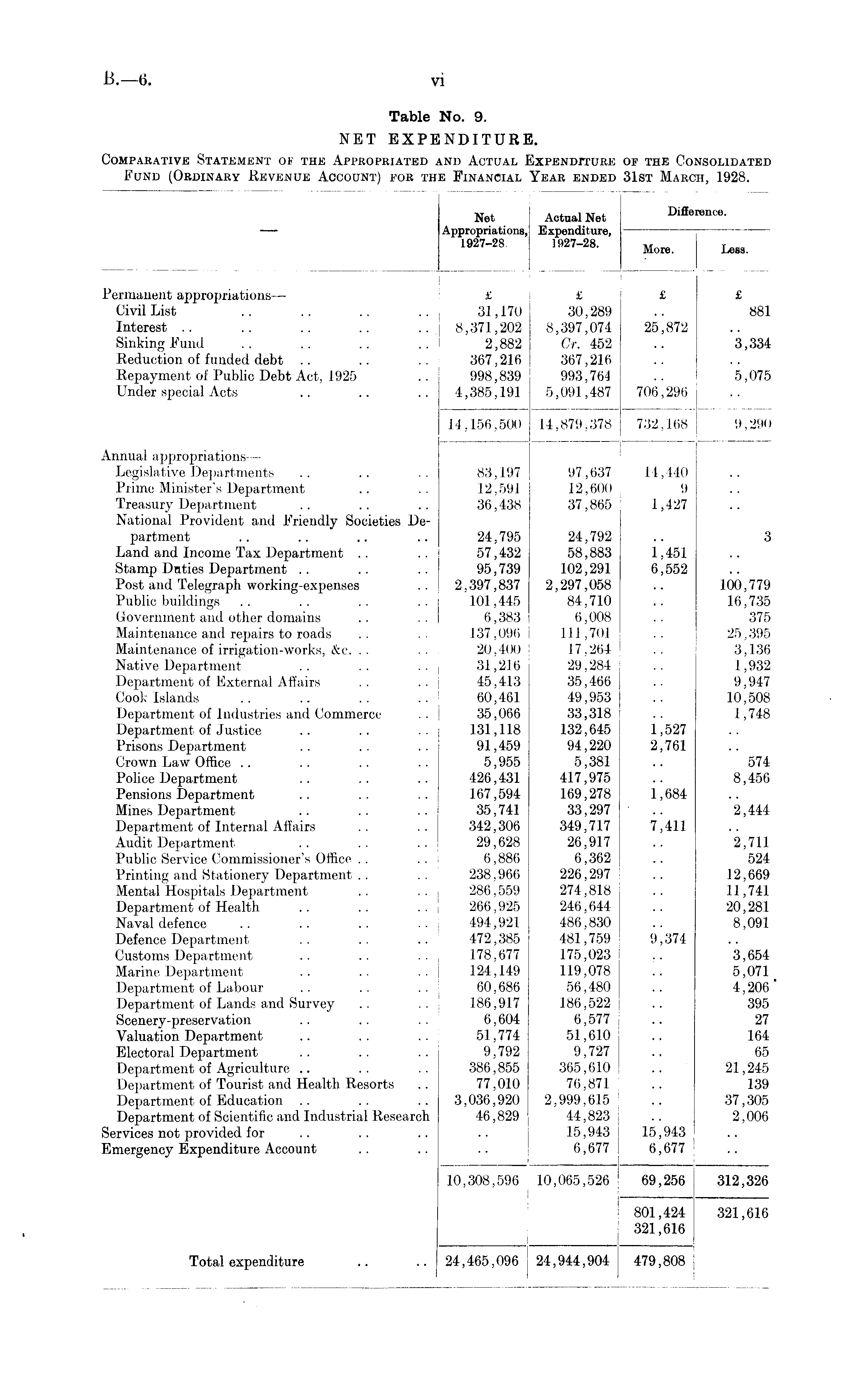 Table No. 9. NET EXPENDITURE. Comparative Statement of the Appropriated and Actual Expenditure of the Consolidated Fund (Ordinary Revenue Account) for the Financial Year ended 31st March, 1928.