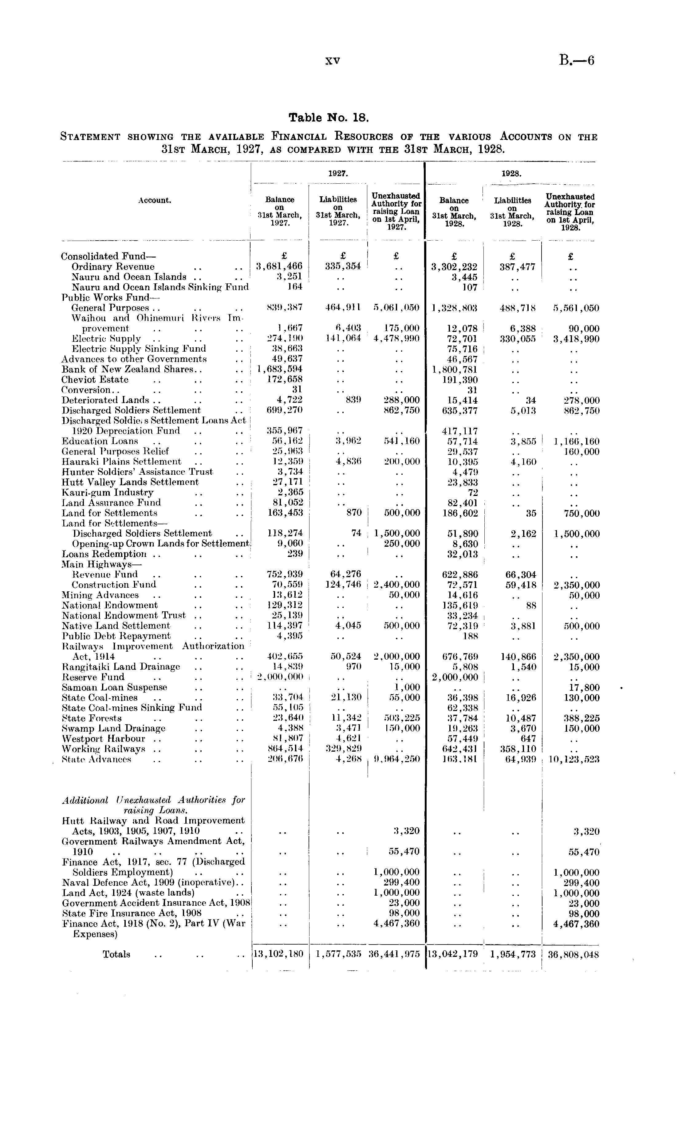 1927. 1928. Account. Balance j Liabilities Balance Liabilities 31st March, ; 31st March, i /'""j? 31st March, 31st March, Jj?2? 1927. j 1927. I on 1 1 S * 2^ pri1 ' 1928. 1928. on 1 ' j Consolidated Fund— £ £ £ £ j £ £ Ordinary Revenue .. .. 3,681,466 335,354 j .. 3,302,232 387,477 Nauru and Ocean Islands .. .. 3,251 .. .. 3,445 ! .. ! Nauru and Ocean Islands Sinking Fund 164 .. .. 107 Public Works Fund— General Purposes .. .. .. 839,387 464,911 5,061,050 1,328,803 488,718 5,561,050 Waihou and Ohinemuri Rivers Improvement .. .. .. 1,667 6,403 175,000 12,078 i 6,388 90,000 Electric Supply .. .. .. 274,190 141,064 4,478,990 72,701; 330,055 3,418,990 Electric Supply Sinking Fund .. ! 38,663 .. .. 75,716 j Advances to other Governments .. j 49,637 .. .. 46,567 Bank of New Zealand Shares.. .. 1,683,594 .. .. 1,800,781 Cheviot Estate .. .. .. 172,658 .. .. 191,390 Conversion.... .. .. I 31 .. .. 31 Deteriorated Lands .. .. .. 4,722 839 288,000 15,414 34 278,000 Discharged Soldiers Settlement .. : 699,270 .. 862,750 635,377 ! 5,013 862,750 Discharged Soldiei s Settlement Loans Act 1920 Depreciation Fund .. .. 355,967 .. .. 417,117 Education Loans .. .. .. 56,162 3,962 541,160 57,714 1 3,855 1,166,160 General Purposes Relief .. .. 25,963 .. .. 29,537 .. 160,000 Hauraki Plains Settlement % . .. 12,359 4,836 200,000 10,395 4,160 Hunter Soldiers'Assistance Trust .. 3,734 .. .. 4,479 Hutt Valley Lands Settlement .. 27,171 .. .. 23,833 Kauri-gum Industry .. .. 2,365 .. .. 72 Land Assurance Fund .. .. 81,052 .. .. 82,401 Land for Settlements .. .. 163,453 870 500,000 186,602 35 750,000 Land for Settlements — Discharged Soldiers Settlement .. 118,274 74 1,500,000 51,890 2,162 1,500,000 Opening-up Crown Lands for Settlement 9,060 .. 250,000 8,630 Loans Redemption .. .. .. 239 .. .. 32,013 Main Highways — Revenue Fund .. .. .. 752,939 64,276 .. 622,886 66,304 Construction Fund .. .. 70,559 124,746 2,400,000 72,571 59,418 2,350,000 Mining Advances .. .. .. 13,612 .. 50,000 14,616 .. 50,000 National Endowment .. .. 129,312 .. .. 135,619 88 National Endowment Trust .. .. 25,139 .. .. 33,234 i Native Land Settlement .. .. 114,397 4,045 500,000 72,319 3,881 500,000 Public Debt Repayment .. .. 4,395 .. .. 188 Railways Improvement Authorization Act, 1914 .. .. .. 402,655 50,524 2,000,000 676,769 140,866 2,350,000 Rangitaiki Land Drainage .. .. 14,839 970 15,000 5,808 1,540 15,000 Reserve Fund .. .. .. 2,000,000 .. .. 2,000,000 Samoan Loan Suspense .. .. .. .. 1,000 .. .. 17,800 State Coal-mines .. .. .. 33,704 21.130 55,000 36,398 16,926 130,000 State Coal-mines Sinking Fund .. 55,105 .. .. 62,338 I State Forests .. .. .. 23,640 11,342 503,225 37,784 10,487 388,225 Swamp Land Drainage .. .. 4,388 3,471 150,000 19,263 3,670 150,000 Westport Harbour .. .. .. 81,807 4,621 .. 57,449 ' 647 Working Railways .. .. .. 864,514 329,829 .. 642,431 ! 358,110 State Advances .. .. .. 206,676 4,268 9,964,250 163,181 : 64,939 10,123,523 Additional Unexhausted Authorities for raising Loans. Hutt Railway and Road Improvement Acts, 1903, 1905, 1907, 1910 .. .. .. 3,320 .. .. 3,320 Government Railways Amendment Act, 1910 .. .. .. .. .. .. ! 55,470 .. .. 55,470 Finance Act, 1917, sec. 77 (Discharged Soldiers Employment) .. .. .. .. 1,000,000 .. .. 1,000,000 Naval Defence Act, 1909 (inoperative).. .. .. 299,400 .. | .. 299,400 Land Act, 1924 (waste lands) .. .. .. 1,000,000 .. .. 1,000,000 Government Accident Insurance Act, 1908 .. .. 23,000 .. .. 23,000 State Fire Insurance Act, 1908 .. .. .. 98,000 .. .. 98,000 Finance Act, 1918 (No. 2), Part IV (War .. .. 4,467,360 .. .. 4,467,360 Expenses) Totals .. .. .. 13,102,180 1,577,535 36,441,975 13,042,179 1,954,773 I 36,808,048