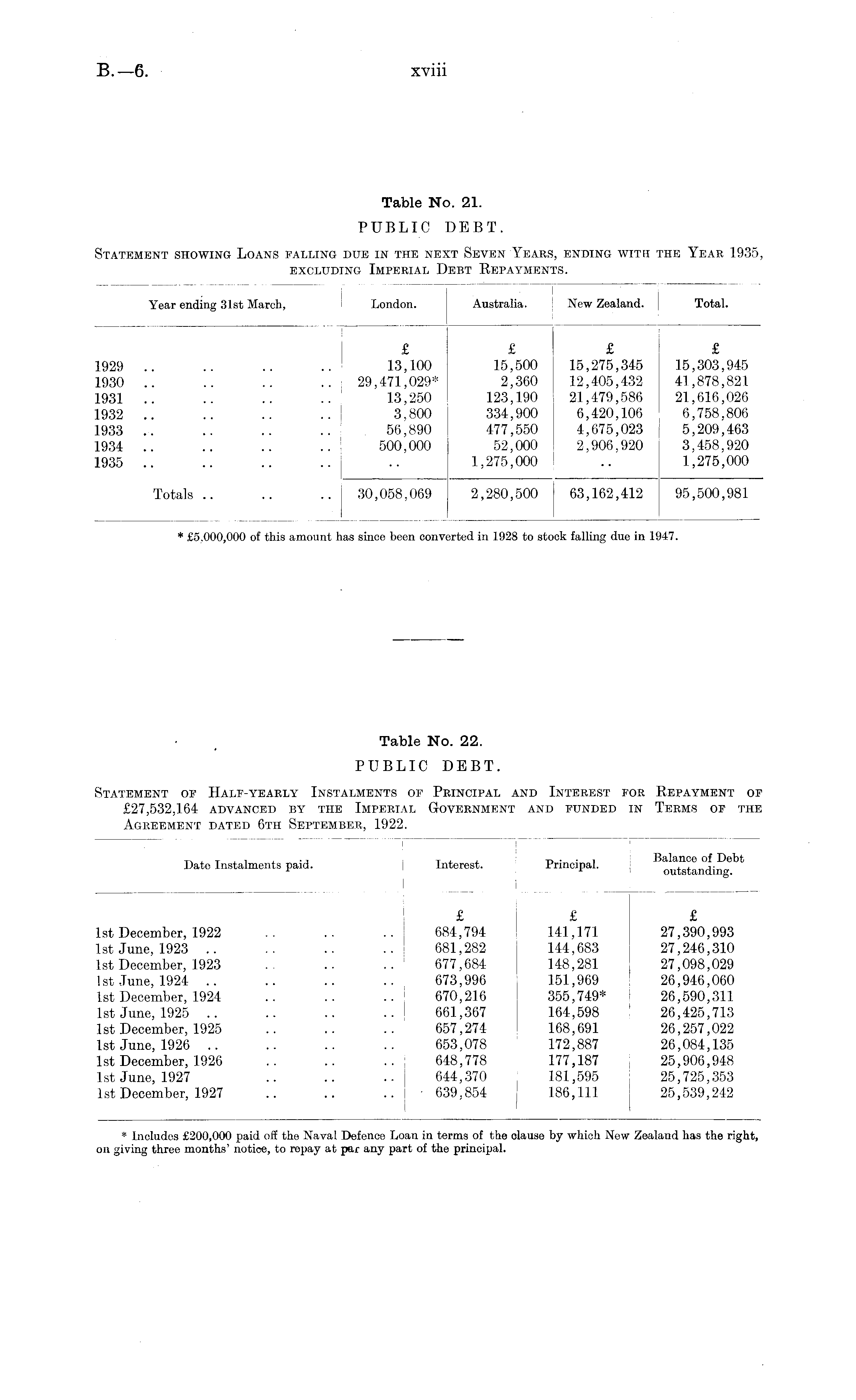 Table No. 22. PUBLIC DEBT. Statement of Half-yearly Instalments of Principal and Interest for Repayment of £27,532,164 advanced by the Imperial Government and funded in Terms of the Agreement dated 6th September, 1922.