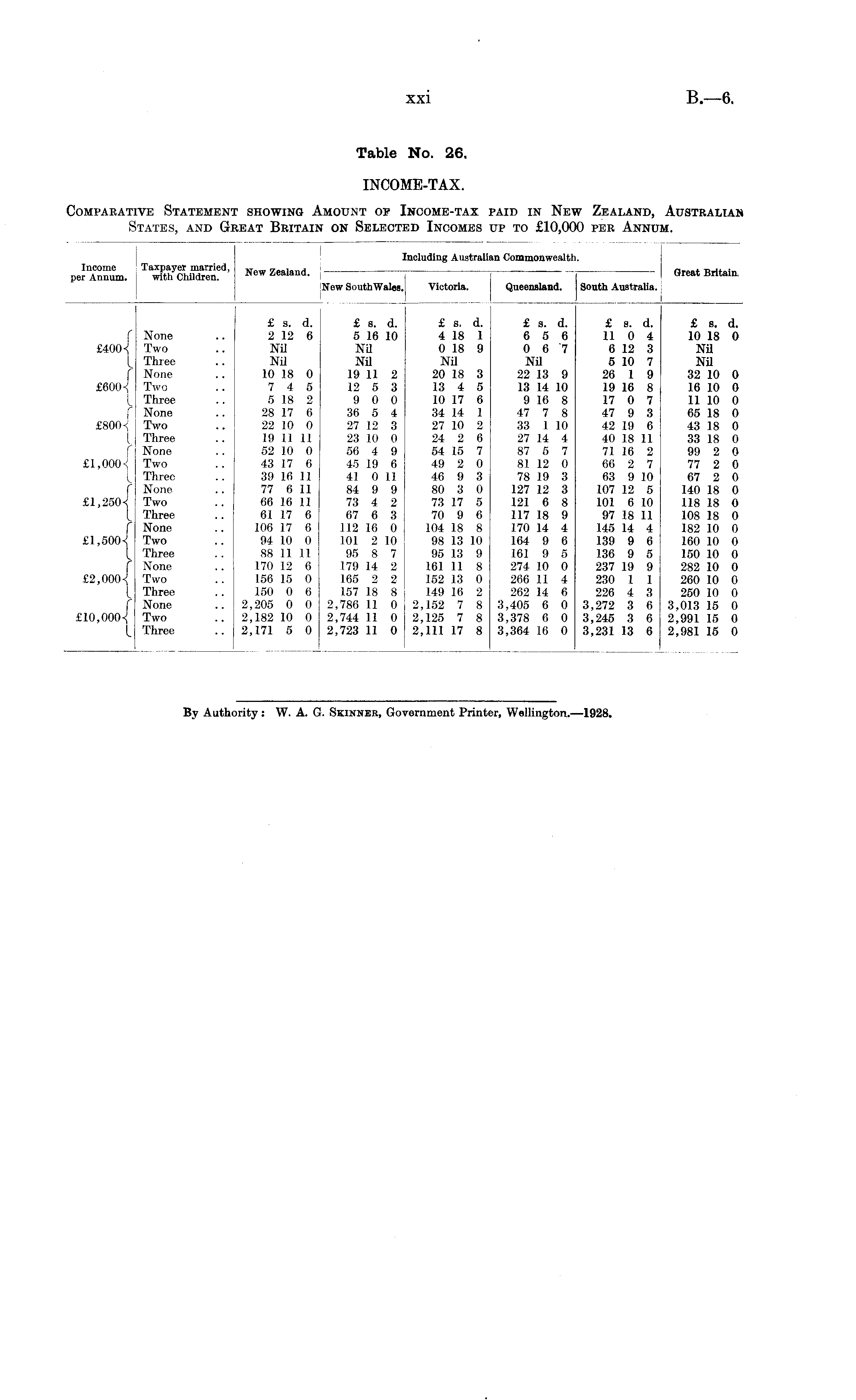 Table No. 26. INCOME-TAX. Comparative Statement showing Amount of Income-tax paid in New Zealand, Australian States, and Great Britain on Selected Incomes up to £10,000 per Annum.