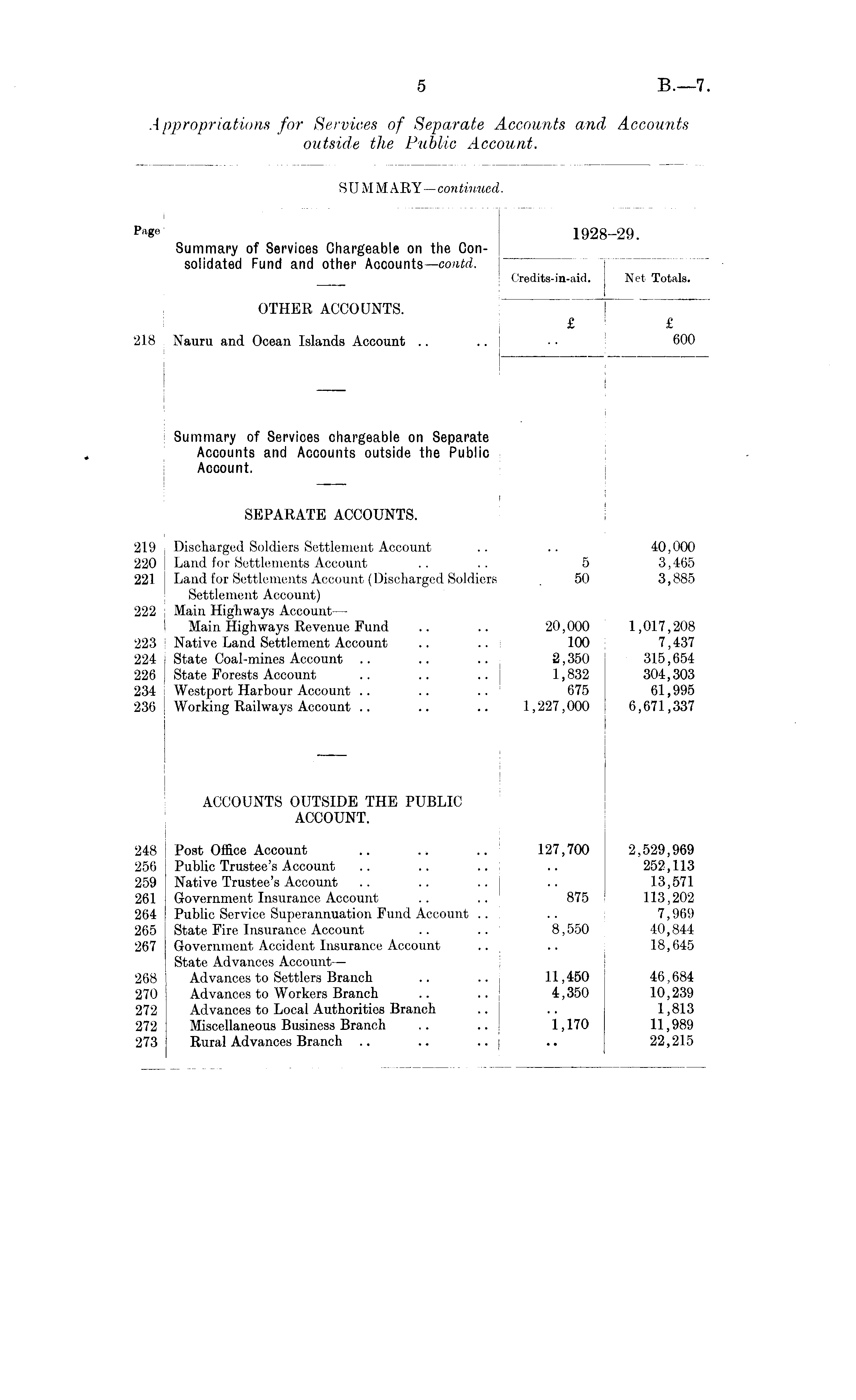 P(1 «° 1928-29. Summary of Services Chargeable on the Consolidated Fund and other Accounts —contd. Credits-in-aid. Net Totals. OTHER ACCOUNTS. £ £ 218 Nauru and Ocean Islands Account .. .. • • 600 Summary of Services chargeable on Separate Accounts and Accounts outside the Public Account. SEPARATE ACCOUNTS. 219 Discharged Soldiers Settlement Account .. .. 40,000 220 Land for Settlements Account .. .. 5 3,465 221 Land for Settlements Account (Discharged Soldiers 50 3,885 Settlement Account) 222 Main Highways Account — Main Highways Revenue Fund .. .. 20,000 1,017,208 223 Native Land Settlement Account .. .. 100 7,437 224 State Coal-mines Account .. .. .. 2,350 315,654 226 State Forests Account .. .. .. 1,832 304,303 234 Westport Harbour Account .. .. .. 675 61,995 236 Working Railways Account .. .. .. 1,227,000 6,671,337 ACCOUNTS OUTSIDE THE PUBLIC ACCOUNT. 248 Post Office Account .. . .. 127,700 2,529,969 256 Public Trustee's Account .. .. .. .. 252,113 259 Native Trustee's Account .. .. .. .. 13,571 261 Government Insurance Account .. .. 875 113,202 264 Public Service Superannuation Fund Account .. .. 7,969 265 State Fire Insurance Account .. .. 8,550 40,844 267 Government Accident Insurance Account .. .. 18,645 State Advances Account — 268 Advances to Settlers Branch .. .. 11,450 46,684 270 Advances to Workers Branch .. .. 4,350 10,239 272 Advances to Local Authorities Branch .. .. 1,813 272 Miscellaneous Business Branch .. .. 1,170 11,989 273 Rural Advances Branch .. .. .. .. 22,215