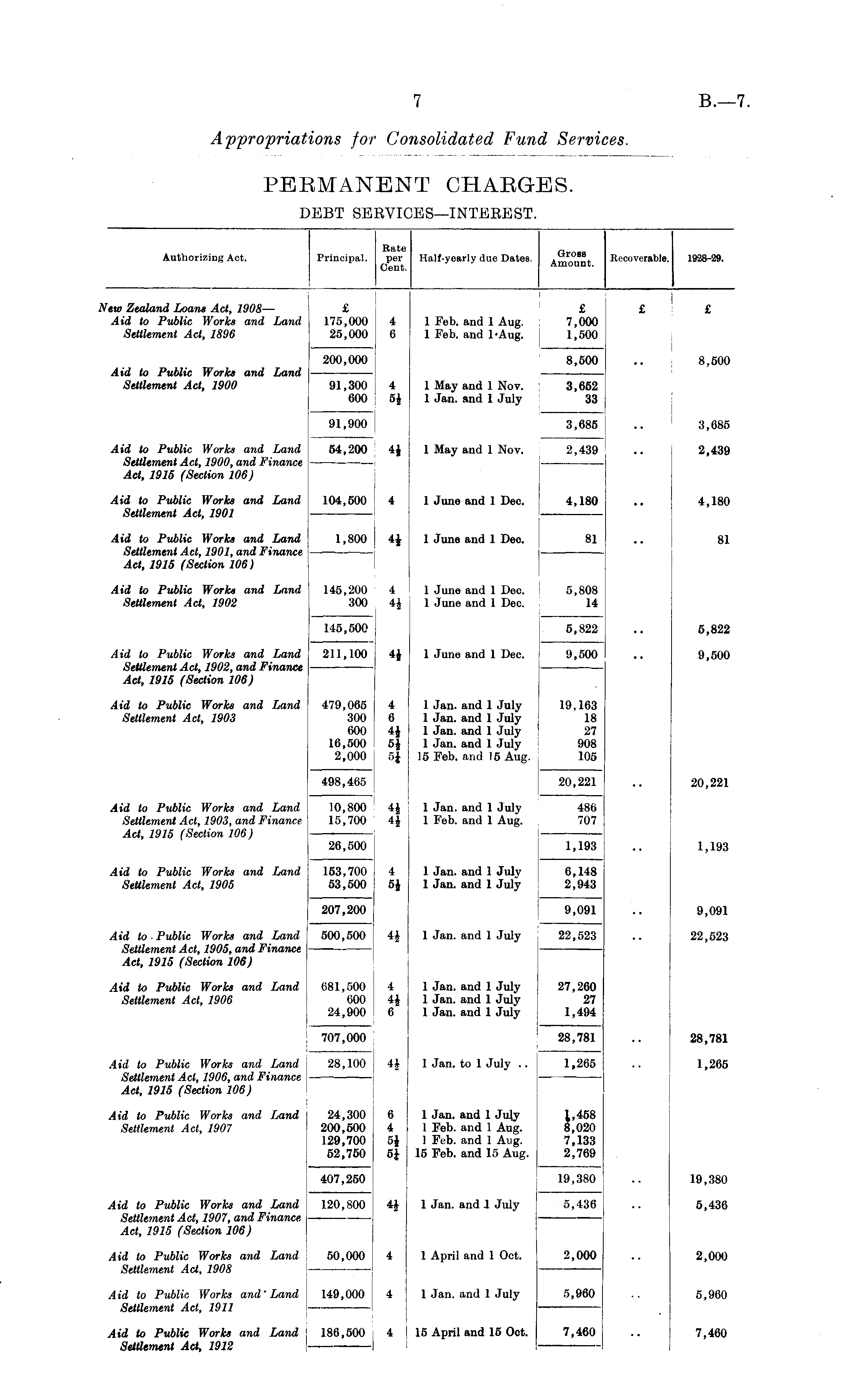 Rate r Authorizing Act. Principal. per Half-yearly due Dates. Recoverable. 1928-29. Cent. Amount. New Zealand Loans Act, 1908 — £ £ £ £ Aid to Public Works and Land 175,000 4 1 Feb. and 1 Aug. 7,000 Settlement Act, 1896 25,000 6 1 Feb. and l*Aug. 1,500 200,000 8,500 .. 8,500 Aid to Public Works and Land Settlement Act, 1900 91,300 4 1 May and 1 Nov. 3,652 600 5J 1 Jan. and 1 July 33 91,900 ! 3,685 .. 3,685 Aid to Public Works and Land 54,200 4| j 1 May and 1 Nov. 2,439 .. 2,439 Settlement Act, 1900, and Finance Act, 1915 (Section 106) Aid to Public Works and Land 104,500 4 1 June and 1 Dec. 4,180 .. 4,180 Settlement Act, 1901 I Aid to Public Works and Land 1,800 4J 1 June and 1 Deo. j 81 81 Settlement Act, 1901, and Finance — Act, 1915 (Section 106) Aid to Public Works and Land 145,200 4 1 June and 1 Deo. 5,808 Settlement Act, 1902 300 4J 1 June and 1 Dec. 14 145,500 5,822 .. 5,822 Aid to Public Works and Land 211,100 4J 1 June and 1 Dec. 9,500 .. 9,500 Settlement Act, 1902, and Finance Act, 1915 (Section 106) Aid to Public Works and Land 479,065 4 1 Jan. and 1 July 19,163 Settlement Act, 1903 300 6 1 Jan. and 1 July 18 600 4£ 1 Jan. and 1 July 27 16,500 5J 1 Jan. and 1 July 908 2,000 5J 15 Feb. and 15 Aug. 105 498,465 20,221 .. 20,221 Aid to Public Works and Land 10,800 4J 1 Jan. and 1 July 486 Settlement Act, 1903, and Finance 15,700 4| | 1 Feb. and 1 Aug. 707 Act, 1915 (Section 106) 26,500 1,193 .. 1,193 Aid to Public Works and Land 153,700 4 1 Jan. and 1 July 6,148 Settlement Act, 1905 53,500 5$ 1 Jan. and 1 July 2,943 207,200 9,091 .. 9,091 Aid to Public Works and Land 500,500 4£ 1 Jan. and 1 July 22,523 .. 22,523 Settlement Act, 1905, and Finance Act, 1915 (Section 106) Aid to Public Works and Land 681,500 4 1 Jan. and 1 July 27,260 Settlement Act, 1906 600 4J 1 Jan. and 1 July 27 24,900 6 1 Jan. and 1 July 1,494 707,000 | 28,781 .. 28,781 Aid to Public Works and Land 28,100 1 Jan. to 1 July .. 1,265 .. 1,265 Settlement Act, 1906, and Finance Act, 1915 (Section 106) Aid to Public Works and Land 24,300 6 1 Jan. and 1 July 1,458 Settlement Act, 1907 200,500 4 1 Feb. and 1 Aug. 8,020 129,700 5J 1 Feb. and 1 Aug. 7,133 52,750 5J 15 Feb. and 15 Aug. 2,769 407,250 ■ 19,380 .. 19,380 Aid to Public Works and Land 120,800 4J 1 Jan. and J July 5,436 .. 6,436 Settlement Act, 1907, and Finance Act, 1915 (Section 106) Aid to Public Works and Land 50,000 4 1 April and 1 Oct. 2,000 .. 2,000 Settlement Act, 1908 — Aid to Public Works and" Land 149,000 4 1 Jan. and 1 July 5,960 .. 5,960 Settlement Act, 1911 Aid to Public Works and Land 186,500 4 15 April and 15 Oct. 7,460 .. 7,460 Settlement Act, 1912 — '