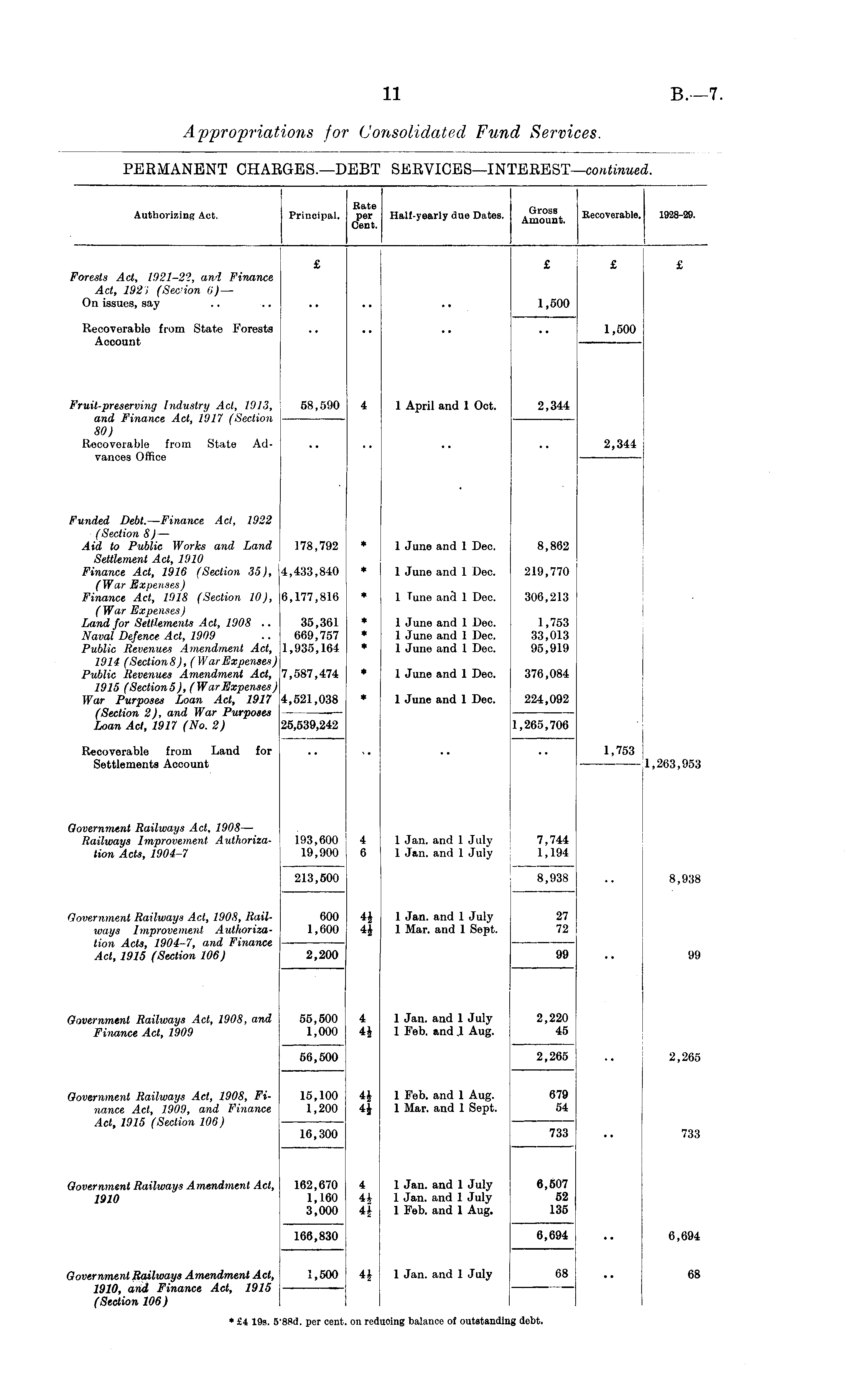 Rfl>t6 fivn^R Authorizing Act. Principal. per Half-yearly due Dates. Amount Recoverable. 1928-29. Cent. £ £ £ £ Forests Act, 1921-22, and Finance Act, 1923 (Section 6) — On issues, say .. .. .. .. .. 1,500 Recoverable from State Forests .. .. .. .. 1,500 Account Fruit-preserving Industry Act, 1913, 58,590 4 1 April and 1 Oct. 2,344 and Finance Act, 1917 (Section 80) Recoverable from State Ad- .. .. .. .. 2,344 vances Office Funded Debt.—Finance Act, 1922 (Section 8) — Aid to Public Works and Land 178,792 * 1 June and 1 Dec. 8,862 Settlement Act, 1910 Finance Act, 1916 (Section 35), 4,433,840 * 1 June and 1 Dec. 219,770 (War Expenses) Finance Act, 1918 (Section 10), 6,177,816 * 1 Tune anci 1 Dec. 306,213 (War Expenses) Land for Settlements Act, 1908 •• 35,361 * 1 June and 1 Dec. 1,753 Naval Defence Act, 1909 .. 669,757 * 1 June and 1 Dec. 33,013 Public Revenues Amendment Act, 1,935,164 * 1 June and 1 Dec. 95,919 1914 (Section8), (WarExpenses) Public Revenues Amendment Act, 7,587,474 * 1 June and 1 Dec. 376,084 1915 (Section5), (WarExpenses) War Purposes Loan Act, 1917 4,521,038 * 1 June and 1 Dec. 224,092 (Section 2), and War Purposes Loan Act, 1917 (No. 2) 25,539,242 1,265,706 Recoverable from Land for .. ,. .. .. 1,753 Settlements Account |l,263,953 Government Railways Act, 1908 — Railways Improvement Authoriza- 193,600 4 1 Jan. and 1 July 7,744 lion Acts, 1904-7 19,900 6 1 Jan. and 1 July 1,194 213,500 8,938 .. 8,938 Government Railways Act, 1908, Rail- 600 4£ 1 Jan. and 1 July 27 ways Improvement Authoriza- 1,600 4J 1 Mar. and 1 Sept. 72 tion Acts, 1904-7, and Finance Act, 1915 (Section 106) 2,200 99 99 Government Railways Act, 1908, and 55,500 4 1 Jan. and 1 July 2,220 Finance Act, 1909 1,000 4| 1 Feb. and .1 Aug. 45 56,500 2,265 .. 2,265 Government Railways Act, 1908, Fi- 15,100 4| 1 Feb. and 1 Aug. 679 nance Act, 1909, and Finance 1,200 4 i 1 Mar. and 1 Sept. 54 j Act, 1915 (Section 106) 16,300 733 .. 733 Government Railways Amendment Act, 162,670 4 1 Jan. and 1 July 6,507 19X0 1,160 44 1 Jan. and 1 July 52 3,000 1 Feb. and 1 Aug. 135 166,830 6,694 .. 6,694 Government Railways Amendment Act, 1,500 44 1 Jan. and 1 July 68 .. 68 1910, arid Finance Act, 1915 — (Section 106) * £4 19s. 5'88d. per cent, on reducing balance of outstanding debt.