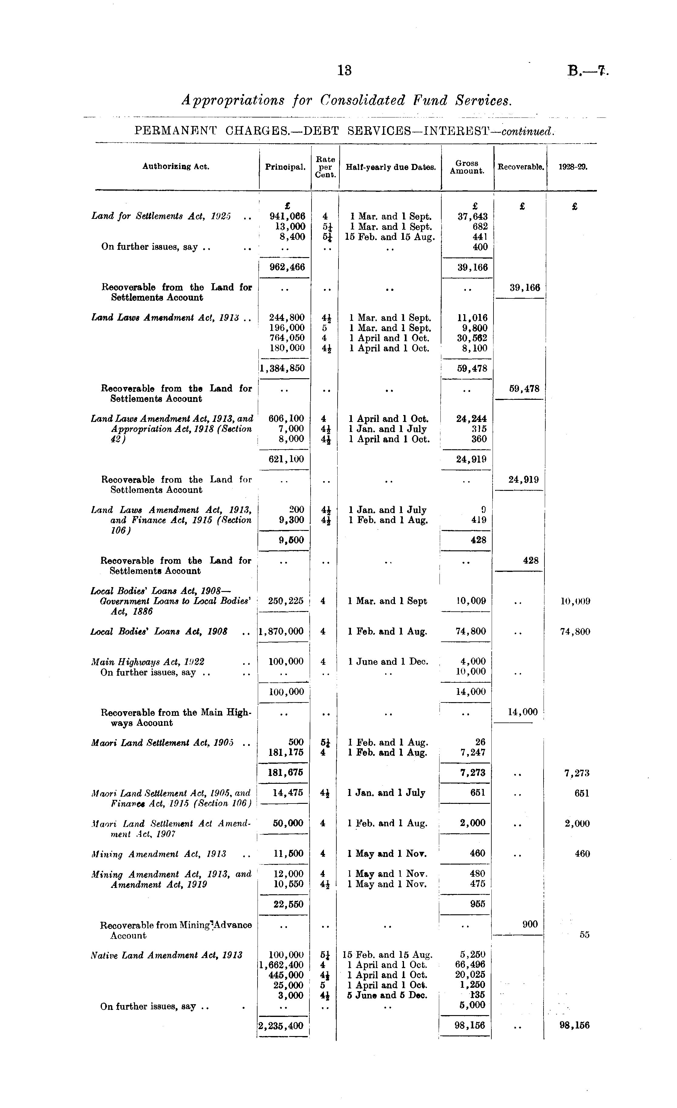 R fc t' P|*AQQ Authorizing Act. Principal. per Half-yearly due Dates. Amount Recoverable. 1928-29. £ £ £ £ Land for Settlements Act, 1925 .. 941,066 4 1 Mar. and 1 Sept. 37,643 13,000 5J 1 Mar. and 1 Sept. 682 8,400 5£ 15 Feb. and 15 Aug. 441 On further issues, say .. .. .. .. .. 400 962,466 39,166 Recoverable from the Land for .. .. .. .. 39,166 Settlements Account Land Laws Amendment Ac!, 1913 .. 244,800 4£ 1 Mar. and 1 Sept. 11,016 196,000 5 1 Mar. and 1 Sept. 9,800 1 764,050 4 1 April and 1 Oct. 30,562 180,000 4£ 1 April and 1 Oct. | 8,100 I 1,384,850 59,478 Recoverable from the Land for .. .. .. .. 59,478 Settlements Account Land Laws Amendment Act, 1913, and 606,100 4 1 April and 1 Oct. 24,244 Appropriation Act, 1918 (Section 7,000 4£ 1 Jan. and 1 July 315 42) 8,000 4J 1 April and 1 Oct. 360 ! 621,100 24,919 Recoverable from the Land for j .. .. .. 24,919 Settlements Acoount ■ Land Laws Amendment Act, 1913, 200 4£ 1 Jan. and 1 July 0 and Finance Act, 1915 (Section 9,300 4J 1 Feb. and 1 Aug. 419 106) 9,500 428 Recoverable from the Land for .. .. .. .. 428 Settlements Account 1 Local Bodies' Loans Act, 1908 — Government Loans to Local Bodies' 250,225 4 1 Mar. and 1 Sept 10,009 .. 10,009 Act, 1886 — — Local Bodies' Loans Act, 1908 .. 1,870,000 4 1 Feb. and 1 Aug. 74,800 .. 74,800 Main Highways Act, 1922 .. 100,000 4 j 1 June and 1 Dec. 4,000 On further issues, say .. .. .. .. .. 10,000 100,000 14,000 Recoverable from the Main High- .. .. .. .. 14,000 ways Acoount — — Maori Land Settlement Act, 1905 .. 500 5J j 1 Feb. and 1 Aug. 26 181,175 4 1 Feb. and 1 Aug. 7,247 181,675 7,273 .. 7,273 Maori Land Settlement Act, 1905, and 14,475 4 i 1 Jan. and 1 July 651 .. 651 Finance Act, 1915 (Section 106) Maori Land Settlement Act Amend- 50,000 4 1 Feb. and 1 Aug. 2,000 .. 2,000 ment Act, 1907 I j Mining Amendment Act, 1913 .. 1 11,500 4 1 May and 1 Nov. 460 .. 460 Mining Amendment Act, 1913, and 12,000 4 1 May and 1 Nov. 480 Amendment Act, 1919 10,550 4| 1 May and 1 Nov. 475 22,550 955 Recoverable from .. .. .. .. 900 Account 55 Native Land Amendment Act, 1913 100,000 n} 15 Feb. and 15 Aug. 5,250 1,662,400 4 1 April and 1 Oct. 66,496 445,000 4J 1 April and 1 Oct. 20,025 25,000 5 1 April and 1 Oct. 1,250 3,000 4$ 5 June and 5 Dec. 135 On further issues, say .. . .. .. 5,000 2,235,400 98,156 .. 98,156