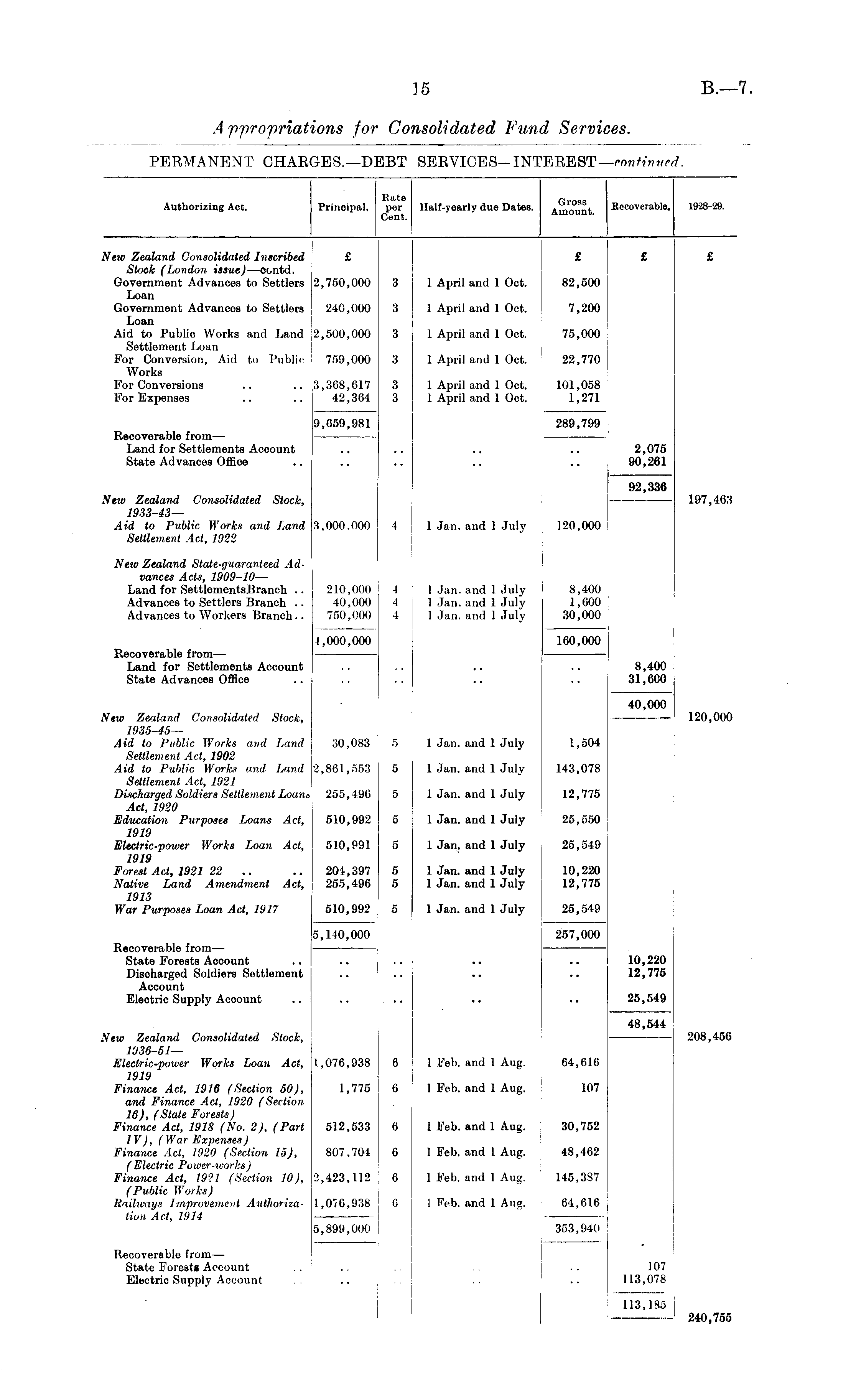 Rate frrrtSR Authorizing Act. Principal. per Half-yearly due Dates. . Recoverable. 19-28-29. Cent. amount. New Zealand Consolidated Inscribed £ £ £ £ Stock (London issue) —oontd. Government Advances to Settlers 2,750,000 3 1 April and 1 Oct. 82,500 Loan Government Advances to Settlers 240,000 3 1 April and 1 Oct. 7,200 Loan Aid to Public Works and Land 2,500,000 3 1 April and 1 Oct. 75,000 Settlement Loan For Conversion, Aid to Public 759,000 3 1 April and 1 Oct. 22,770 Works For Conversions .. .. 3,368,617 3 1 April and 1 Oct. 101,058 For Expenses .. .. 42,364 3 1 April and 1 Oct. 1,271 9,659,981 289,799 Recoverable from— Land for Settlements Account .. .. .. .. 2,075 State Advances Office .. .. .. .. .. 90,261 92,336 New Zealand Consolidated Stock, 197,463 1933-43 — Aid to Public Works and Land 3,000.000 4 1 Jan. and 1 July 120,000 Settlement Act, 1922 New Zealand State-guaranteed Advances Acts, 1909-10 — Land for SettlementsBranch .. 210,000 4 1 Jan. and 1 July 8,400 Advances to Settlers Branch .. 40,000 4 1 Jan. and 1 July 1,600 Advances to Workers Branch.. 750,000 4 1 Jan. and 1 July 30,000 4,000,000 160,000 Recoverable from — Land for Settlements Account .. .. .. .. 8,400 State Advances Office .. .. .. .. .. 31,600 40,000 New Zealand Consolidated Stock, 120,000 1935-45 — Aid to Public Works and Land 30,083 5 1 Jan. and 1 July 1,504 Settlement Act, 1902 Aid to Public Works and Land 2,861,553 5 1 Jan. and 1 July 143,078 Settlement Act, 1921 Discharged Soldiers Settlement Loans 255,496 5 1 Jan. and 1 July 12,775 Act, 1920 Education Purposes Loans Act, 510,992 5 1 Jan. and 1 July 25,550 1919 Electric-power Works Loan Act, 510,991 5 1 Jan. and 1 July 25,549 1919 Forest Act, 1921-22 .. .. 204,397 5 1 Jan. and 1 July 10,220 Native Land Amendment Act, 255,496 5 1 Jan. and 1 July 12,775 1913 War Purposes Loan Act, 1917 510,992 5 1 Jan. and 1 July 25,549 5,140,000 257,000 Recoverable from — State Forests Account .. .. .. .. .. 10,220 Discharged Soldiers Settlement .. .. .. .. 12,775 Account Electric Supply Account .. .. .. .. •. 25,549 48,544 New Zealand Consolidated Stock, 208,456 1936-51— Electric-power Works Loan Act, 1,076,938 6 1 Feb. and 1 Aug. 64,616 1919 Finance Act, 1916 (Section 50), 1,775 6 1 Feb. and 1 Aug. 107 and Finance Act, 1920 (Section 16), (State Forests) Finance Act, 1918 (No. 2), (Part 512,533 6 1 Feb. and 1 Aug. 30,752 IV), (War Expenses) Finance Act, 1920 (Section 15), 807,704 6 1 Feb. and 1 Aug. 48,462 (Electric Power-works) Finance Act, 1921 (Section 10), 2,423,112 6 1 Feb. and 1 Aug. 145,387 (Public Works) Railways Improvement Authoriza- 1,076,938 6 1 Feb. and 1 Aug. 64,616 tion Act, 1914 5,899,000 353,940 Recoverable from— State Forests Account .. .. 107 Electric Supply Account .. .. 113,078 113,185 I 240,755