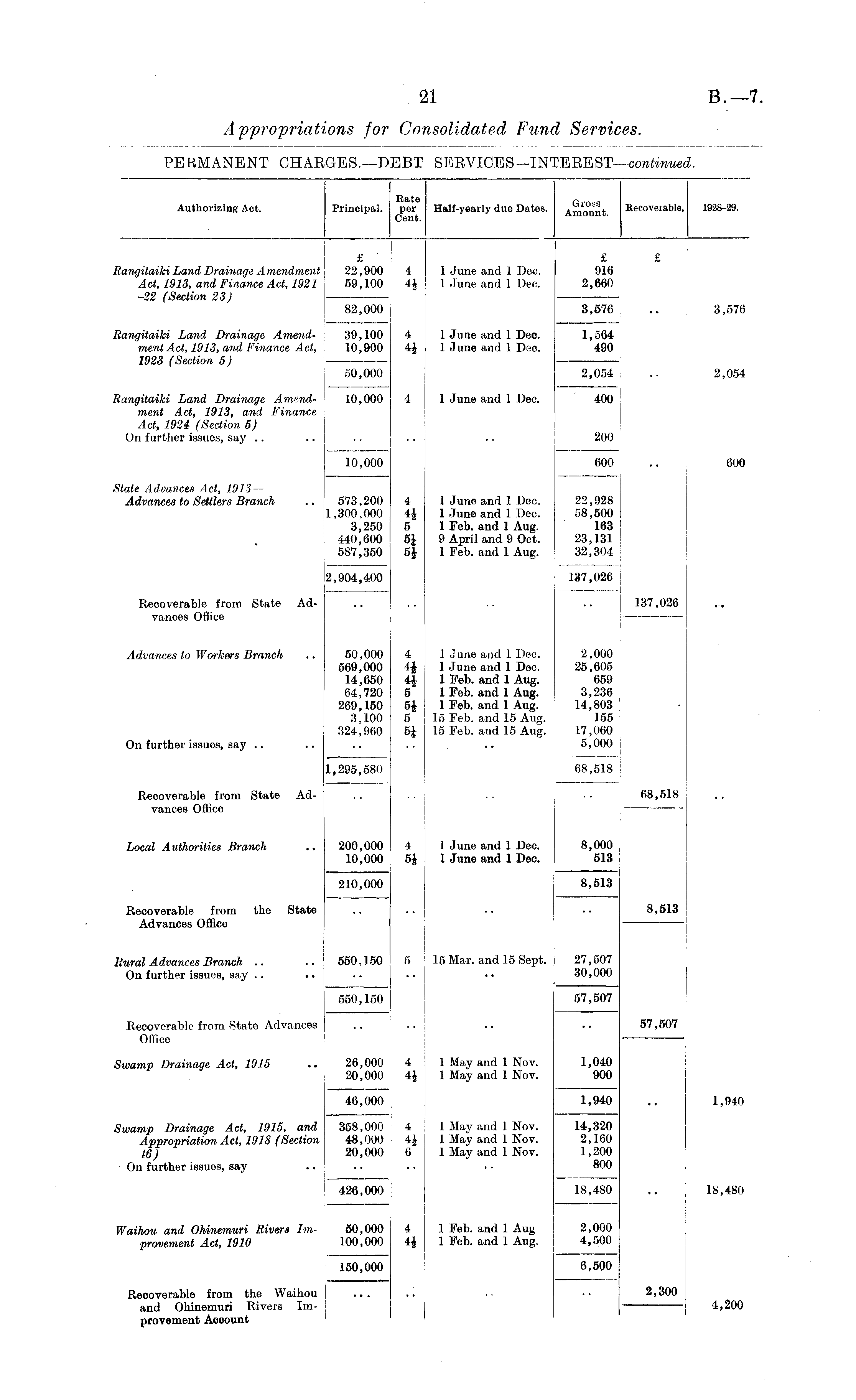 i{ clt 0 (* 1 Authorizing Act. Principal. per Half-yearly due Dates. Amount Recoverable. 1928-29. Cent. £ £ £ Rangitaiki Land Drainage Amendment 22,900 4 1 June and 1 Dec. 916 Act, 1913, and Finance Act, 1921 59,100 4J 1 June and 1 Dee. 2,660 -22 (Section 23) 82,000 3,576 .. 3,576 Rangitaiki Land Drainage Amend- 39,100 4 1 June and 1 Deo. 1,564 ment Act, 1913, and Finance Act, 10,900 4J 1 June and 1 Dec. 490 1923 (Section 5) 50,000 2,054 .. 2,054 Rangitaiki Land Drainage Amend- 10,000 4 1 June and 1 Dec. 400 ment Act, 1913, and Finance Act, 1924 (Section 5) On further issues, say .. .. .. .. .. 200 10,000 600 .. 600 Stale Advances Act, 1913 — Advances to Settlers Branch .. 573,200 4 1 June and 1 Dee. 22,928 1,300,000 4J 1 June and 1 Dec. 58,500 3,250 5 1 Feb. and 1 Aug. 163 ; 440,600 5£ 9 April and 9 Oct. j 23,131 ; 587,350 u| 1 Feb. and 1 Aug. | 32,304 137,026 I 1 Recoverable from State Ad- .. .. • .. 137,026 ... vances Office Advances to Workers Branch .. 50,000 4 1 June and 1 Dec. 2,000 569,000 4% 1 June and 1 Dec. 25,605 14,650 4£ 1 Feb. and 1 Aug. 659 64,720 5 1 Feb. and 1 Aug. 3,236 269,150 5J 1 Feb. and 1 Aug. 14,803 3,100 5 15 Feb. and 15 Aug. 155 324,960 5J 15 Feb. and 15 Aug. 17,060 On further issues, say .. .. .. .. .. 5,000 1,295,580 68,518 Recoverable from State Ad- .. 68,518 vances Office I —■— Local Authorities Branch .. 200,000 4 1 June and 1 Dec. 8,000 10,000 5J 1 June and 1 Dec. 513 210,000 8,513 Recoverable from the State .. .. •• .. 8,513 Advances Office Rural Advances Branch .. .. 550,150 5 15 Mar. and 15 Sept. 27,507 On further issues, say .. .. .. •• •• 30,000 550,150 57,507 Recoverable from State Advances .. .. .. .. 57,507 Office Swamp Drainage Act, 1915 .. 26,000 4 1 May and 1 Nov. 1,040 20,000 1 May and 1 Nov. 900 46,000 1,940 .. 1,940 Swamp Drainage Act, 1915, and 358,000 4 1 May and 1 Nov. 14,320 Appropriation Act, 1918 (Section 48,000 41 1 May and 1 Nov. 2,160 IS) 20,000 6 1 May and 1 Nov. 1,200 On further issues, say .. .. .. . ■ 800 426,000 18,480 .. 18,480 Waihou and Ohinemuri Rivers Im- 50,000 4 1 Feb. and 1 Aug 2,000 provement Act, 1910 100,000 1 Feb. and 1 Aug. 4,500 150,000 6,500 Recoverable from the Waihou ... .. •• 2,300 and Ohinemuri Rivers Im- 4,200 provement Acoount