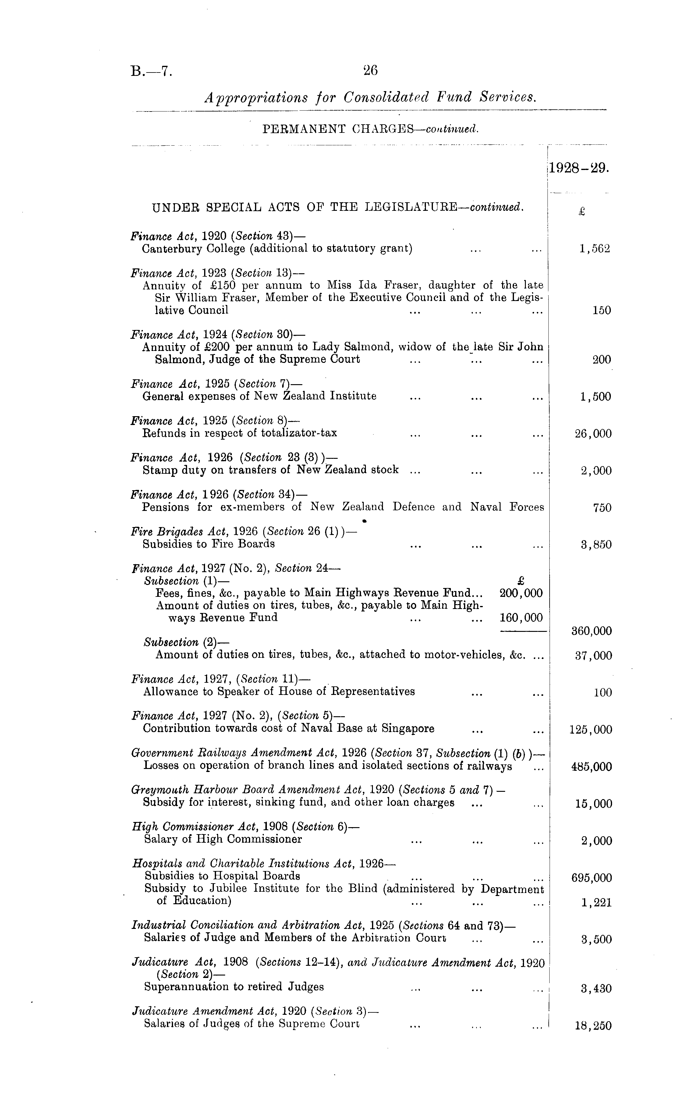 • I 1928-29. UNDER SPECIAL ACTS OP THE LEGISLATURE—continued. £ Finance Act, 1920 (Section 43) — Canterbury College (additional to statutory grant) ... ... 1,562 Finance Act, 1923 (Section 13) — Annuity of £150 per annum to Miss Ida Fraser, daughter of the late Sir William Praser, Member of the Executive Council and of the Legislative Council ... ... ... 150 Finance Act, 1924 (Section 30) — Annuity of £200 per annum to Lady Salmond, widow of the late Sir John Salmond, Judge of the Supreme Court ... ... ... 200 Finance Act, 1925 ( Section 7) — General expenses of New Zealand Institute ... ... ... 1,500 Finance Act, 1925 ( Section 8) — Refunds in respect of totalizator-tax ... ... ... 26,000 Finance Act, 1926 (Section 23 (3)) — Stamp duty on transfers of New Zealand stock ... ... ... 2,000 Finance Act, 1926 (Section 34) — Pensions for ex-members of New Zealand Defence and Naval Forces 750 • Fire Brigades Act, 1926 (Section 26 (1)) — Subsidies to Fire Boards ... ... ... 3,850 Finance Act, 1927 (No. 2), Section 24—Subsection (1) — £ Fees, fines, &c., payable to Main Highways Revenue Fund... 200,000 Amount of duties on tires, tubes, &c., payable to Main Highways Revenue Fund ... ... 160,000 360,000 Stibsection (2) — Amount of duties on tires, tubes, Ac., attached to motor-vehicles, &c. ... j 37,000 Finance Act, 1927, (Section 11) — Allowance to Speaker of House of Representatives ... ... 100 Finance Act, 1927 (No. 2), (Section 5) — Contribution towards cost of Naval Base at Singapore ... ... 125,000 Government Railways Amendment Act, 1926 (Section 37, Subsection (1) (b)) — Losses on operation of branch lines and isolated sections of railways ... 485,000 Greymouth Harbour Board Amendment Act, 1920 (Sections 5 and 7) — Subsidy for interest, sinking fund, and other loan charges ... ... 15,000 High Commissioner Act, 1908 (Section 6) — Salary of High Commissioner ... ... ... 2,000 Hospitals and Charitable Institutions Act, 1926— Subsidies to Hospital Boards . ... ... ... 695,000 Subsidy to Jubilee Institute for the Blind (administered by Department of Education) ... ... ... 1,221 Industrial Conciliation and Arbitration Act, 1925 (Sections 64 and 73) — Salaries of Judge and Members of the Arbitration Court ... ... 3,500 Judicature Act, 1908 (Sections 12-14), and Judicature Amendment Act, 1920 (Section 2) — Superannuation to retired Judges ... ... ... 3,430 Judicature Amendment Act, 1920 (Section 3) — Salaries of Judges of the Supreme Court ... ... ... 18,250