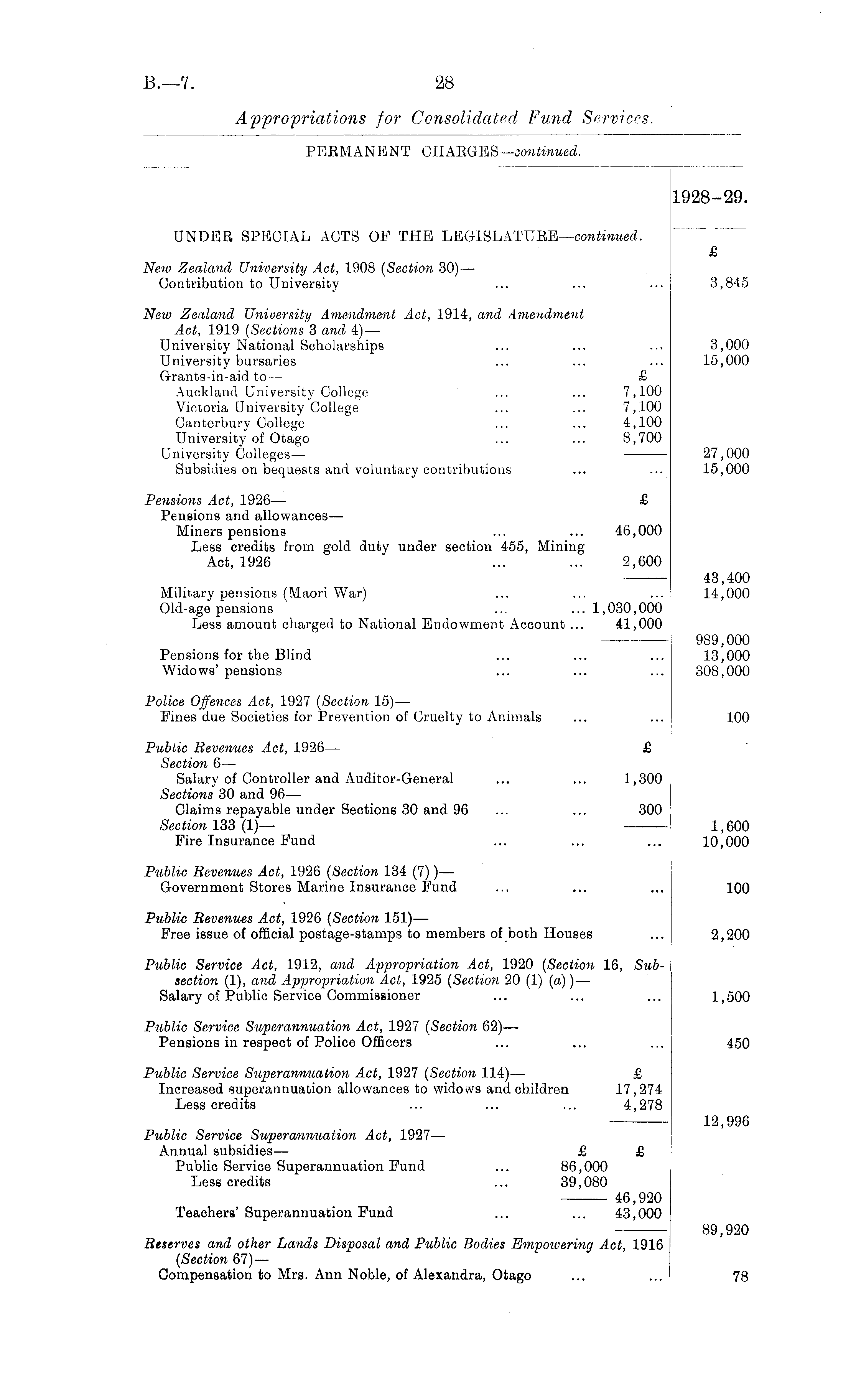 1928-29. UNDER SPECIAL ACTS OF THE LEGISLATURE —continued. £ Netv Zealand University Act, 1908 (Section 30) — Contribution to University ... ... ... 3,845 New Zealand University Amendment Act, 1914, and Amendment Act, 1919 (Sections 3 and 4) —• University National Scholarships ... ... ... 3,000 University bursaries ... ... ... 15,000 Grants-in-aid to — £ Auckland University College ... ... 7,100 Victoria University College ... ... 7,100 Canterbury College ... ... 4,100 University of Otago ... ... 8,700 University Colleges— 27,000 Subsidies on bequests and voluntary contributions ... ... 15,000 Pensions Act, 1926— £ Pensions and allowances— Miners pensions ... ... 46,000 Less credits from gold duty under section 455, Mining Act, 1926 ... ... 2,600 43,400 Military pensions (Maori War) ... ... ... 14,000 Old-age pensions ... ... 1,030,000 Less amount charged to National Endowment Account ... 41,000 989,000 Pensions for the Blind ... ... ... 13,000 Widows' pensions ... ... ... 308,000 Police Offences Act, 1927 (Section 15)— Fines due Societies for Prevention of Cruelty to Animals ... ... 100 Public Revenues Act, 1926— £ Section 6— Salary of Controller and Auditor-General ... ... 1,300 Sections 30 and 96—Claims repayable under Sections 30 and 96 ... ... 300 Section 133 (1) — 1,600 Fire Insurance Fund ... ... ... 10,000 Public Revenues Act, 1926 (Section 134 (7)) — Government Stores Marine Insurance Fund ... ... ... 100 Public Revenues Act, 1926 (Section 151) — Free issue of official postage-stamps to members of both Houses ... 2,200 Public Service Act, 1912, and Appropriation Act, 1920 (Section 16, Subsection (1), and Appropriation Act, 1925 (Section 20 (1) (a)) — Salary of Public Service Commissioner ... ... ... 1,500 Public Service Superannuation Act, 1927 (Section 62) — Pensions in respect of Police Officers ... ... ... 450 Public Service Superannuation Act, 1927 (Section 114) — £ Increased superannuation allowances to widows and children 17,274 Less credits ... ... ... 4,278 12,996 Public Service Superannuation Act, 1927— Annual subsidies— £ £ Public Service Superannuation Fund ... 86,000 Less credits ... 39,080 46,920 Teachers' Superannuation Fund ... ... 43,000 89,920 Reserves and other Lands Disposal and Public Bodies Empowering Act, 1916 (Section 67) — Compensation to Mrs. Ann Noble, of Alexandra, Otago ... ... 78