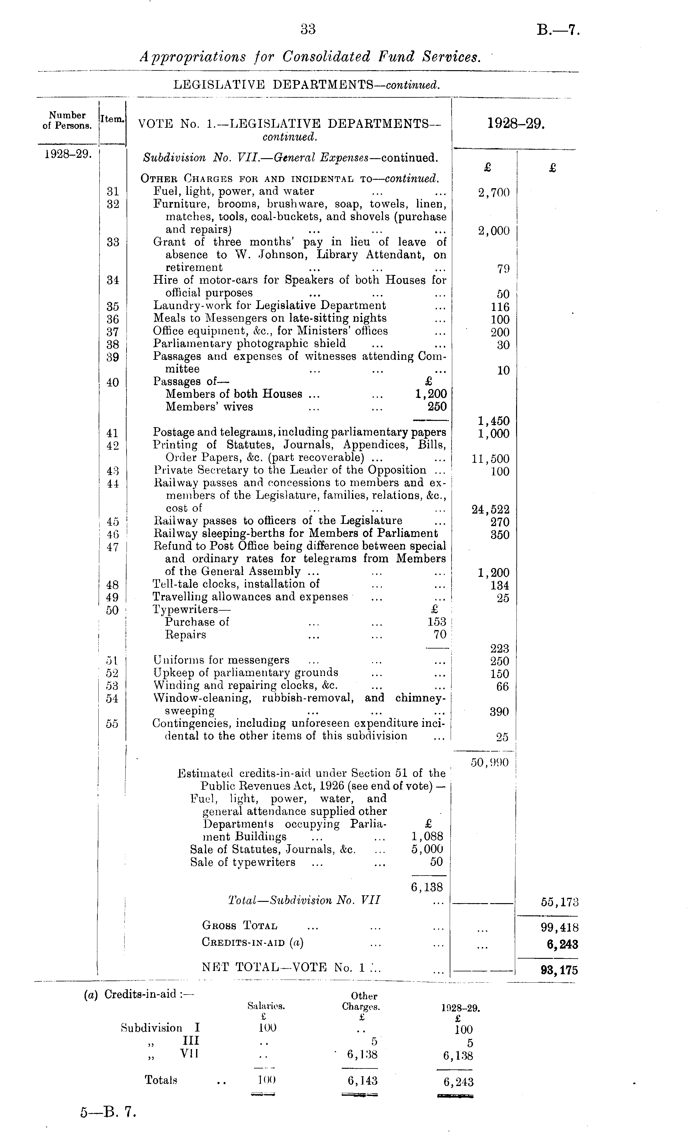 of^Persons. Item ' VOTE No. 1.—LEGISLATIVE DEPARTMENTS— 1928-29. continued. 1928-29. Subdivision No. VII.—General Expenses—continued. I £ £ Other Charges for and incidental to —continued. 31 Fuel, light, power, and water ... ... 2,700 32 Furniture, brooms, brushware, soap, towels, linen, matches, tools, coal-buckets, and shovels (purchase and repairs) ... ... ... 2,000 33 Grant of three months' pay in lieu of leave of absence to W. Johnson, Library Attendant, on retirement ... ... ... 79 34 Hire of motor-cars for Speakers of both Houses for official purposes ... ... ... j 50 35 Laundry-work for Legislative Department ... 116 36 Meals to Messengers on late-sitting nights ... 100 37 Office equipment, &c., for Ministers'offices ... ' 200 38 Parliamentary photographic shield ... ... 30 39 Passages and expenses of witnesses attending Committee ... ... ... 10 40 Passages of— £ Members of both Houses ... ... 1,200 Members' wives ... ... 250 1,450 41 Postage and telegrams, including parliamentary papers 1,000 42 Printing of Statutes, Journals, Appendices, Bills, Order Papers, &c. (part recoverable) ... ... 11,500 43 Private Secretary to the Leader of the Opposition ... 100 I 44 Eailway passes and concessions to members and exmembers of the Legislature, families, relations, &c., cost of ... ... 24,522 45 Eailway passes to officers of the Legislature ... 270 46 Railway sleeping-berths for Members of Parliament 350 47 Refund to Post Office being difference between special and ordinary rates for telegrams from Members of the General Assembly ... ... ... 1,200 [ 48 Tell-tale clocks, installation of ... ... 134 49 Travelling allowances and expenses ... ... j 25 J 50 Typewriters— £ Purchase of ... ... 153 | Repairs ... ... 70 J ! 223 | 51 Uniforms for messengers ... ... ... j 250 | 52 Upkeep of parliamentary grounds ... ... j 150 53 Winding and repairing clocks, &c. ... ... I 66 54 Window-cleaning, rubbish-removal, and chimneysweeping ... ... ... 390 55 Contingencies, including unforeseen expenditure inci- | dental to the other items of this subdivision ... 25 : 50,990 Estimated credits-in-aid under Section 51 of the Public Revenues Act, 1926 (see end of vote) — Fuel, light, power, water, and general attendance supplied other Departments occupying Parlia- £ ment Buildings ... ... 1,088 Sale of Statutes, Journals, &c. ... 5,000 Sale of typewriters ... ... 50 ; 6,138 Total—Subdivision No. VII ... 55,173 Gross Total ... ... ... ... 99,418 Credits-in-aid (a) ... ... 6,243 NET TOTAL—VOTE No. 1 :.. ... 93^175