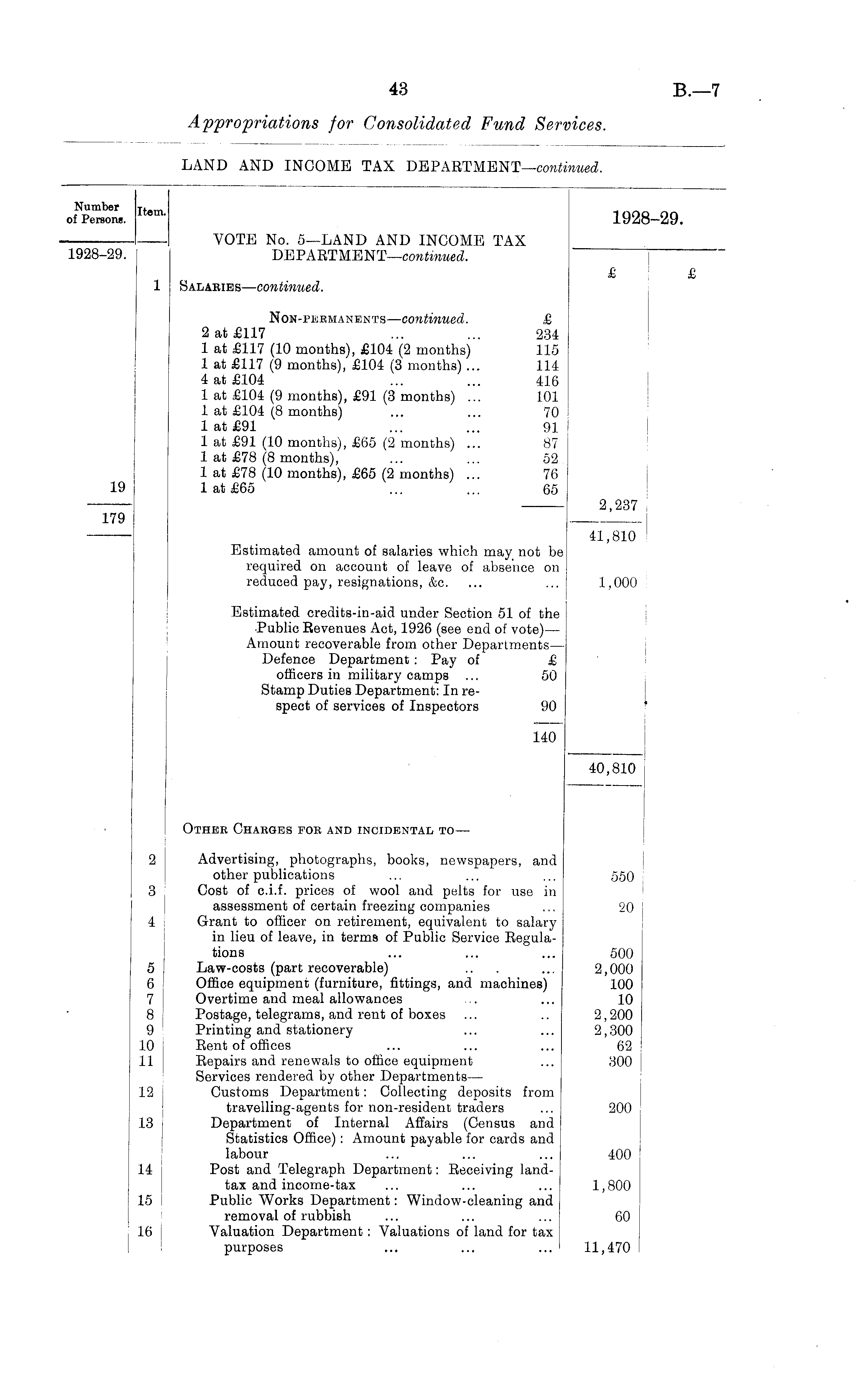 Number Tt .„ _ „ „ of Persons. ' 1928—29. VOTE No. 5—LAND AND INCOME TAX 1928-29. DEPARTMENT—continued. ' j £ £ 1 Salaries—continued. Non-permanents—continued. £ 2 at £117 ... ... 234 1 at £117 (10 months), £104 (2 months) 115 1 at £117 (9 months), £104 (3 months) ... 114 4 at £104 ... ... 416 1 at £104 (9 months), £91 (3 months) ... 101 1 at £104 (8 months) ... ... 70 1 Sht £91 ... ... 91 1 at £91 (10 months), £65 (2 months) ... 87 1 at £78 (8 months), ... ... 52 1 at £78 (10 months), £65 (2 months) ... 76 19 1 at £65 ... ... 65 2,237 179 _ 41,810 Estimated amount of salaries which may not be required on account of leave of absence on reduced pay, resignations, &c. ... ... 1,000 Estimated credits-in-aid under Section 51 of the •Public Eevenues Act, 1926 (see end of vote)— Amount recoverable from other DepartmentsDefence Department : Pay of £ officers in military camps ... 50 Stamp Duties Department: In respect of services of Inspectors 90 140 40,810 Other Charges for and incidental to — 2 I Advertising, photographs, books, newspapers, and other publications ... ... ... 550 j 3 | Cost of c.i.f. prices of wool and pelts for use in assessment of certain freezing companies ... 20 4 | Grant to officer on retirement, equivalent to salary in lieu of leave, in terms of Public Service Regulations ... ... ... 500 5 1 Law-costs (part recoverable) .. ... 2,000 6 Office equipment (furniture, fittings, and machines) 100 7 I Overtime and meal allowances ,. ... 10 8 Postage, telegrams, and rent of boxes ... .. 2,200 9 Printing and stationery ... ... 2,300 10 i Rent of offices ... ... ... 62 11 j Repairs and renewals to office equipment ... 300 Services rendered by other Departments— 12 ; Customs Department: Collecting deposits from travelling-agents for non-resident traders ... 200 I 13 I Department of Internal Affairs (Census and Statistics Office): Amount payable for cards and labour ... ... ... 400 14 | Post and Telegraph Department: Receiving landtax and income-tax ... ... ... 1,800 15 I Public Works Department: Window-cleaning and removal of rubbish ... ... ... 60 j 16 : Valuation Department: Valuations of land for tax purposes ... ... ... 11,470