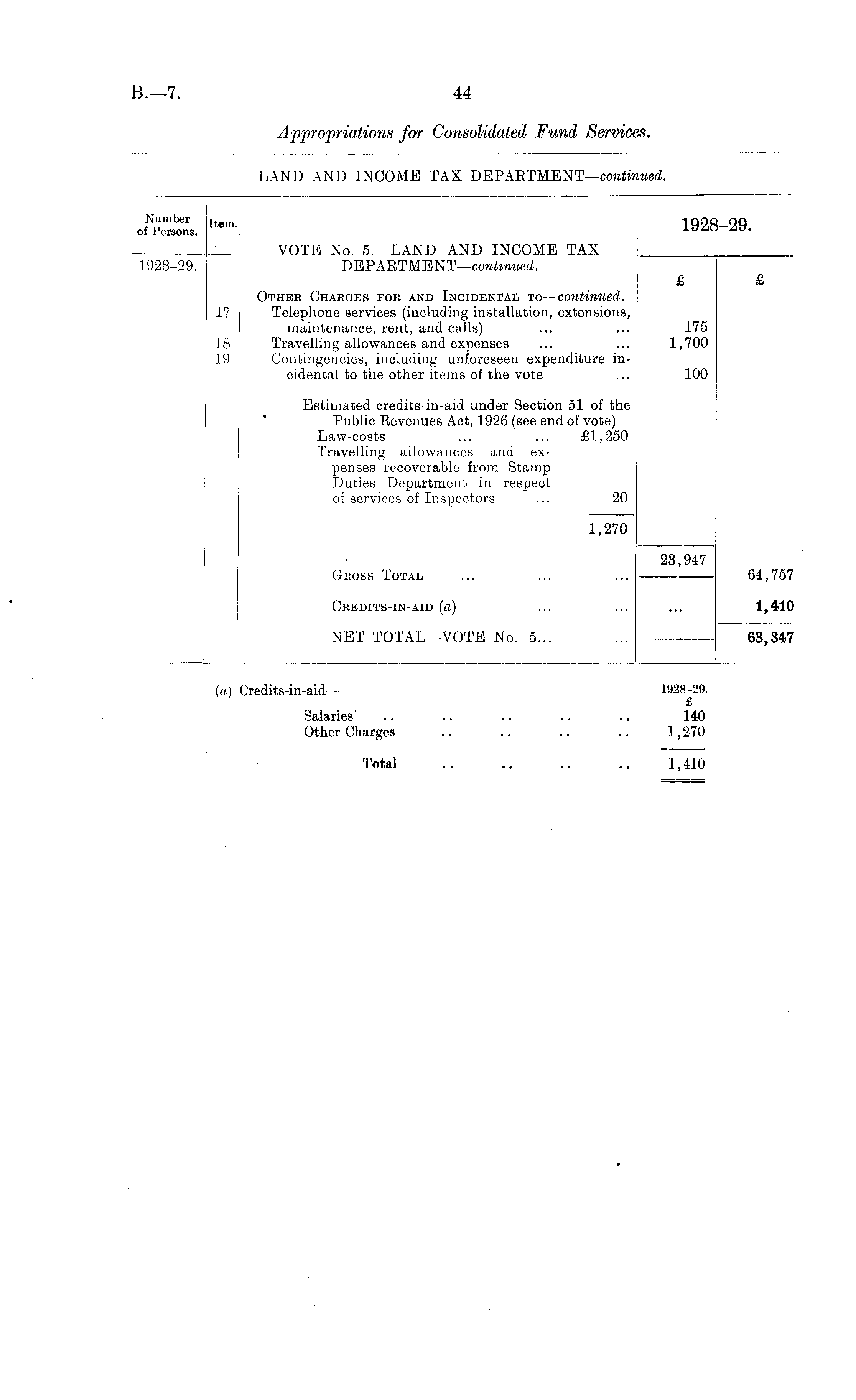 (a) Credits-in-aid— 1928-29. • £ Salaries' .. .. .. .. .. 140 Other Charges .. .. .. .. 1,270 Total .. .. .. .. 1,410