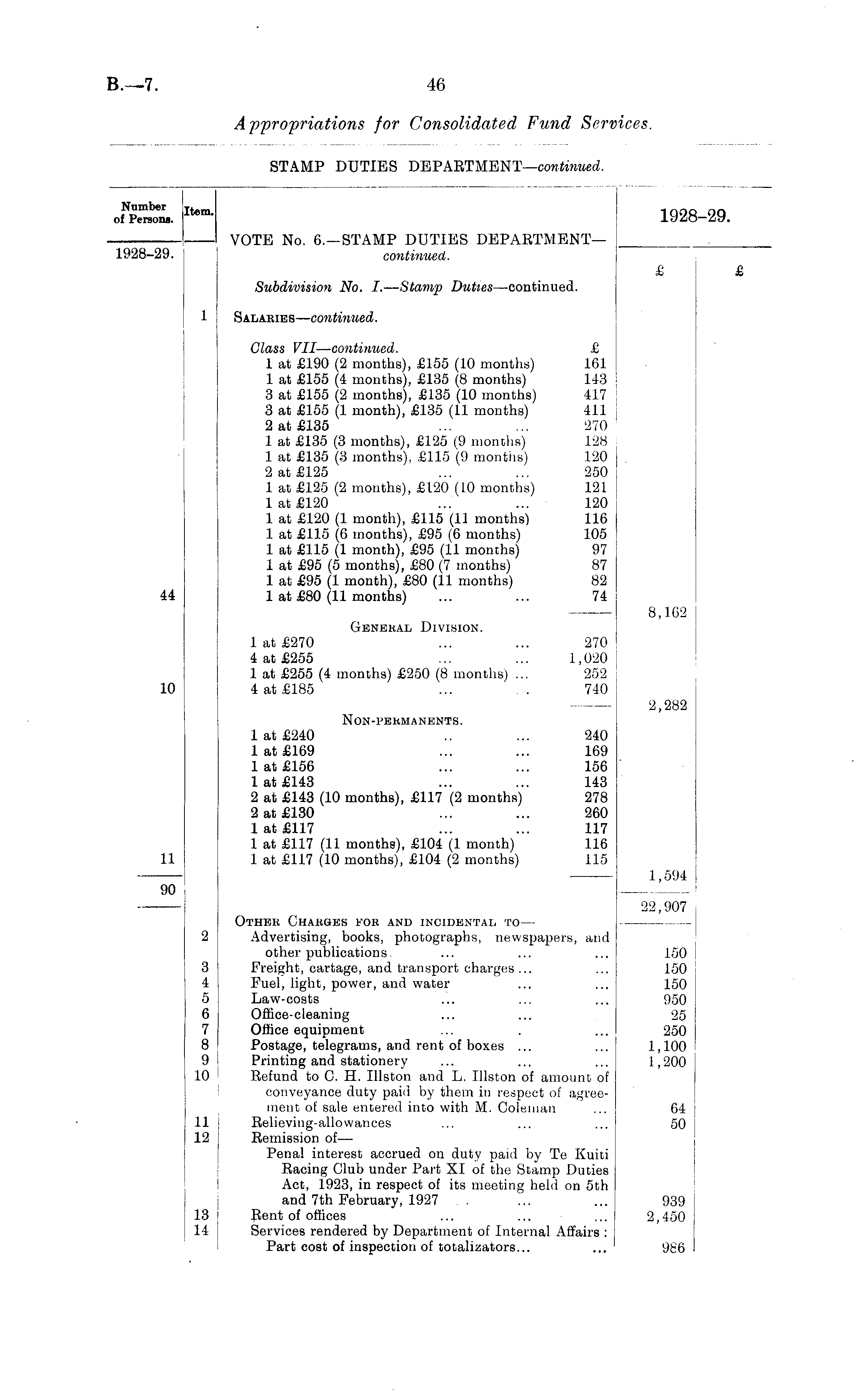 ofp™. Item - 1928-29. VOTE No. 6.—STAMP DUTIES DEPARTMENT— . 1928-29. continued. £ £ Subdivision No. I.—Stamp Duties—-continued. 1 Salaries—continued. Glass VII—continued. £ 1 at £190 (2 months), £155 (10 months) 161 1 at £155 (4 months), £135 (8 months) 143 3 at £155 (2 months), £135 (10 months) 417 3 at £155 (1 month), £135 (11 months) 411 2 at £135 ... ... 270 1 at £135 (3 months), £125 (9 months) 128 1 at £135 (3 months), £115 (9 months) 120 2 at £125 ... ... 250 1 at £125 (2 months), £120 (10 months) 121 1 at £120 ..." ... 120 1 at £120 (1 month), £115 (11 months) 116 1 at £115 (6 months), £95 (6 months) 105 1 at £115 (1 month), £95 (11 months) 97 1 at £95 (5 months), £80 (7 months) 87 1 at £95 (1 month), £80 (11 months) 82 44 1 at £80 (11 months) ... ... 74 8,162 General Division. 1 at £270 ... ... 270 4 at £255 ... ... 1,020 1 at £255 (4 months) £250 (8 months) ... 252 10 4 at £185 ... ... 740 2,282 Non-permanents. 1 at £240 .. ... 240 1 at £169 ... ... 169 1 at £156 ... ... 156 1 at £143 ... ... 143 2 at £143 (10 months), £117 (2 months) 278 2 at £130 ... ... 260 1 at £117 ... ... 117 1 at £117 (11 months), £104 (1 month) 116 11 1 at £117 (10 months), £104 (2 months) 115 1,594 90 22,907 Other Charges for and incidental to — 2 Advertising, books, photographs, newspapers, and other publications ... ... ... 150 3 Freight, cartage, and transport charges... ... 150 4 Fuel, light, power, and water ... ... 150 5 Law-costs ... ... ... 950 6 Office-cleaning ... ... 25 7 Office equipment ... . ... 250 8 Postage, telegrams, and rent of boxes ... ... 1,100 9 Printing and stationery ... ... ... 1,200 10 Refund to C. H. Illston and L. Illston of amount of conveyance duty paid by them it) respect of agreement of sale entered into with M. Coleman ... 64 11 Relieving-allowances ... ... ... 50 12 Remission of— Penal interest accrued on duty paid by Te Kuiti Racing Club under Part XI of the Stamp Duties Act, 1923, in respect of its meeting held on 5th and 7th February, 1927 . ... ... 939 13 Rent of offices ... ... ... 2,450 14 Services rendered by Department of Internal Affairs : Part cost of inspection of totalizators... ... 986