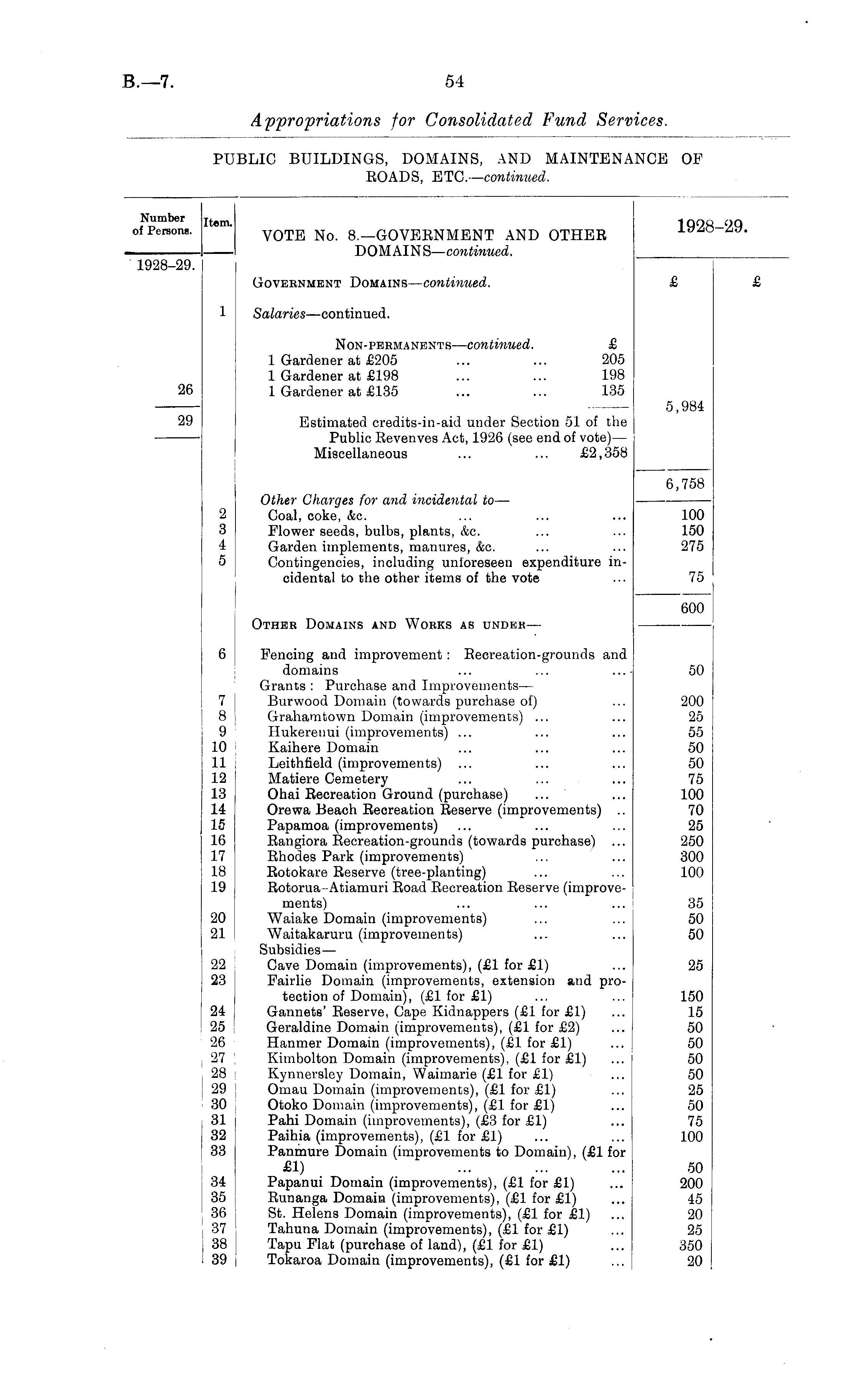 Number item. 1QOQOQ Of Persons. VOTE No. 8.—GOVERNMENT AND OTHER . DOMAINS—continued. 1928-29. Government Domains—continued. £ £ 1 Salaries—continued. Non-peemanents—continued. £ 1 Gardener at £205 ... ... 205 1 Gardener at £198 ... ... 198 26 1 Gardener at £135 ... ... 135 5,984 29 Estimated credits-in-aid under Section 51 of the Public Revenves Act, 1926 (see end of vote)— Miscellaneous ... ... £2,358 6,758 Other Charges for and incidental to— 2 Coal, coke, &c. ... ... ... 100 3 Flower seeds, bulbs, plants, &c. ... ... 150 4 Garden implements, manures, &c. ... ... 275 5 Contingencies, including unforeseen expenditure incidental to the other items of the vote ... 75 600 Other Domains and Works as undeb — 6 | Fencing and improvement: Recreation-grounds and domains ... ... ...• 50 Grants : Purchase and Improvements— 7 j Burwood Domain (towards purchase of) ... 200 8 | Grahamtown Domain (improvements) ... ... 25 9 j Hukerenui (improvements) ... ... ... 55 [ 10 | Kaihere Domain ... ... ... 50 11 Leithfield (improvements) ... ... ... 50 12 [ Matiere Cemetery ... ... ... 75 13 ! Ohai Recreation Ground (purchase) ... ... 100 14 Orewa Beach Recreation Reserve (improvements) .. 70 15 Papamoa (improvements) ... ... ... 25 16 Rangiora Recreation-grounds (towards purchase) ... 250 17 Rhodes Park (improvements) ... ... 300 18 Rotokare Reserve (tree-planting) ... ... 100 19 Rotorua-Atiamuri Road Recreation Reserve (improvements) ... ... ... 35 20 Waiake Domain (improvements) ... ... 50 21 Waitakaruru (improvements) ... ... 50 Subsidies— 22 I Cave Domain (improvements), (£1 for £1) ... 25 j 23 I Fairlie Domain (improvements, extension and protection of Domain), (£1 for £1) ... ... 150 24 ' Gannets' Reserve, Cape Kidnappers (£1 for £1) ... 15 25 ! Geraldine Domain (improvements), (£l for £2) ... 50 26 Hanmer Domain (improvements), (£1 for £1) ... 50 27 Kimbolton Domain (improvements), (£1 for £1) ... 50 28 Kynnersley Domain, Waimarie (£1 for £1) ... 50 29 J Omau Domain (improvements), (£1 for £1) ... 25 30 Otoko Domain (improvements), (£1 for £1) ... 50 j 31 [ Pahi Domain (improvements), (£3 for £1) ... 75 32 | Paihia (improvements), (£1 for £1) ... ... 100 33 Panmure Domain (improvements to Domain), (£1 for £1) ... ... ... 50 34 | Papanui Domain (improvements), (£1 for £1) ... 200 35 Runanga Domain (improvements), (£1 for £1) ... 45 36 | St. Helens Domain (improvements), (£1 for £1) ... 20 37 Tahuna Domain (improvements), (£1 for £1) ... 25 38 Tapu Flat (purchase of land), (£1 for £1) ... 350 39 Tokaroa Domain (improvements), (£1 for £1) ... 20