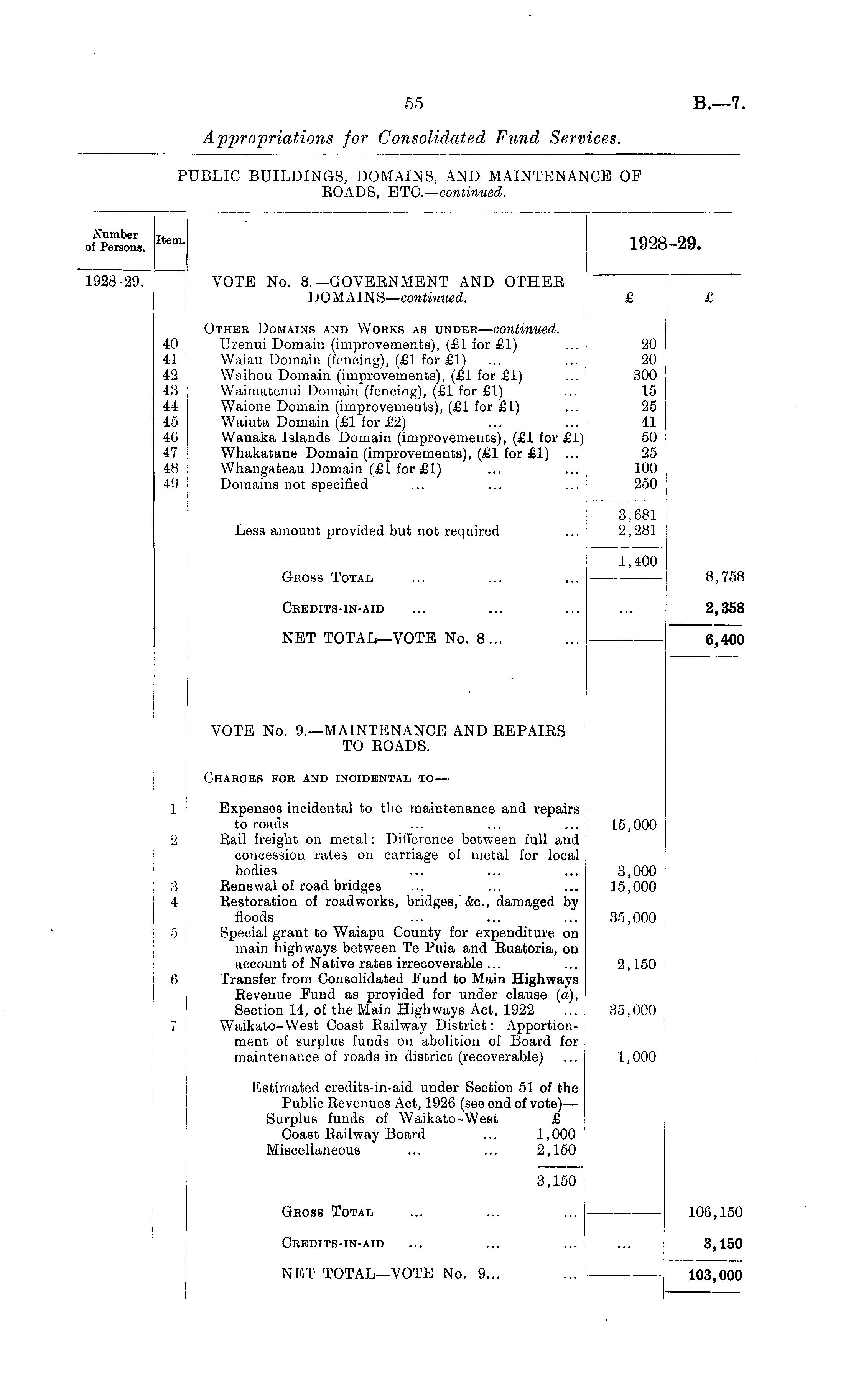 ofCons. Item - 1928-29. 1928-29! [ VOTE No. 8.—GOVERNMENT AND OTHER DOMAINS—continued. £ £ Other Domains and Wobks as under —continued. 40 ! Urenui Domain (improvements), (£1 for £1) ... 20 41 Waiau Domain (fencing), (£1 for £1) ... ... 20 42 Waihou Domain (improvements), (£1 for £1) ... 300 43 Waimatenui Domain (fencing), (£1 for £1) ... 15 44 j Waione Domain (improvements), (£1 for £1) ... 25 45 \ Waiuta Domain (£1 for £2) ... ... 41 46 : Wanaka Islands Domain (improvements), (£1 for £1) 50 j 47 Whakatane Domain (improvements), (£1 for £1) ... 25 48 Whangateau Domain (£1 for £1) ... ... 100 49 Domains not specified ... ... ... 250 3,681 Less amount provided but not required ... 2,281 1,400 Gross Total ... ... ... 8,758 Cbedits-IN-AID ... ... ... ... 2,358 NET TOTAL—VOTE No. 8... ... 6,400 VOTE No. 9.—MAINTENANCE AND REPAIRS TO ROADS. Charges for and incidental to — 1 : Expenses incidental to the maintenance and repairs to roads ... ... ... L5,000 2 Rail freight on metal: Difference between full and concession rates on carriage of metal for local bodies ... ... ... 3,000 3 Renewal of road bridges ... ... ... 15,000 4 Restoration of roadworks, bridges," &c., damaged by floods ... ... ... 35,000 5 j Special grant to Waiapu County for expenditure on main highways between Te Puia and Ruatoria, on account of Native rates irrecoverable... ... 2,150 6 | Transfer from Consolidated Fund to Main Highways Revenue Fund as provided for under clause (a), Section 14, of the Main Highways Act, 1922 ... 35,000 7 j Waikato-West Coast Railway District: Apportion- ] ment of surplus funds on abolition of Board for J maintenance of roads in district (recoverable) ... 1,000 Estimated credits-in-aid under Section 51 of the Public Revenues Act, 1926 (see end of vote) — Surplus funds of Waikato-West £ Coast Railway Board ... 1,000 Miscellaneous ... ... 2,150 3,150 Gross Total ... ... ... 106,150 Credits-in-aid ... ... ... ... 3,150 NET TOTAL—VOTE No. 9... ... j- 103,000