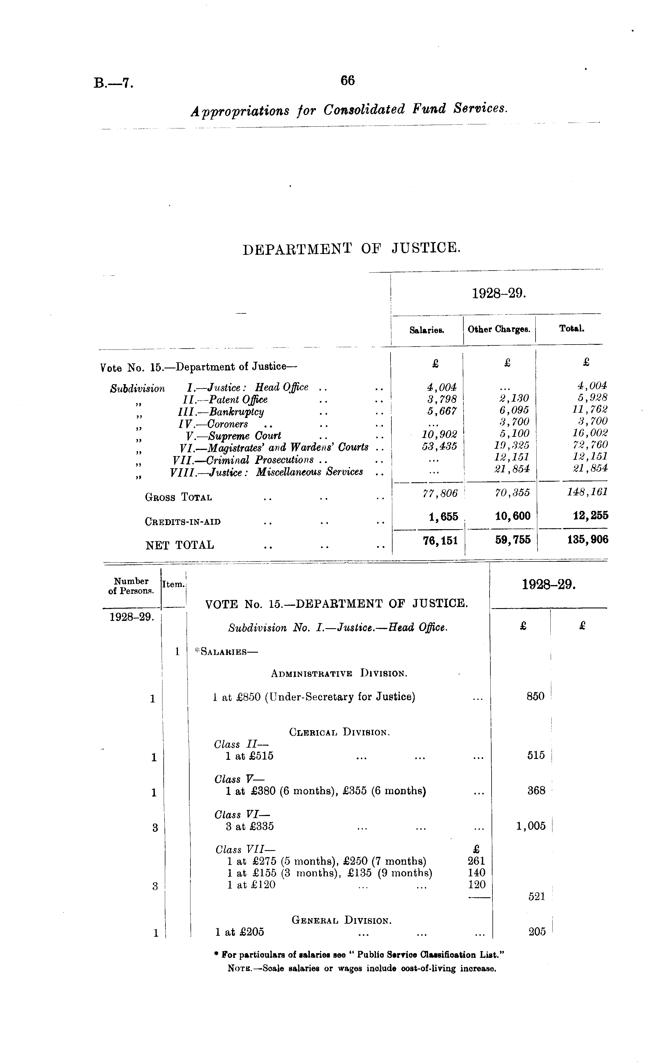 1928-29. Salaries, Other Charges. Total. Vote No. 15. —Department of Justice — £ £ £ Subdivision I. —Justice: Head Office .. .. 4,004 ... 4,004 II.—Patent Office .. .. 3,798 2,130 5,928 III. —Bankruptcy .. ■ ■ \ 5,667 6,095 11,762 IV. —Coroners .. .. ... I ... 3,700 3,700 V. —Supreme Court .. ..I 10,902 5,100 16,002 M VI.—Magistrates'and Wardens'Courts .. 53,435 19,325 72,760 )( VII.—Criminal Prosecutions .. .. ••• 12,151 12,151 >t VIII. —Justice: Miscellaneous Services .. ••• I 21,854 21,854 GROSS TOTAL 77,806 70,355 148,161 Credits-IN-AID 1.655 10,600 12,255 NET TOTAL .. .. .. 76,151 59,755 135,906 Number Item / 1928-29. of Persona. VOTE No. 15.—DEPARTMENT OF JUSTICE. 1928-29. j Subdivision No. I.—Justice.—Head Office. £ 1 £ 1 — Administrative Division. 1 | 1 at £850 (Under-Secretary for Justice) ... 850 Clerical Division. Class II— 1 1 at £515 ... ... ... 515 Class V — 1 1 at £380 (6 months), £355 (6 months) ... 368 Class VI— 3 3 at £335 ... ... ... 1,005 Class VII— £ 1 at £275 (5 months), £250 (7 months) 261 1 at £155 (3 months), £135 (9 months) 140 3 j 1 at £120 ... ... 120 521 General Division. 1 1 at £205 ... ... ... 205 * For particulars of salaries see " Public S«rrice Classification List." Note.—Scale salaries or wages include cost-of-living increase.