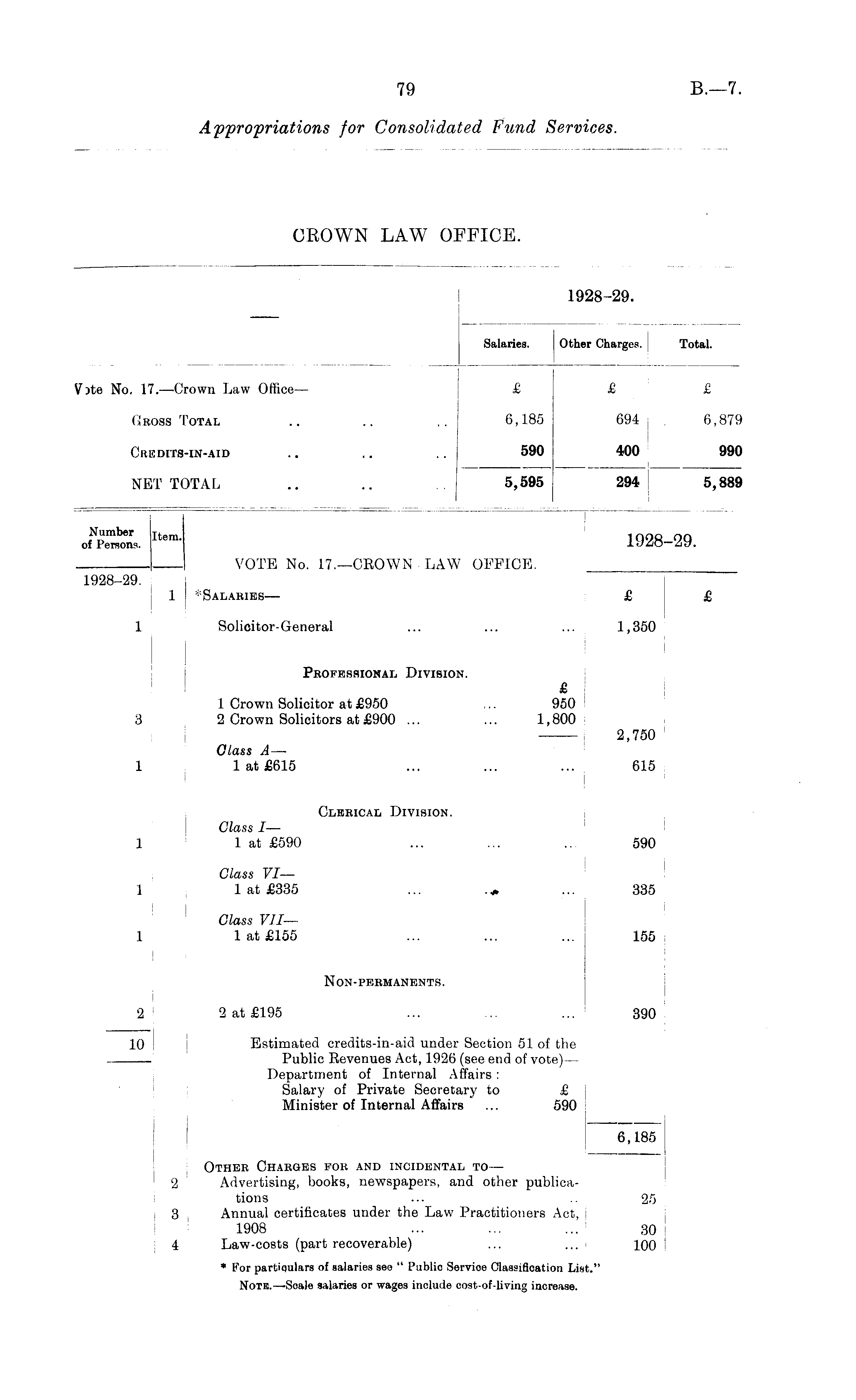 1928-29. Salaries. | Other Charges, j Total. Vote No. 17. —Crown Law Office— £ £ £ Gross Total .. .. .. 6,185 694 6,879 Credits-in-aid .. .. 590 400 990 NET TOTAL .. .. 5,595 294 5,889 oitat. Item - 1928-29. VOTE No. 17.—OEOWN LAW OFFICE. 1928-29. 1 *Salaries— £ j £ 1 Solicitor-General ... ... ... 1,350 Professional Division. £ 1 Crown Solicitor at £950 ... 950 3 2 Crown Solicitors at £900 ... ... 1,800 2,750 Glass A— 1 1 at £615 ... ... ... 615 Clerical Division. Glass I— 1 1 at £590 ... ... .. 590 Class VI — 1 1 at £335 ... .* ... 335 Glass VJI— 1 1 at £155 ... ... ... 155 N ON-PERMANENTS. 2 2 at £195 ... ... ... 390 10 ! Estimated credits-in-aid under Section 51 of the Public Revenues Act, 1926 (see end of vote) — Department of Internal Affairs: Salary of Private Secretary to £ Minister of Internal Affairs ... 590 6,185 Other Charges for and incidental to — 2 Advertising, books, newspapers, and other publications ... .. j 25 3 Annual certificates under the Law Practitioners Act, 1908 ... ... ... 30 4 Law-costs (part recoverable) ... ... 100 * For particulars of salaries sea " Public Servioe Classification List." Note.—Scale salaries or wages include cost-of-living increase.