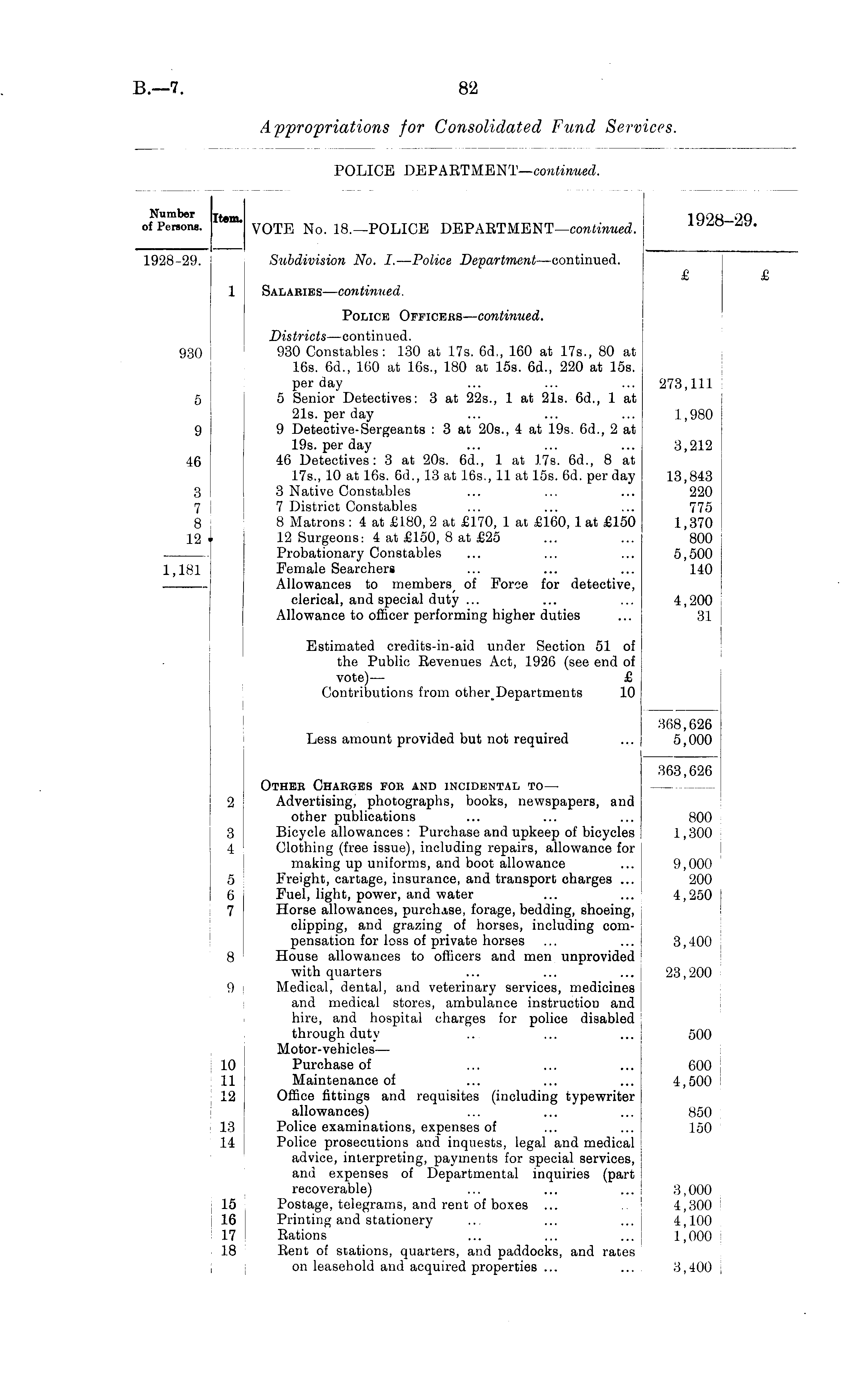 Number j tem -1 QOOOQ of Persons. VOTE No. 18.—POLICE DEPARTMENT—continued. 1928-29. i Subdivision No. I.—Police Department—continued. £ £ 1 ! Salaries —continued. Police Officers—continued. Districts —continued. 930 930 Constables: 130 at 17s. 6d., 160 at 17s., 80 at 16s. 6d., 160 at 16s., 180 at 15s. 6d., 220 at 15s. per day ... ... ... 273,111 5 I 5 Senior Detectives: 3 at 22s., 1 at 21s. 6d., 1 at 21s. per day ... ... ... 1,980 9 | 9 Detective-Sergeants : 3 at 20s., 4 at 19s. 6d., 2 at 19s. per day ... ... ... 3,212 46 46 Detectives: 3 at 20s. 6d., 1 at 17s. 6d., 8 at 17s., 10 at 16s. 6d., 13 at 16s., 11 at 15s. 6d. per day 13,843 3 3 Native Constables ... ... ... 220 7 7 District Constables ... ... ... 775 8 8 Matrons : 4 at £180, 2 at £170, 1 at £160, 1 at £150 1,370 12 I 12 Surgeons: 4 at £150, 8 at £25 ... ... 800 1 Probationary Constables ... ... ... 5,500 1,181 ! Female Searchers ... ... ... 140 Allowances to of Force for detective, clerical, and special duty ... ... ... 4,200 Allowance to officer performing higher duties ... 31 Estimated credits-in-aid under Section 51 of j ! the Public Revenues Act, 1926 (see end of vote) — £ Contributions from other_Departments 10 368,626 Less amount provided but not required ... 5,000 363,626 Other Chabges fob and incidental to— 2 | Advertising, photographs, books, newspapers, and other publications ... ... ... 800 3 Bicycle allowances : Purchase and upkeep of bicycles 1,300 4 Clothing (free issue), including repairs, allowance for making up uniforms, and boot allowance ... 9,000 5 Freight, cartage, insurance, and transport charges ... 200 i 6 | Fuel, light, power, and water ... ... 4,250 7 I Horse allowances, purchase, forage, bedding, shoeing, clipping, and grazing of horses, including compensation for loss of private horses ... ... 3,400 8 House allowances to officers and men unprovided with quarters ... ... ... 23,200 i 9 Medical, dental, and veterinary services, medicines and medical stores, ambulance instruction and hire, and hospital charges for police disabled through duty ... ... ... 500 Motor-vehicles — 10 Purchase of ... ... ... 600 11 | Maintenance of ... ... ... 4,500 12 Office fittings and requisites (including typewriter allowances) ... ... ... 850 13 Police examinations, expenses of ... ... 150 14 j Police prosecutions and inquests, legal and medical advice, interpreting, payments for special services, and expenses of Departmental inquiries (part recoverable) ... ... ... 3,000 15 Postage, telegrams, and rent of boxes ... 4,300 16 i Printing and stationery ... ... ... 4,100 17 Rations ... ... ... 1,000 18 Rent of stations, quarters, and paddocks, and rates on leasehold and acquired properties ... ... i 3,400 |