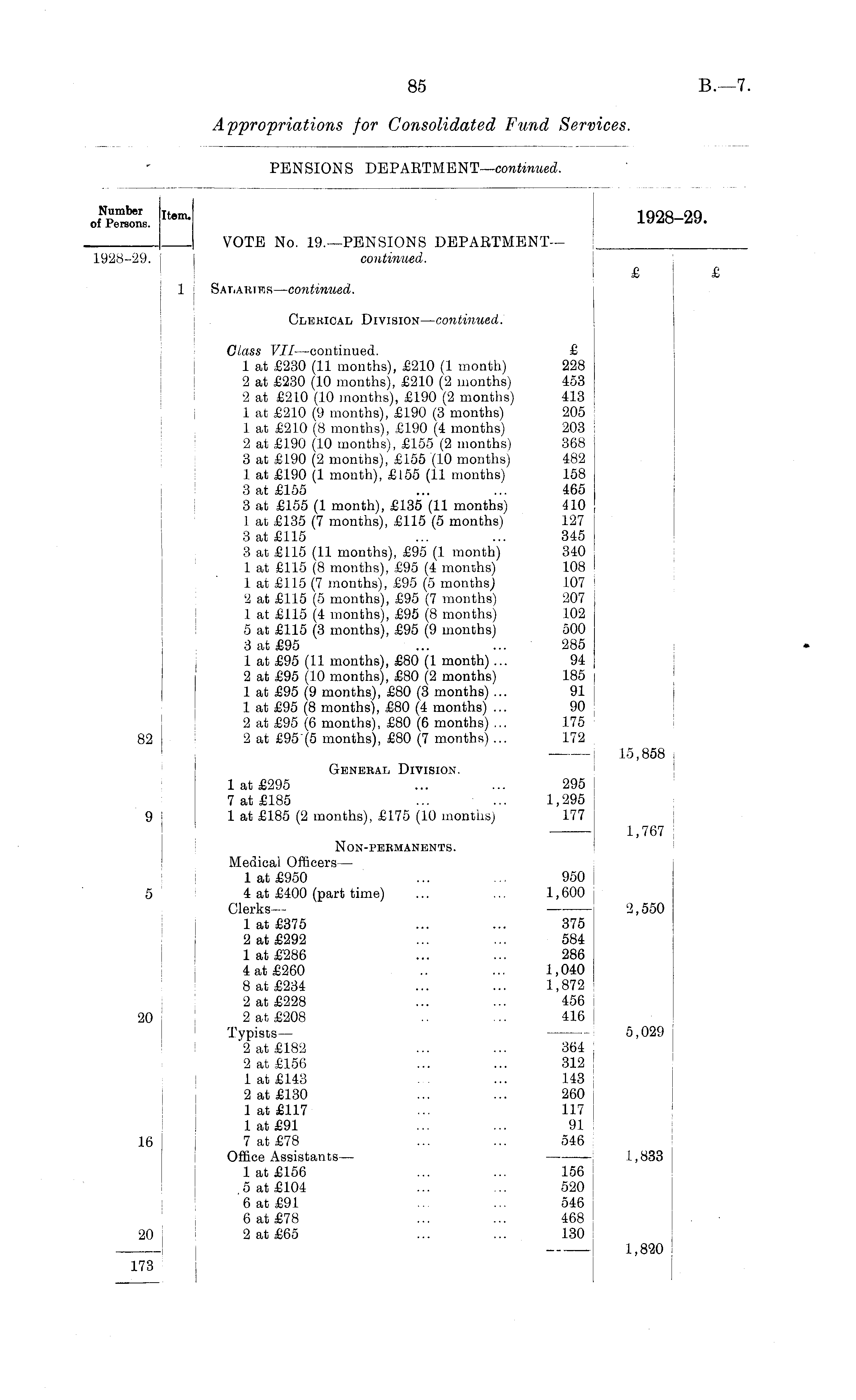 ofpe'ons. I,em - 1928-29. VOTE No. 19.—PENSIONS DEPARTMENT— 1928-29. continued. £ £ 1 Sat.aktf.r—continued. Clerical Division —continued. Glass VII—continued. £ 1 at £230 (11 months), £210 (1 month) 228 2 at £230 (10 months), £210 (2 months) 453 2 at £210 (10 months), £190 (2 months) 413 1 at £210 (9 months), £190 (3 months) 205 1 at £210 (8 months), £190 (4 months) 203 2 at £190 (10 months), £155 (2 months) 368 3 at £190 (2 months), £155 (10 months) 482 1 at £190 (1 month), £155 (11 months) 158 3 at £155 ... ... 465 3 at £155 (1 month), £135 (11 months) 410 1 at £135 (7 months), £115 (5 months) 127 3 at £115 ... ... 345 3 at £115 (11 months), £95 (1 month) 340 1 at £115 (8 months), £95 (4 months) 108 1 at £115 (7 months), £95 (5 months) 107 2 at £115 (5 months), £95 (7 months) 207 1 at £115 (4 months), £95 (8 months) 102 5 at £115 (3 months), £95 (9 months) 500 3 at £95 ... ... 285 1 at £95 (11 months), £80 (1 month) ... 94 2 at £95 (10 months), £80 (2 months) 185 1 at £95 (9 months), £80 (3 months) ... 91 1 at £95 (8 months), £80 (4 months) ... 90 2 at £95 (6 months), £80 (6 months) ... 175 82 2 at £95'(5 months), £80 (7 months)... 172 15,858 General Division. 1 at £295 ... ... 295 7 at £185 ... ... 1,295 9 1 at £185 (2 months), £175 (10 months) 177 1,767 Non-pebmanents. Medical Officers—1 at £950 ... ... 950 5 4 at £400 (part time) ... ... 1,600 Clerks— 2,550 1 at £375 ... ... 375 2 at £292 ... ... 584 1 at £286 ... ... 286 4 at £260 .. ... 1,040 8 at £234 ... ... 1,872 2 at £228 ... ... 456 20 2 at £208 ... 416 Typists— 5,029 2 at £182 ... ... 364 2 at £156 ... ... 312 1 at £143 ... 143 2 at £130 ... ... 260 1 at £117 ... 117 1 at £91 ... ... 91 16 7 at £78 ... ... 546 Office Assistants — 1,833 1 at £156 ... ... 156 ,5 at £104 ... ... 520 6 at £91 ... 546 6 at £78 ... ... 468 20 2 at £65 ... ... 130 1,820 173