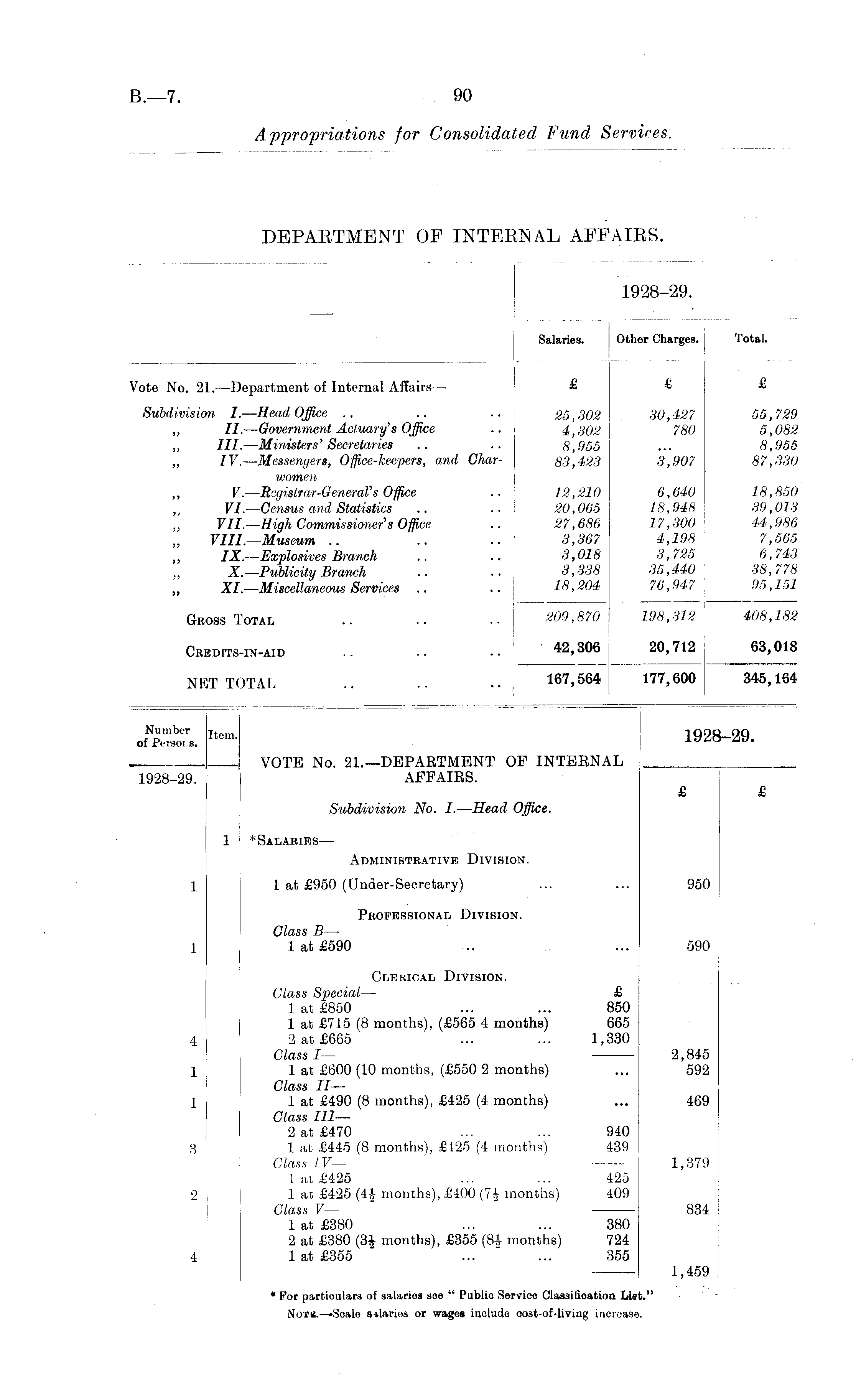 1928-29. Salaries. Other Charges. ! Total. Vote No. 21. —Department of Internal Affairs — £ £ £ Subdivision I.-—Head Office .. .. .. ! 25,302 30,427 55,729 „ II. —Government Actuary's Office .. 4,302 780 5,082 „ III. —Ministers'Secretaries .. .. j 8,955 ... 8,955 „ IV.—Messengers, Office-keepers, and Char- j 83,423 3,907 87,330 women ,, V. —Registrar-General's Office .. 12,210 6,640 18,850 ,, VI. —Census and Statistics .. j 20,065 18,948 39,013 „ VII.—High Commissioner's Office .. 27,686 17,300 44,986 VIII.—Museum .. .. .. 3,367 4,198 7,565 ,, IX. —Explosives Branch .. .. 3,018 3,725 6,743 „ X. —Publicity Branch .. .. 3,338 35,440 38,778 „ XI.—Miscellaneous Services .. .. 18,204 76,947 95,151 GROSS Total .. .. .. 209,870 198,312 408,182 CREDITS-IN-aid .. .. 42,306 20,712 63,018 NET TOTAL .. .. .. 167,564 177,600 345,164 Number Ite J 1928-29. of Persoi.s. . | VOTE No. 21.—DEPARTMENT OP INTERNAL 1928-29. AFFAIRS. £ £ Subdivision No. I.—Head Office. 1 "'SalariesAdministrative Division. 1 1 at £950 (Under-Secretary) ... ... 950 Professional Division. Class B— 1 1 at £590 .. ... 590 Clerical Division. Class Special — £ 1 at £850 ... ... 850 1 at £715 (8 months), (£565 4 months) 665 4 2 at £665 ... ... 1,330 Class I— 2,845 1 1 at £600 (10 months, (£550 2 months) ... 592 Class II— 1 | 1 at £490 (8 months), £425 (4 months) ... 469 Class III— 2 at £470 ... ... 940 3 1 at £445 (8 months), £125 (4 months) 439 Class IV— 1,379 1 at £425 ... ... 425 2 1 at £425 (4i months), £400 (7& months) 4.09 Class V— " 834 1 at £380 ... ... 380 2 at £380 (3£ months), £355 (84- months) 724 4 1 at £355 ... " ... 355 1,459 * For particulars of salaries see " Public Service Classification List." NotScale salaries or wages include cost-of-living increase,
