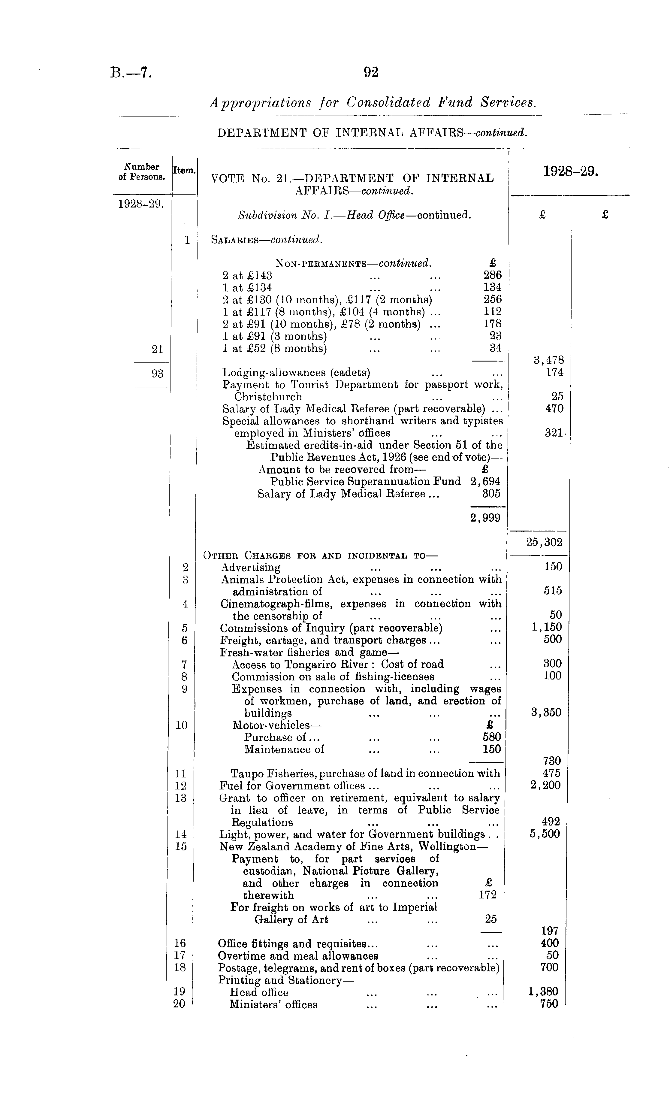 Number j tem -i qoo oq of Persons. ' VOTE No. 21.—DEPARTMENT OF INTERNAL AFFAIRS—continued. 1928-29. Subdivision No. I. —Head Office —continued. £ £ 1 Salaries—continued. Non-permanents—continued. £ 2 at £143 ... ... 286 1 1 at £134 ... ... 134! 2 at £130 (10 months), £117 (2 months) 256 1 at £117 (8 months), £104 (4 months) ... 112 2 at £91 (10 months), £78 (2 months) ... 178 .1 at £91 (3 months) ... ... 23 21 1 at £52 (8 months) ... ... 34 - 1 3,478 93 j Lodging-allowances (cadets) ... ... i 174 Payment to Tourist Department for passport work, Christchurch ... ... 25 Salary of Lady Medical Referee (part recoverable) ... 470 Special allowances to shorthand writers and typistes employed in Ministers'offices ... ... 321 Estimated credits-in-aid under Section 51 of the Public Revenues Act, 1926 (see end of vote) — Amount to be recovered from— £ Public Service Superannuation Fund 2,694 Salary of Lady Medical Referee ... 305 2,999 25,302 Other Charges for and incidental to — 2 Advertising ... ... ... 150 3 Animals Protection Act, expenses in connection with administration of ... ... ... 515 4 Cinematograph-films, expenses in connection with the censorship of ... ... ... 50 5 Commissions of Inquiry (part recoverable) ... 1,150 6 Freight, cartage, and transport charges... ... 500 Fresh-water fisheries and game— 7 Access to Tongariro River : Cost of road ... 300 8 Commission on sale of fishing-licenses ... 100 9 Expenses in connection with, including wages of workmen, purchase of land, and erection of buildings ... ... ... 3,350 10 Motor-vehicles — £ Purchase of... ... ... 580 Maintenance of ... ... 150 730 11 Taupo Fisheries, purchase of land in connection with 475 12 Fuel for Government offices... ... ... 2,200 13 Grant to officer on retirement, equivalent to salary in lieu of leave, in terms of Public Service Regulations ... ... ... 492 14 Light, power, and water for Government buildings . . 5,500 15 New Zealand Academy of Fine Arts, Wellington—• Payment to, for part services of custodian, National Picture Gallery, and other charges in connection £ therewith ... ... 172 j For freight on works of art to Imperial Gallery of Art ... ... 25 197 16 Office fittings and requisites... ... ... 400 17 Overtime and meal allowances ... ... 50 18 Postage, telegrams, and rent of boxes (part recoverable) 700 Printing and Stationery— 19 Head office ... ... ... 1,380 20 Ministers' offices ... ... ... 750