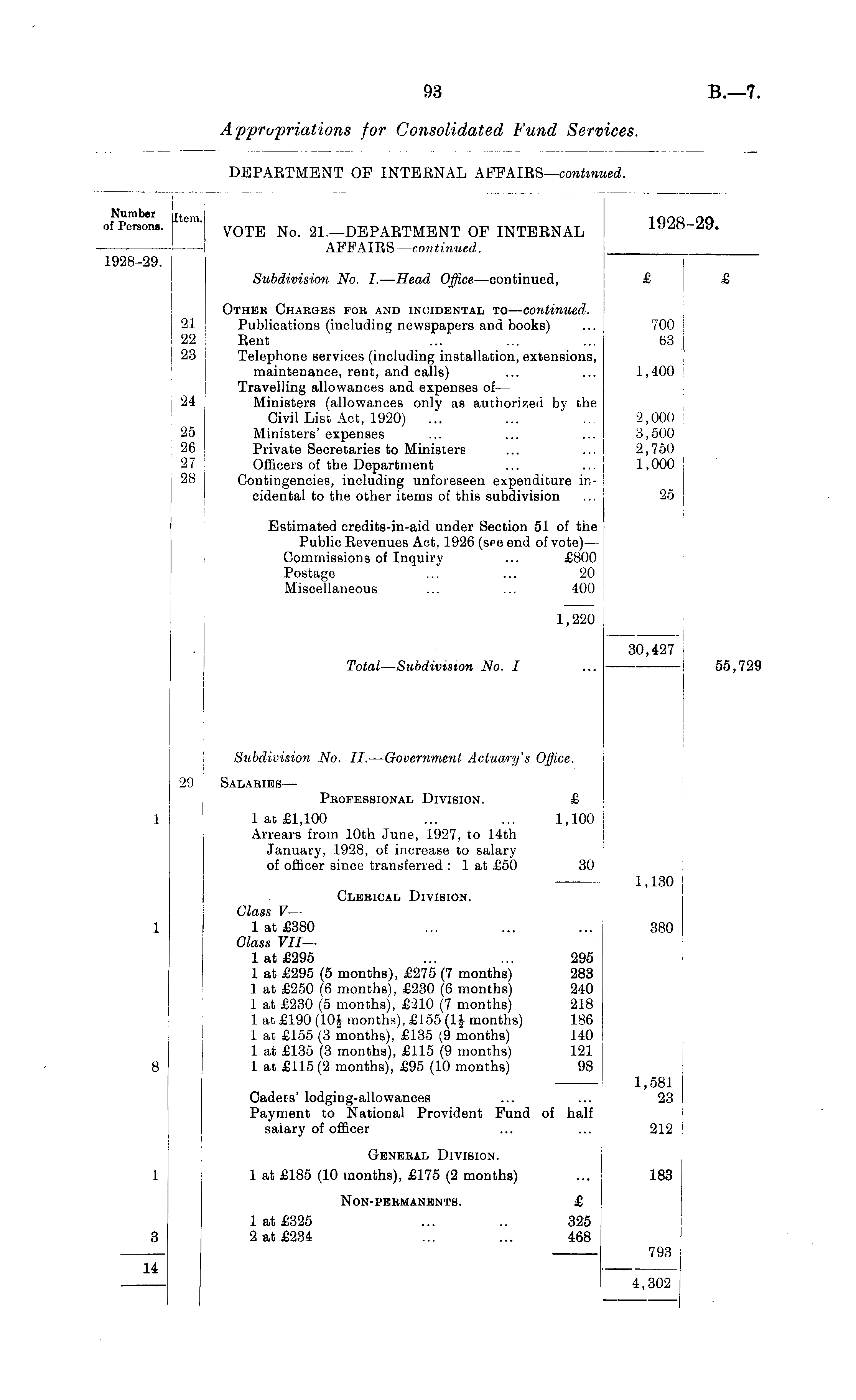 Number [t e m. i Q9R_9Q Of Persons. VOTE No. 21.—DEPARTMENT OF INTERNAL ' 1 AFFAIRS —continued. 1928-29. Subdivision No. I.—Head Office —continued, £ £ Other Charges for and incidental to —continued. 21 Publications (including newspapers and books) ... 700 22 Rent ... ... ... 63 I 23 Telephone services (including installation, extensions, maintenance, renc, and calls) ... ... 1,400 ! Travelling allowances and expenses of— 24 Ministers (allowances only as authorized by the Civil List Act, 1920) ... ... ... 2,000 25 Ministers' expenses ... ... ... 3,500 26 Private Secretaries to Ministers ... ... 2,750 27 Officers of the Department ... ... 1,000 28 Contingencies, including unforeseen expenditure incidental to the other items of this subdivision ... 25 Estimated credits-in-aid under Section 51 of the Public Revenues Act, 1926 (see end of vote) — Commissions of Inquiry ... £800 Postage ... ... 20 Miscellaneous ... ... 400 1,220 30,427 Total—Subdivision No. I ... — 55,729 Subdivision No. II.—Government Actuary's Office. 29 SalariesProfessional Division. £ 1 1 at £1,100 ... ... 1,100 Arrears from 10th June, 1927, to 14th January, 1928, of increase to salary of officer since transferred : 1 at £50 30 1,130 Clerical Division. Glass V— 1 1 at £380 ... ... ... 380 Glass VII— 1 at £295 ... ... 295 1 at £295 (5 months), £275 (7 months) 283 1 at £250 (6 months), £230 (6 months) 240 1 at £230 (5 months), £'210 (7 months) 218 1 at £190 (10J months), £155 (1-J- months) 186 1 at £155 (3 months), £135 (9 months) 140 1 at £135 (3 months), £115 (9 months) 121 8 1 at £115(2 months), £95 (10 months) 98 1,581 Cadets' lodging-allowances ... ... 23 Payment to National Provident Fund of half salary of officer ... ... j 212 General Division. 1 1 at £185 (10 months), £175 (2 months) ... 183 Non-permanents. £ 1 at £325 ... .. 325 3 2 at £234 ... ... 468 —— ; 793 14 : 4,302