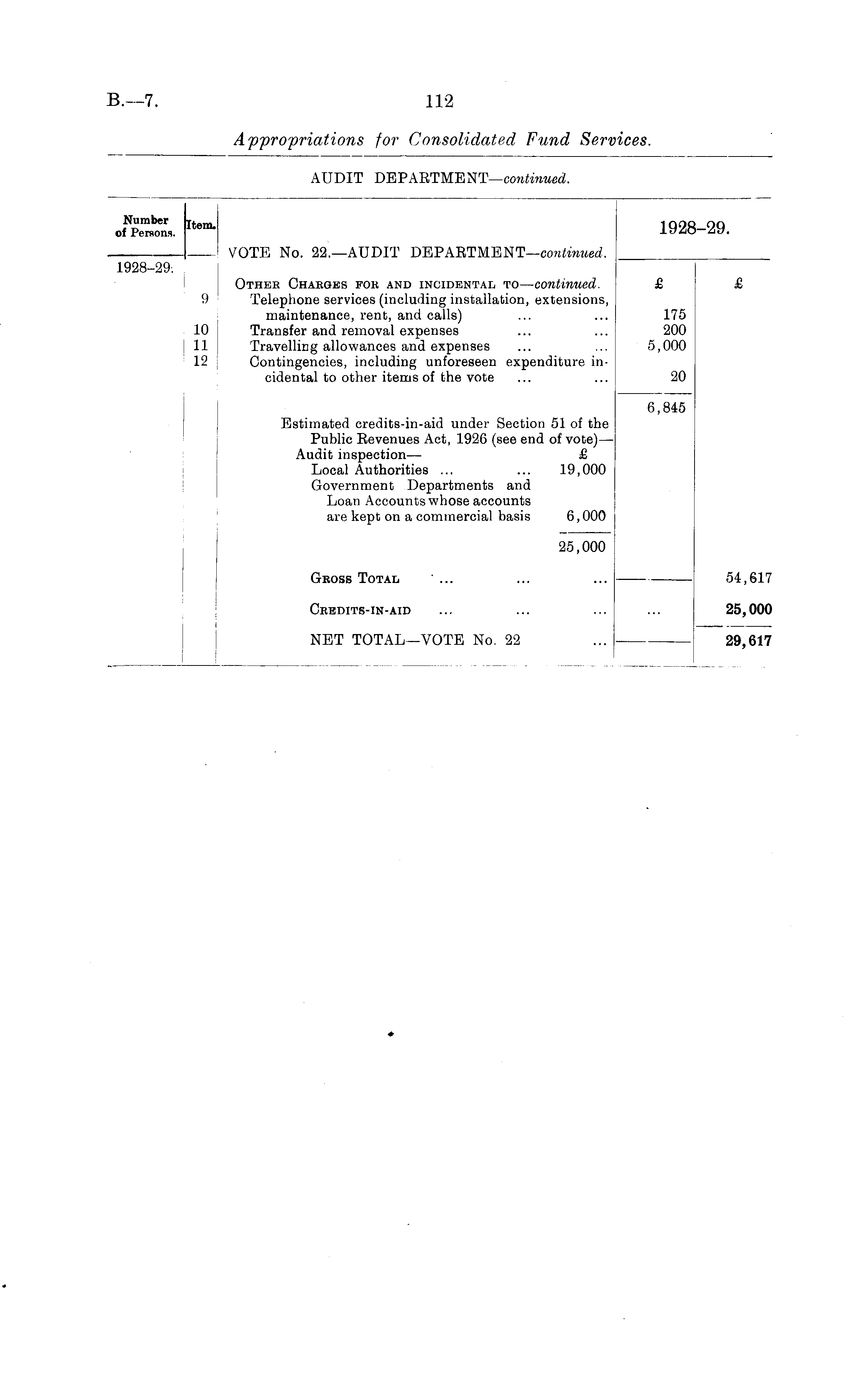 of N pe™ b o e „ r s. rtera - 1928-29. VOTE No. 22.—AUDIT DEPARTMENT—continued. __ 1928-29: Other Charges for and incidental to —continued. £ £ 9 { Telephone services (including installation, extensions, maintenance, rent, and calls) ... ... 175 I 10 I Transfer and removal expenses ... ... 200 11 j Travelling allowances and expenses ... ... 5,000 12 ! Contingencies, including unforeseen expenditure incidental to other items of the vote ... ... 20 6,845 Estimated credits-in-aid under Section 51 of the Public Revenues Act, 1926 (see end of vote) — Audit inspection— £ Local Authorities ... ... 19,000 Government Departments and Loan Accounts whose accounts are kept on a commercial basis 6,000 25,000 Gross Total ... ... ... 54,617 Credits-in-aid ... ... ... ... 25,000 NET TOTAL—VOTE No. 22 ... 29,617