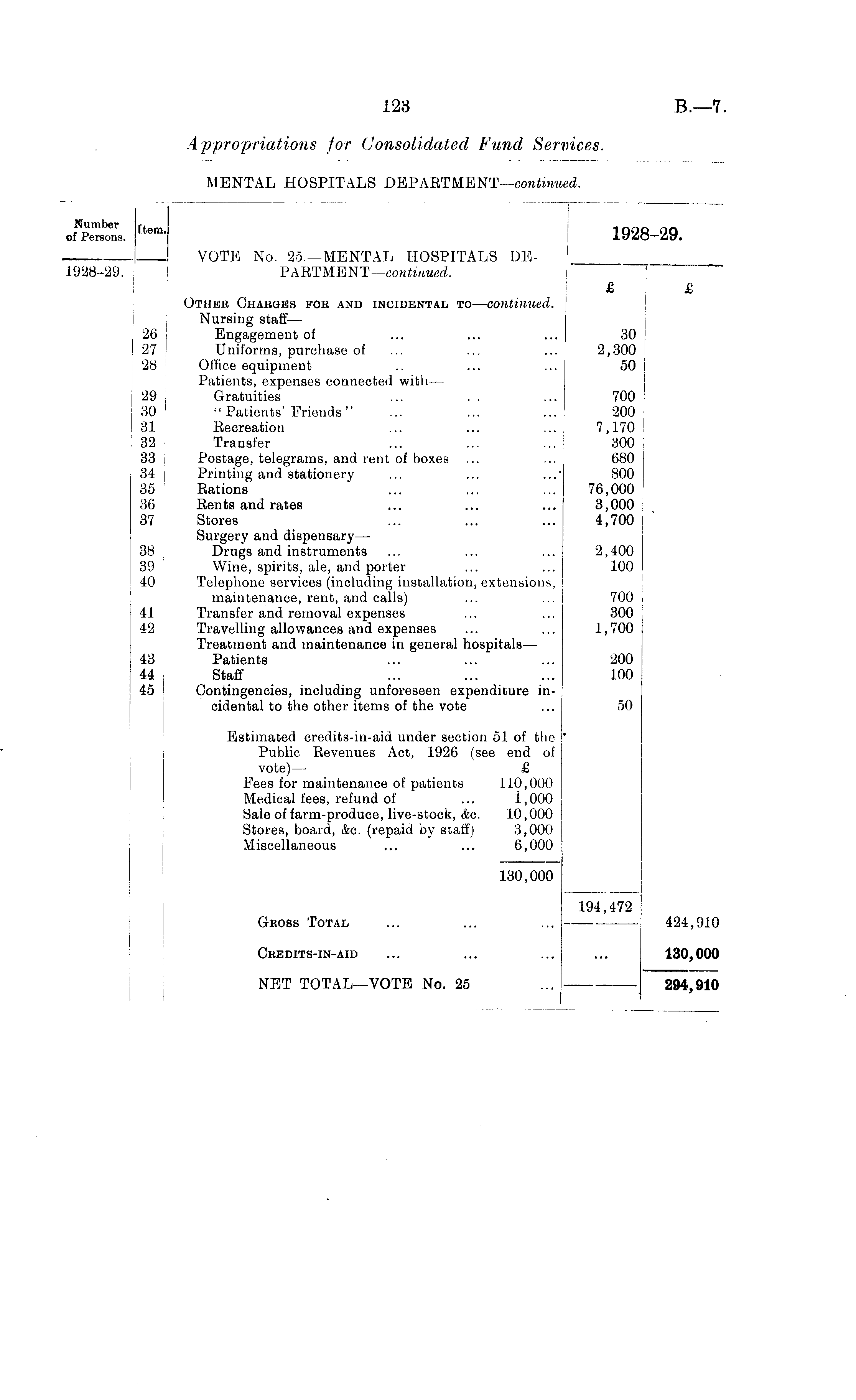 ofCons. Item " 1928-29. VOTE No. 25.—MENTAL HOSPITALS DE-1928-29. ! PARTMENT—continued. £ £ Other Charges for and incidental to —continued. Nursing staff— 1 26 Engagement of ... ... ... 30 27 J Uniforms, purchase of ... ... ... 2,300 28 ' Office equipment .. ... ... 50 Patients, expenses connected with— [ 29 I Gratuities ... . . ... 700 j 30 ! " Patients' Friends" ... ... ... 200 31 | Eecreation ... ... ... 7,170 j 32 ! Transfer ... ... ... 300 33 j Postage, telegrams, and rent of boxes ... ... 680 34 | Printing and stationery ... ... ...' 800 35 Rations ... ... ... 76,000 36 Rents and rates ... ... ... 3,000 37 Stores ... ... ... 4,700 Surgery and dispensary— 38 J Drugs and instruments ... ... ... 2,400 39 ' Wine, spirits, ale, and porter ... ... 100 40 j Telephone services (including installation, extensions, maintenance, rent, and calls) ... ... 700 [ 41 i Transfer and removal expenses ... ... 300 42 j Travelling allowances and expenses ... ... 1,700 Treatment and maintenance in general hospitals— 43 Patients ... ... ... 200 44 Staff ... ... ... 100 45 Contingencies, including unforeseen expenditure incidental to the other items of the vote ... 50 Estimated credits-in-aid under section 51 of the * Public Revenues Act, 1926 (see end of vote) — £ Eees for maintenance of patients 110,000 Medical fees, refund of ... i,000 Sale of farm-produce, live-stock, &c. 10,000 Stores, board, &c. (repaid by staff) 3,000 Miscellaneous ... ... 6,000 130,000 194,472 GROSS Total ... ... ... — 424,910 Credits-in-aid ... ... ... ... 130,000 NET TOTAL—VOTE No. 25 ... 294,910